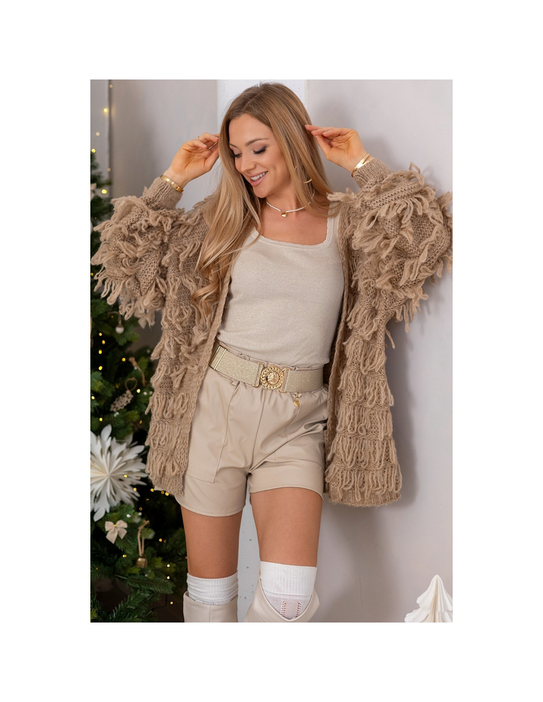 Piękny, owersizowy kardigan , nie posiada zapięcia, rękawki obniżone ze ściągaczami. Odstające frędzelki, ciepły i milutki w dotyku.