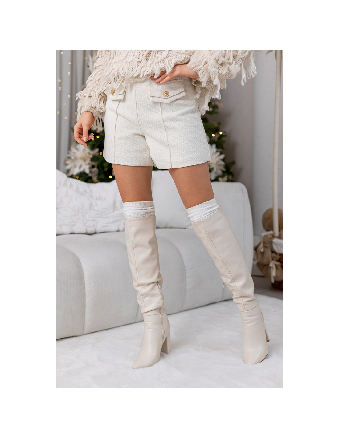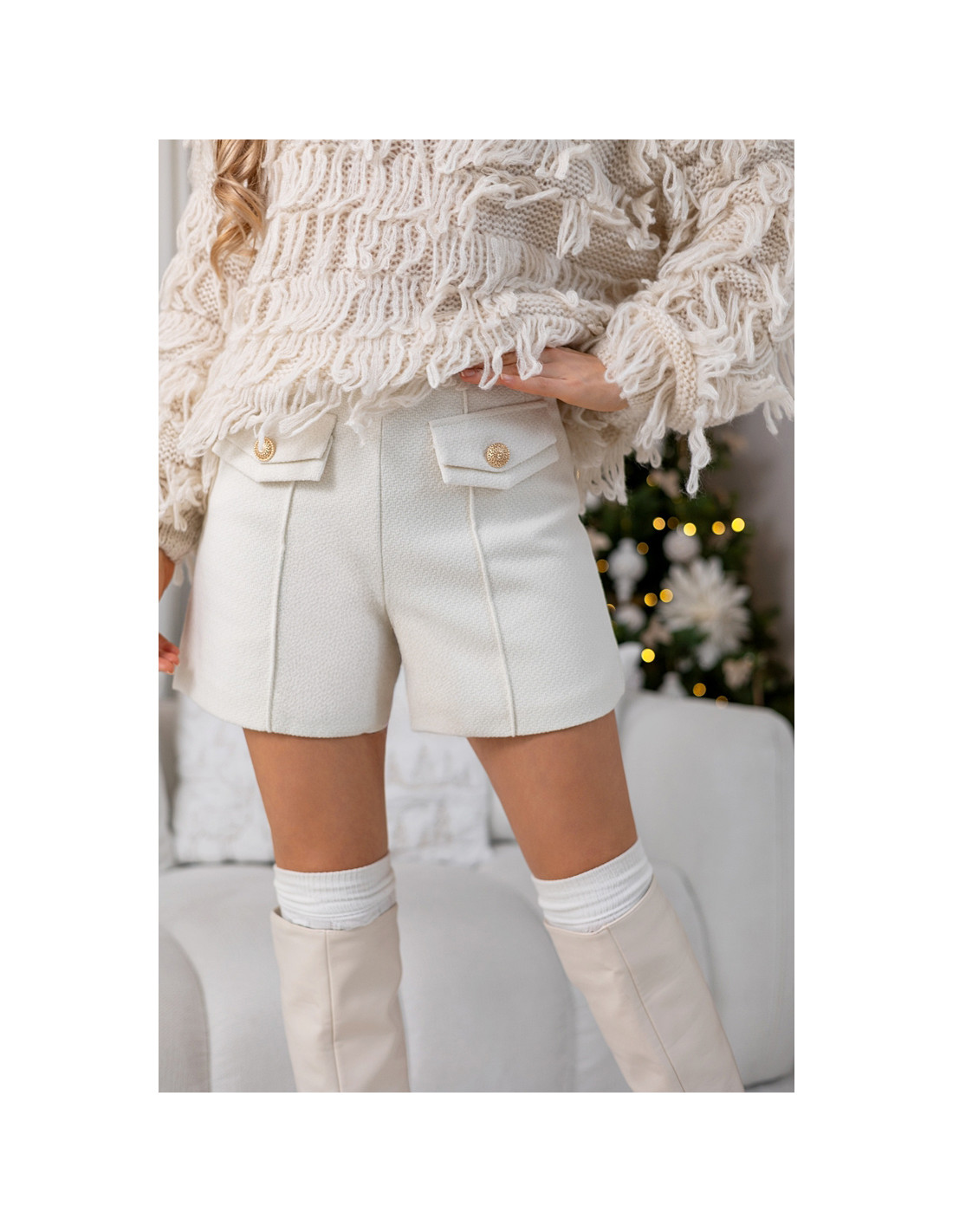 Eleganckie szorty z wysokim stanem, zapinane na kryty zamek. Z przodu zaszewki i patki z ozdobnymi złotymi guzikami.