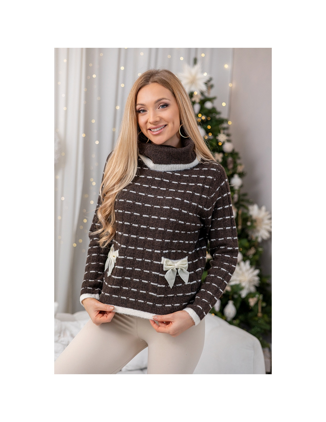 Miękki i przyjemny w dotyku sweter o ponadczasowym wzorze, idealny na chłodniejsze dni. Luźny krój zapewnia komfort, a golf dodaje mu przytulnego, zimowego charakteru. Drobne, równomierne paski nadają całości lekkości, a ozdobna kokardka przy dole swetra wprowadza subtelny  akcent. Model świetnie komponuje się zarówno z klasycznymi spodniami, jak i bardziej eleganckimi stylizacjami, tworząc ciepły i stylowy look na co dzień oraz na wyjątkowe okazje.