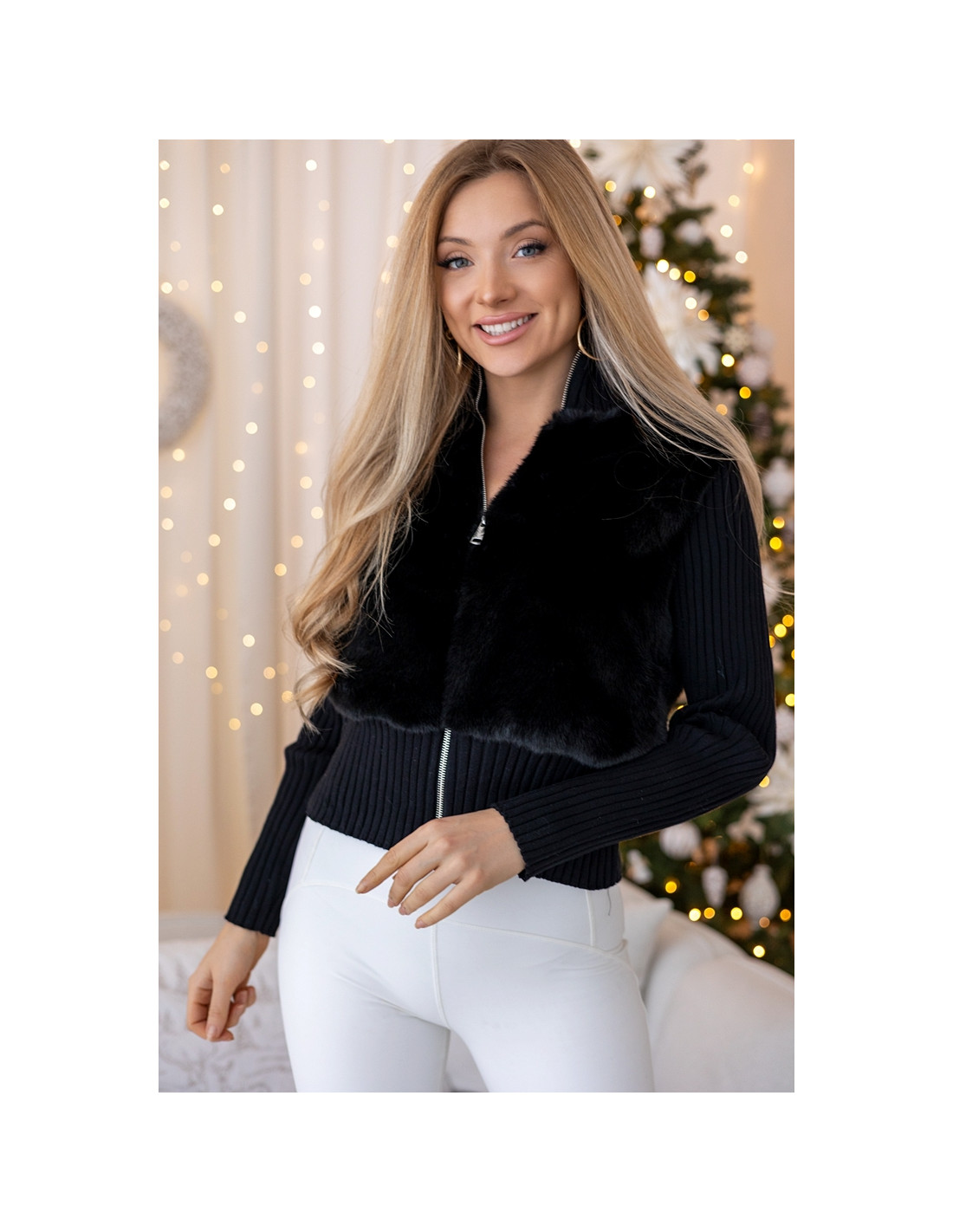 Stylowa bluza o wyjątkowo miękkiej, futerkowej górnej części, która nadaje jej luksusowego, zimowego charakteru. Dolna część oraz rękawy wykonane są z elastycznego, prążkowanego materiału, który pięknie dopasowuje się do sylwetki i zapewnia komfort noszenia. Model posiada wygodny zamek błyskawiczny oraz stójkę, idealną na chłodniejsze dni. To idealne połączenie elegancji i wygody — świetnie sprawdzi się zarówno w codziennych stylizacjach, jak i bardziej dopracowanych, świątecznych zestawach.