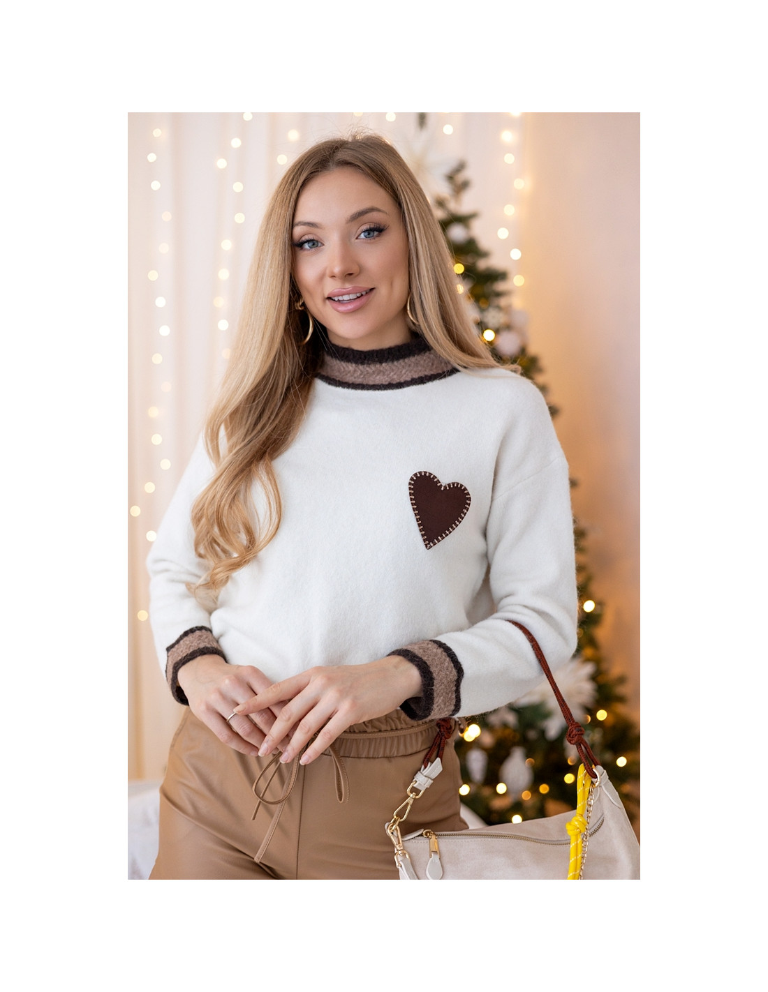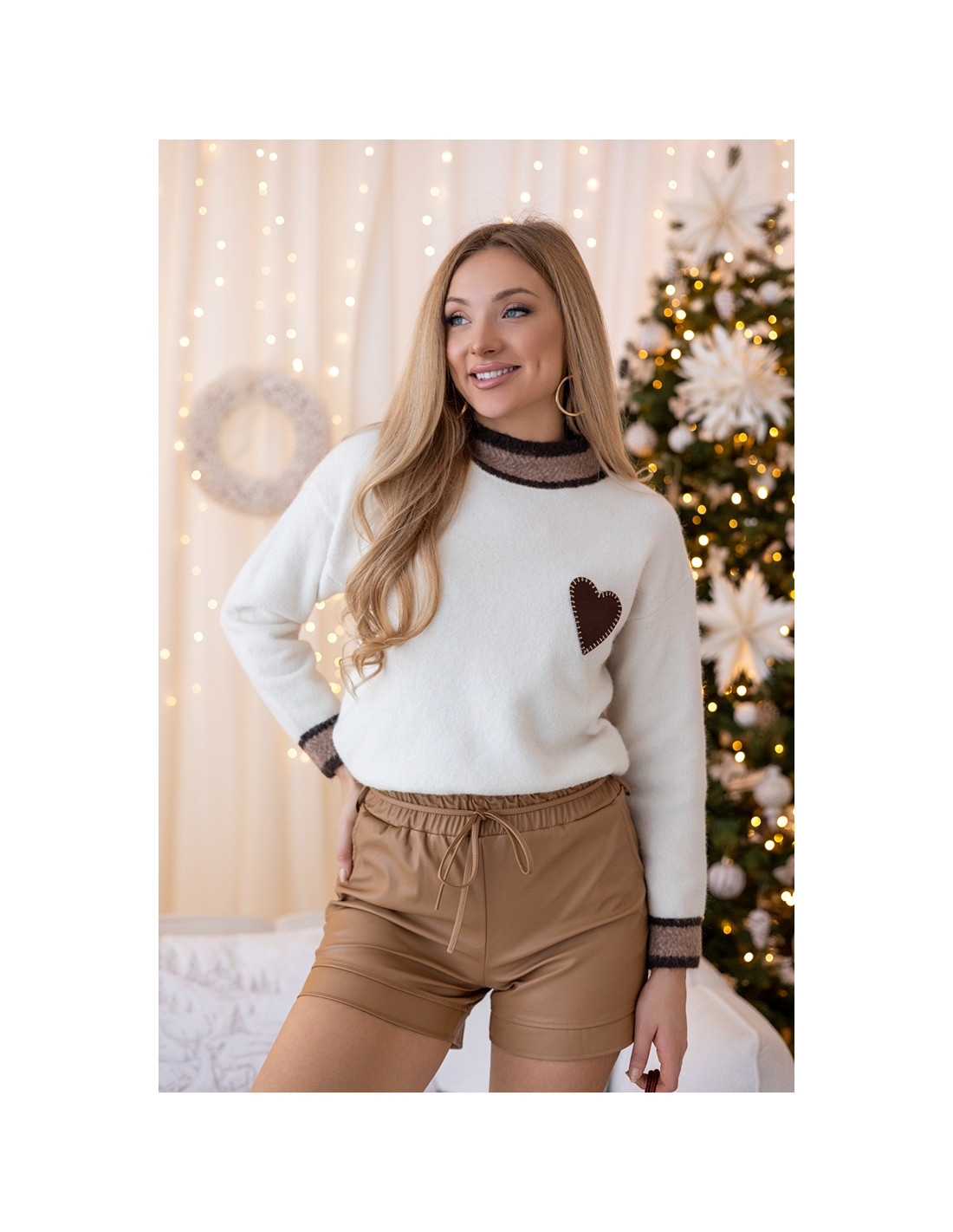Uroczy i wyjątkowo miękki sweter w odcieniu ciepłej bieli, wykończony kontrastowymi brązowymi detalami przy mankietach i kołnierzu. Model ozdobiono naszywanym sercem o ręcznie wykończonej krawędzi, które dodaje mu dziewczęcego, przytulnego charakteru. Sweter jest niezwykle wygodny, nie gryzie i świetnie układa się na sylwetce, dzięki czemu sprawdzi się zarówno na co dzień, jak i w bardziej stylizowanych, zimowych zestawach. Idealny wybór dla kobiet, które kochają modę pełną ciepła i subtelnych akcentów.