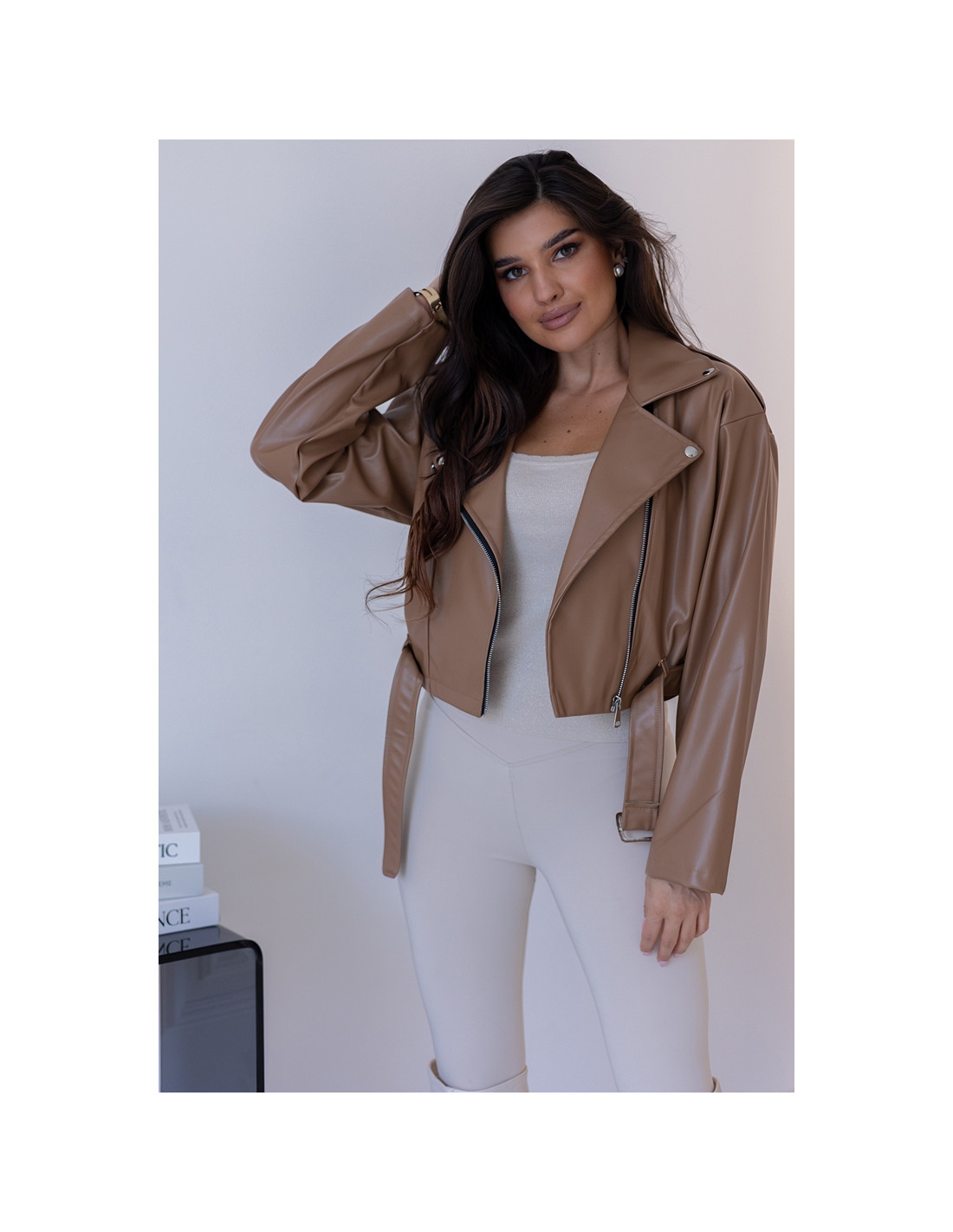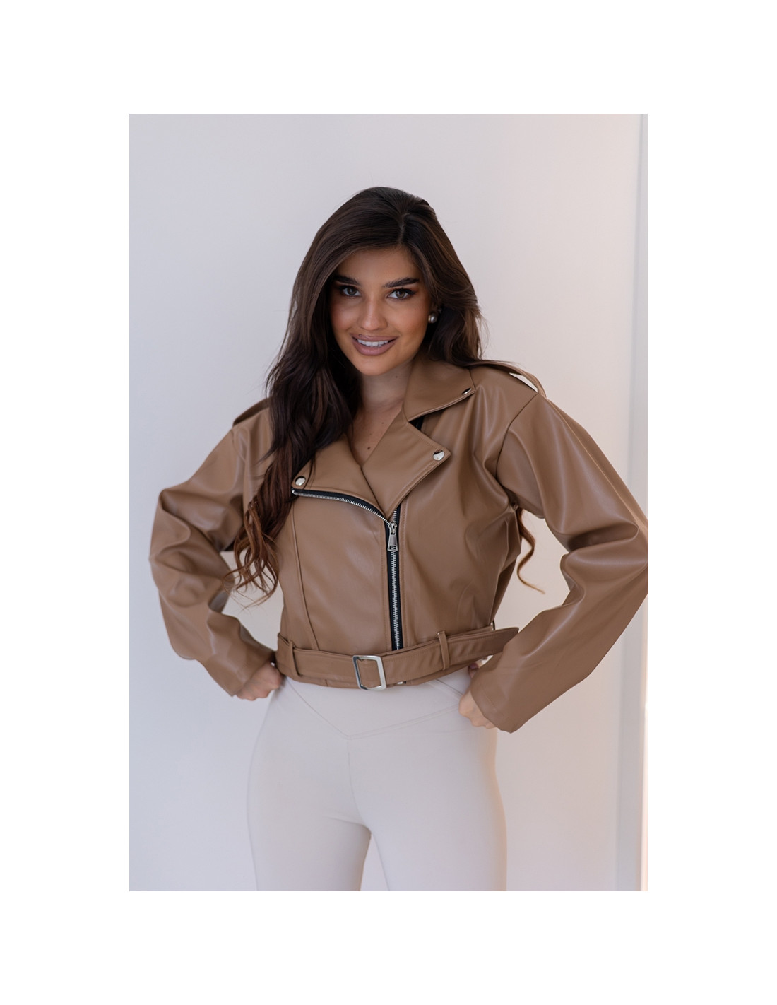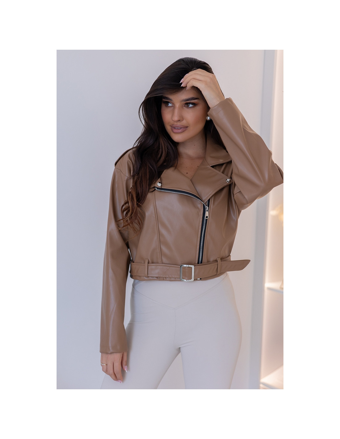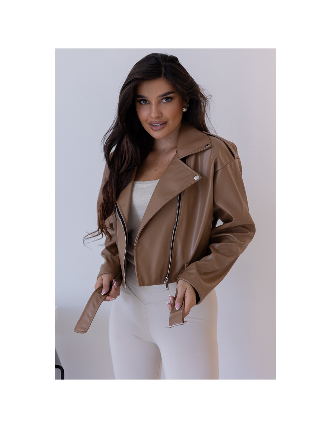 Kurtka ramoneska z eko skayu, zasuwana na srebrny zamek. Rękawki obniżone, w tali pasek, którym można taliować kurtkę. Nie posiada podszewki.
