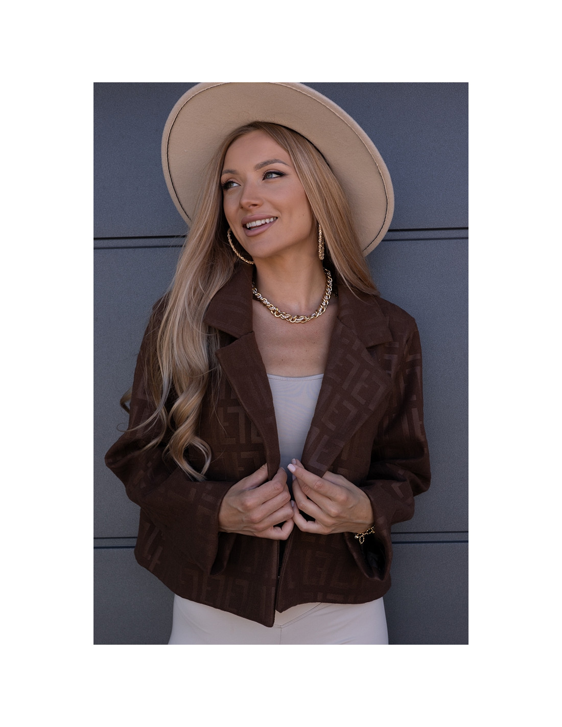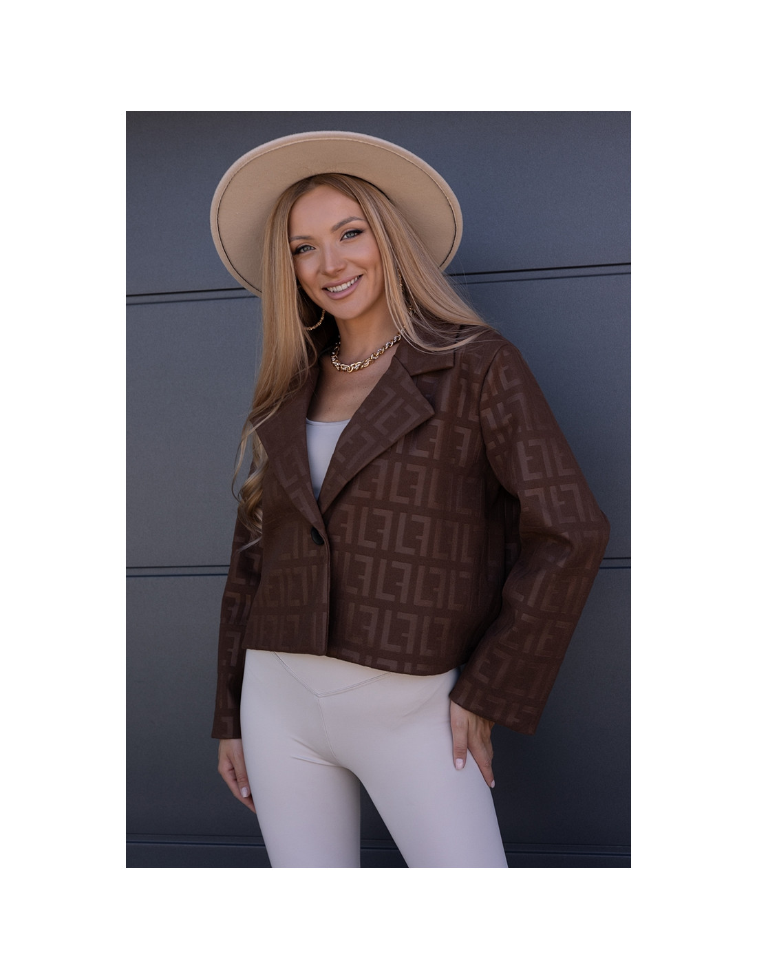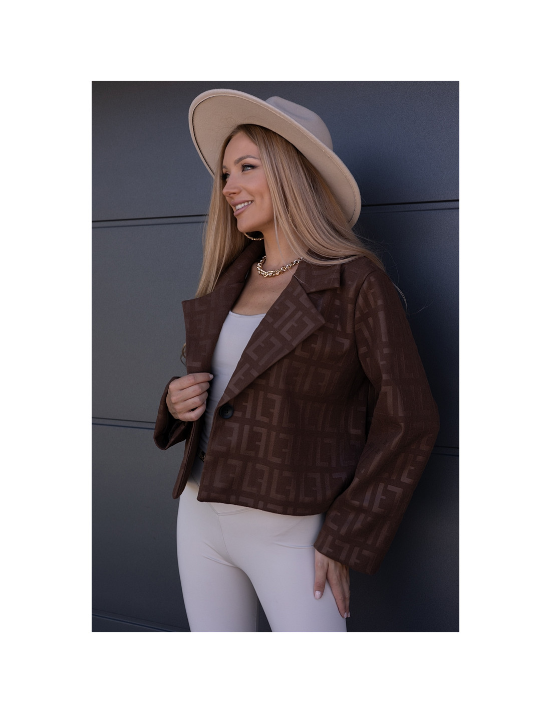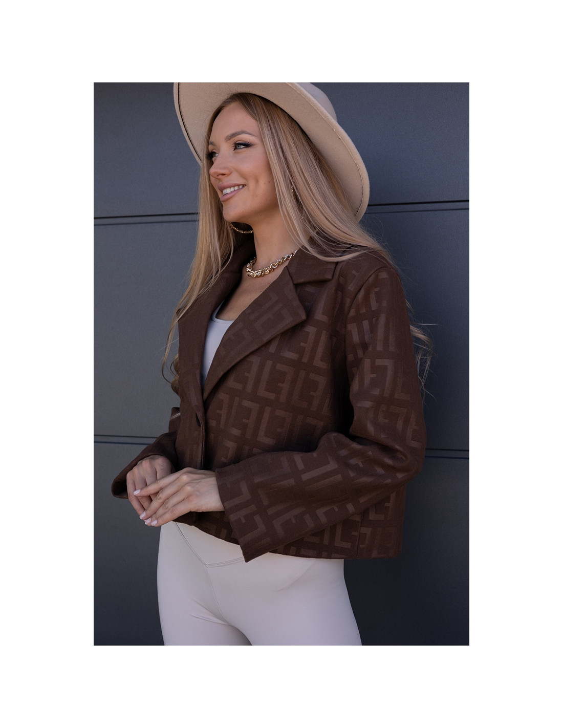 Kurtka żakietowa we wzory, zapinana na jeden guzik. Wszyte gąbki na ramionach. Model owersizowy.