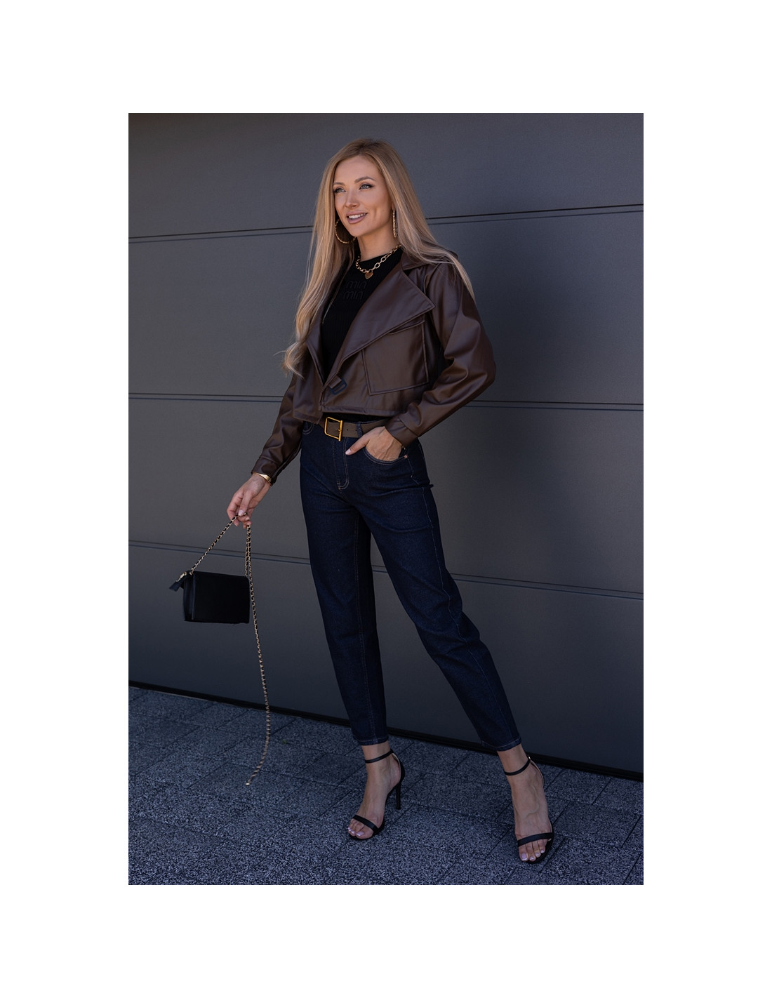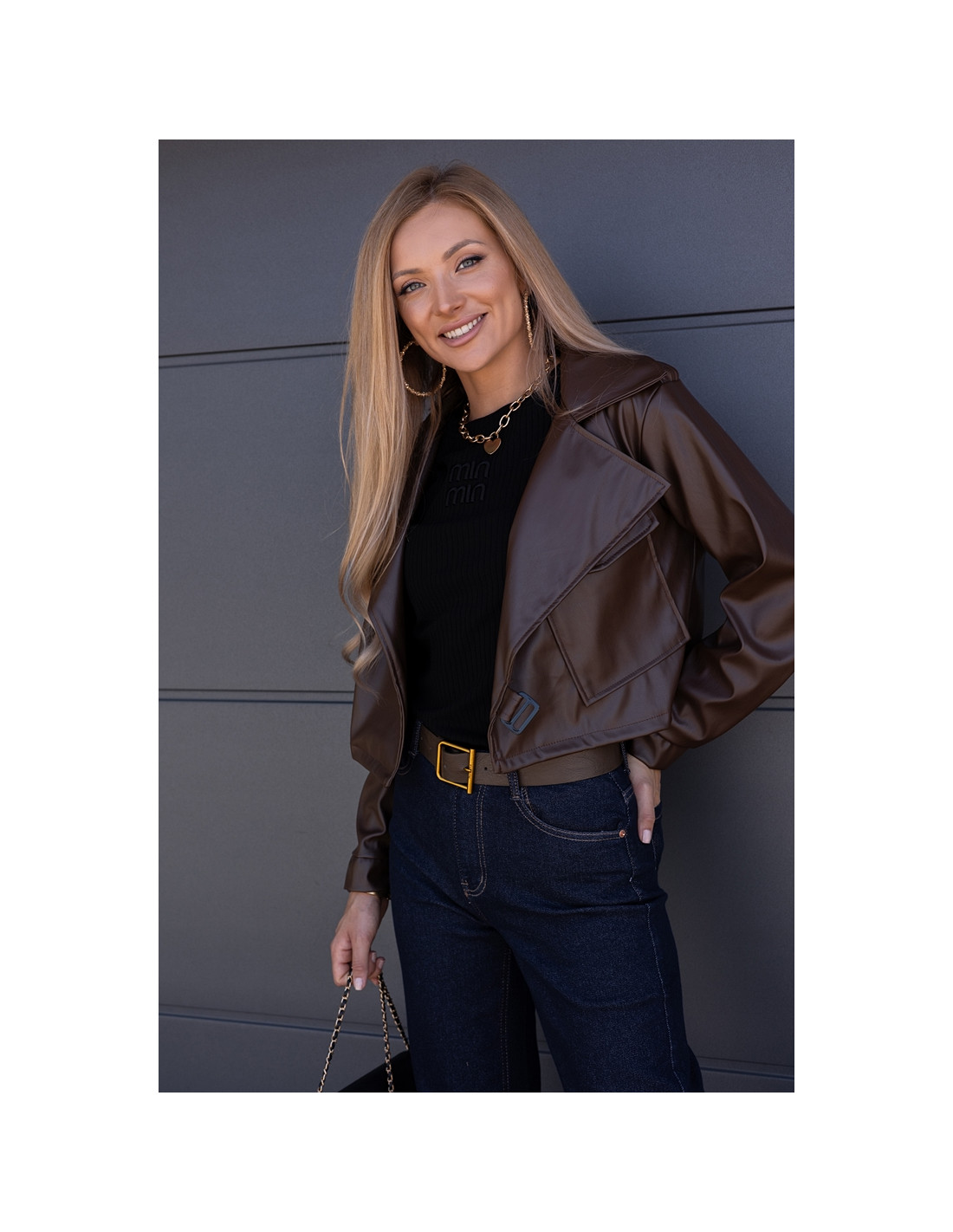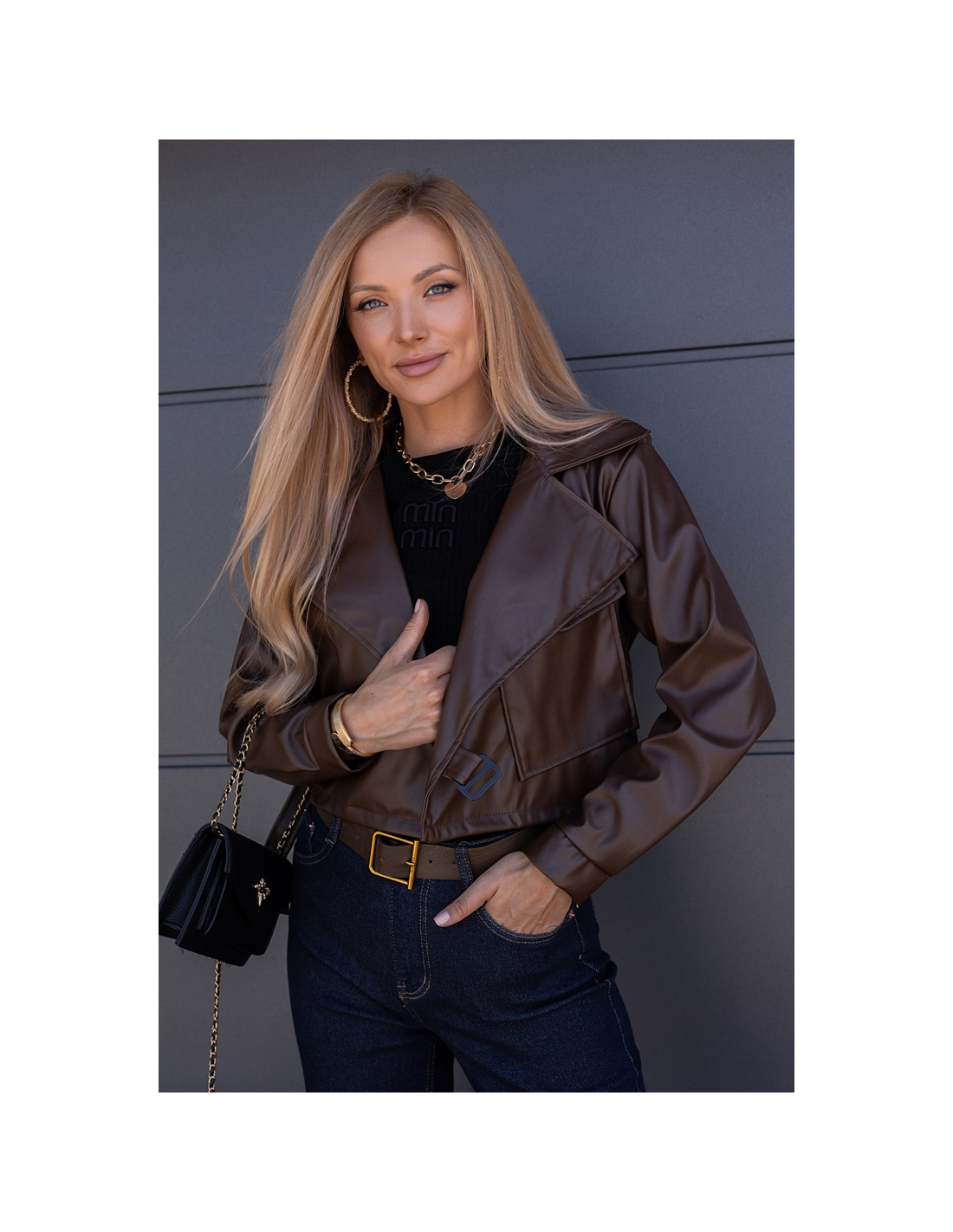 Kurtka ramoneska z ekoskayu. Na ramionach pagony, zapięcie po skosie. Naszyta duża, ozdobna kieszeń. Rękawki zapinane na guzik. Kurtka nie posiada podszewki.