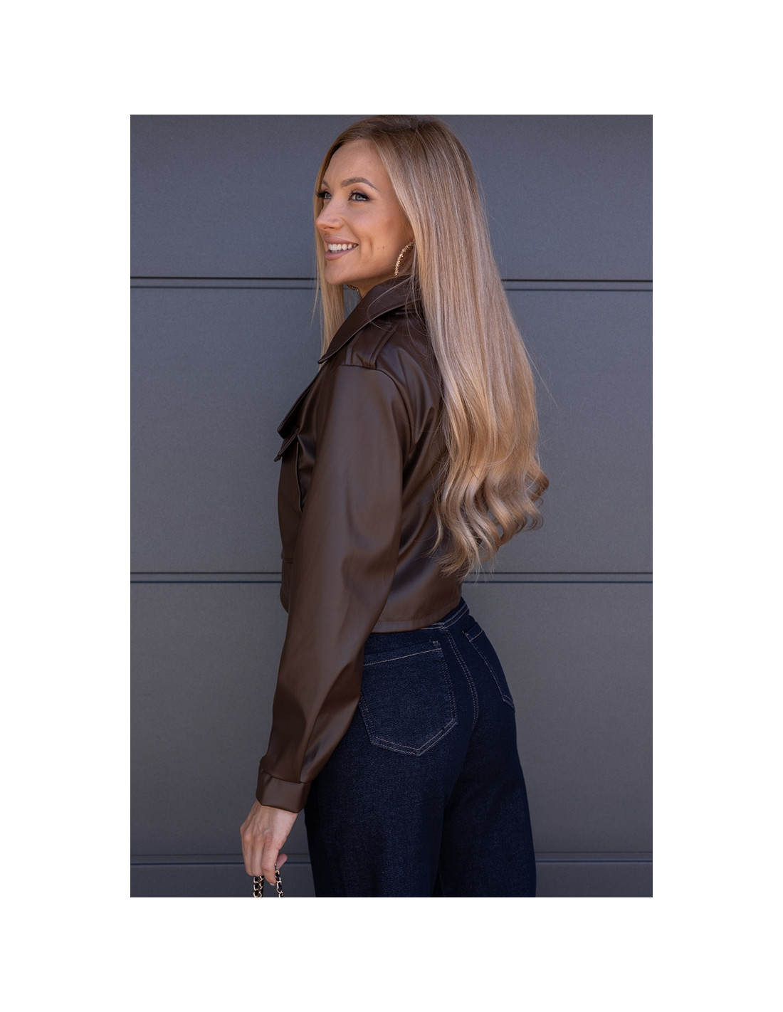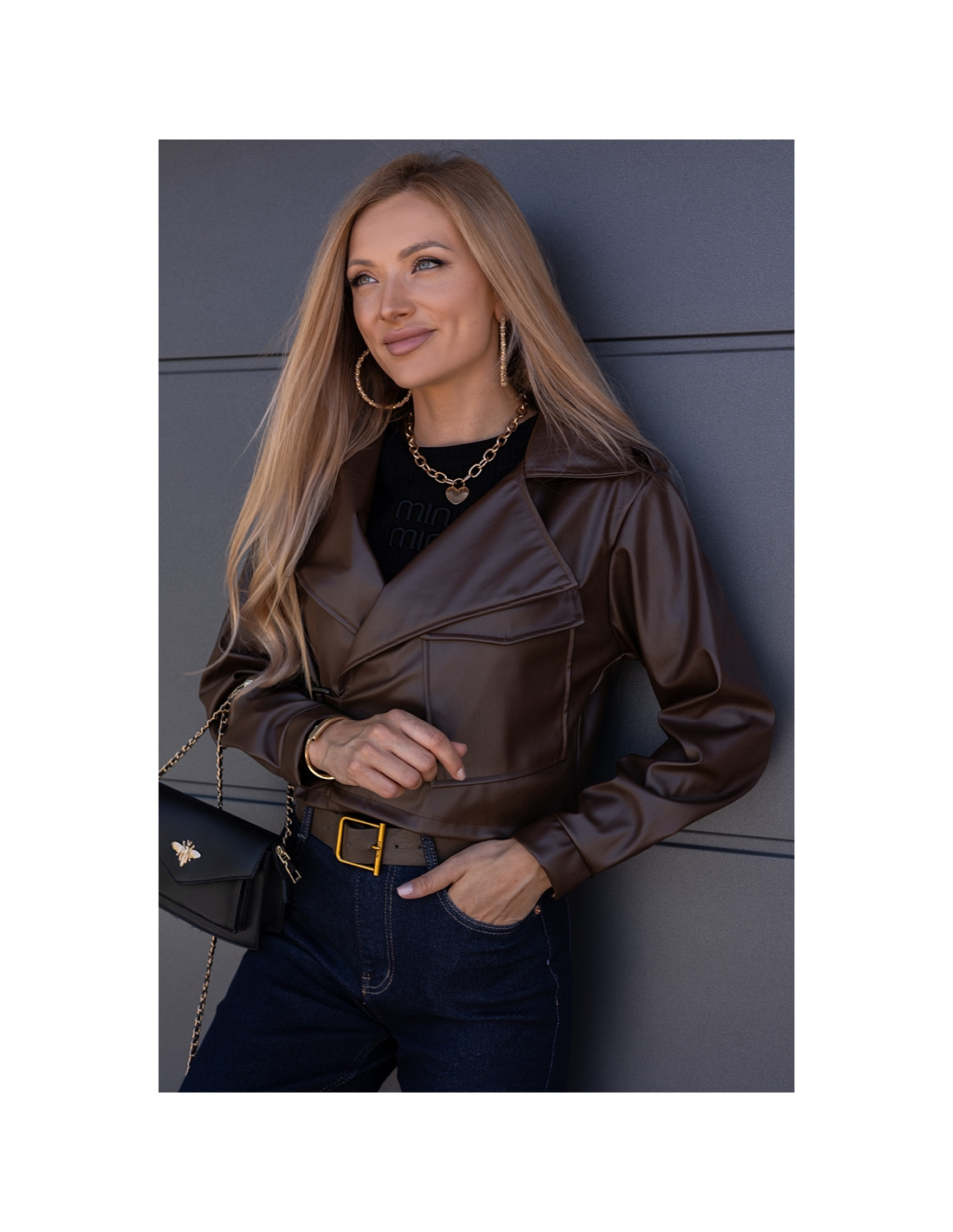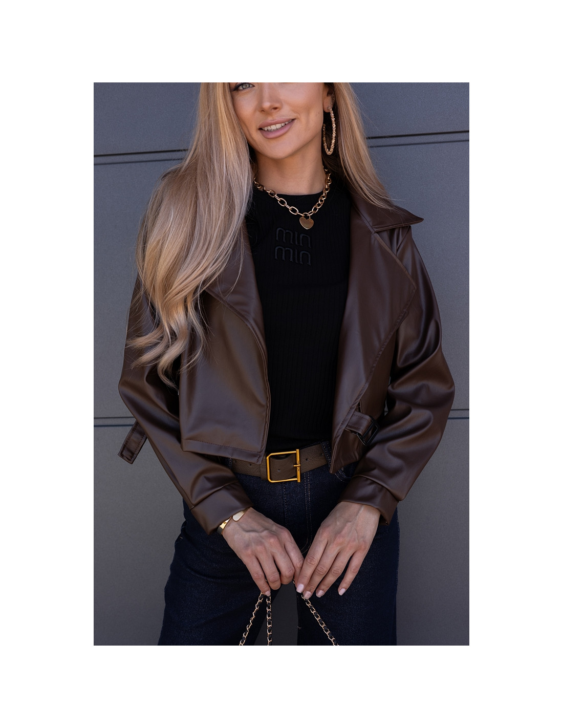 Kurtka ramoneska z ekoskayu. Na ramionach pagony, zapięcie po skosie. Naszyta duża, ozdobna kieszeń. Rękawki zapinane na guzik. Kurtka nie posiada podszewki.