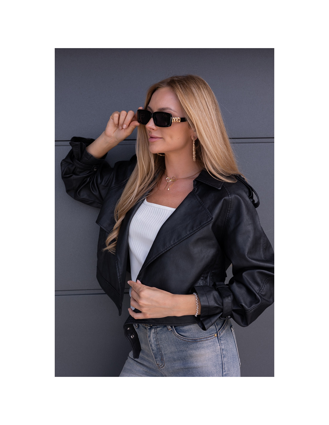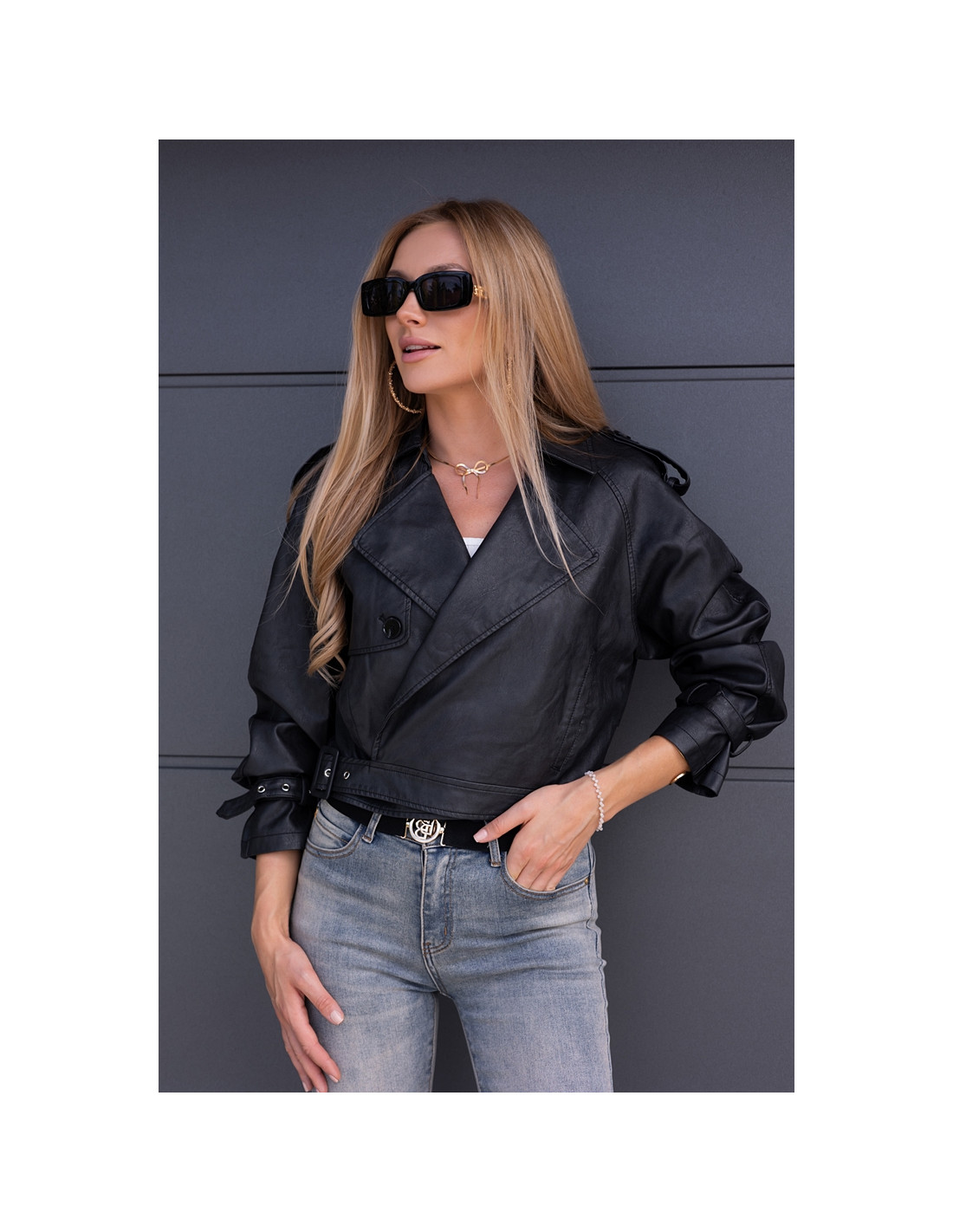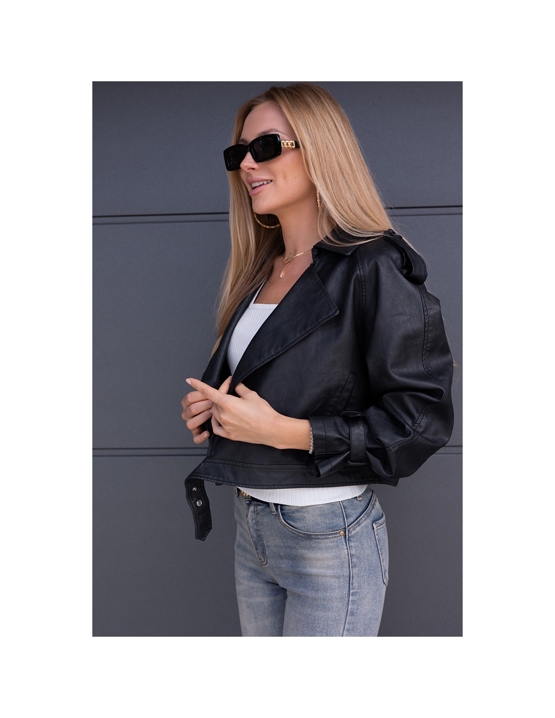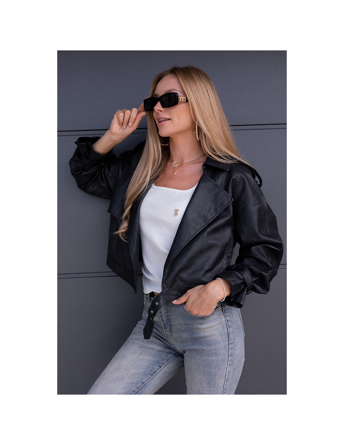 Kurtka z Eko skayu o modnym kroju. Szersza w ramionach, rękawki obniżane, zakończone ściągaczami. Zapinana na guziki paseczek, zapinana po skosie.