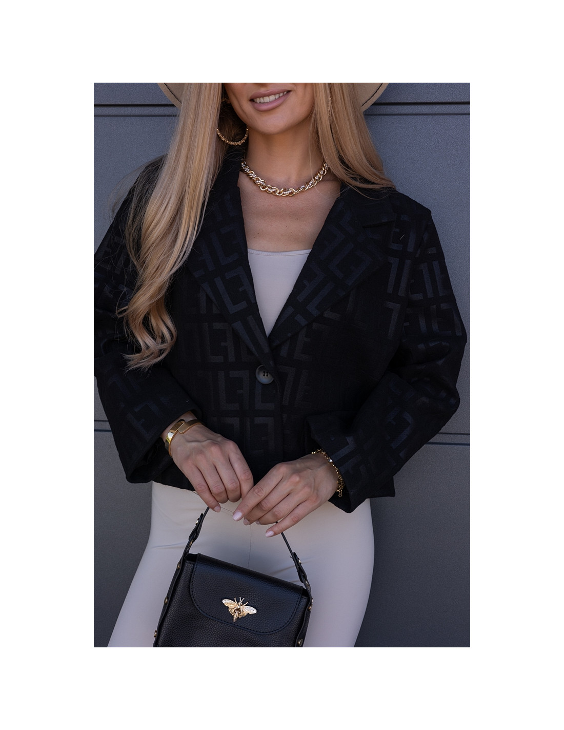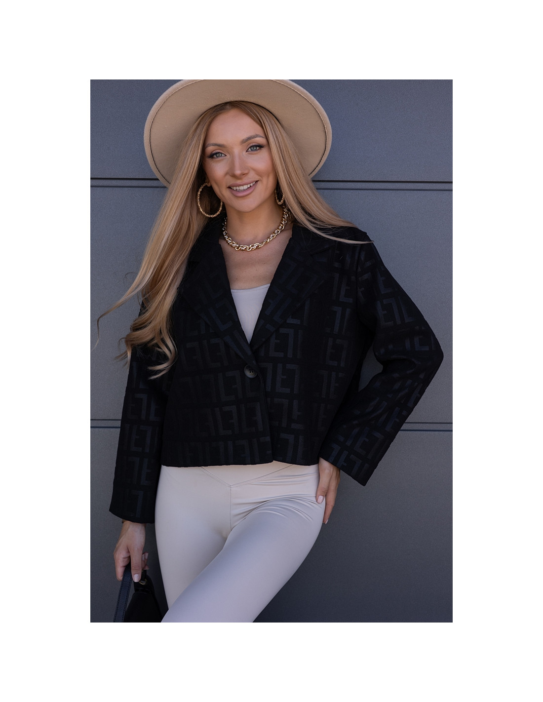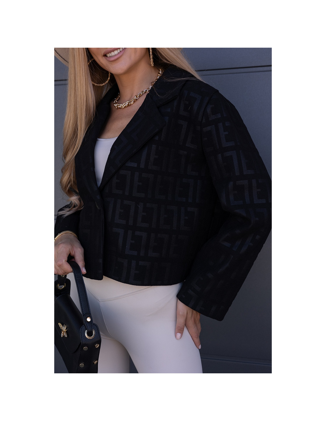 Kurtka żakietowa we wzory, zapinana na jeden guzik. Wszyte gąbki na ramionach. Model owersizowy.