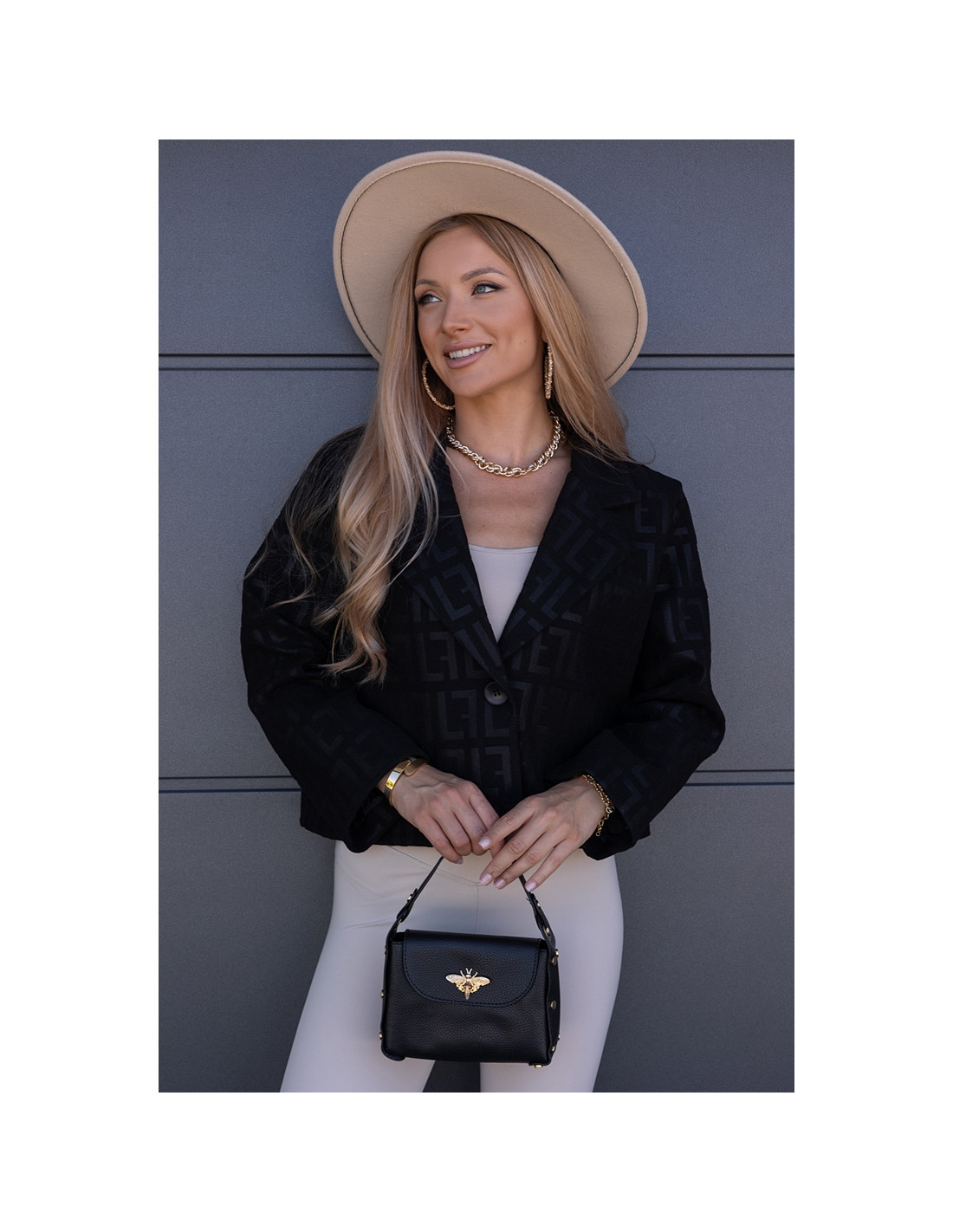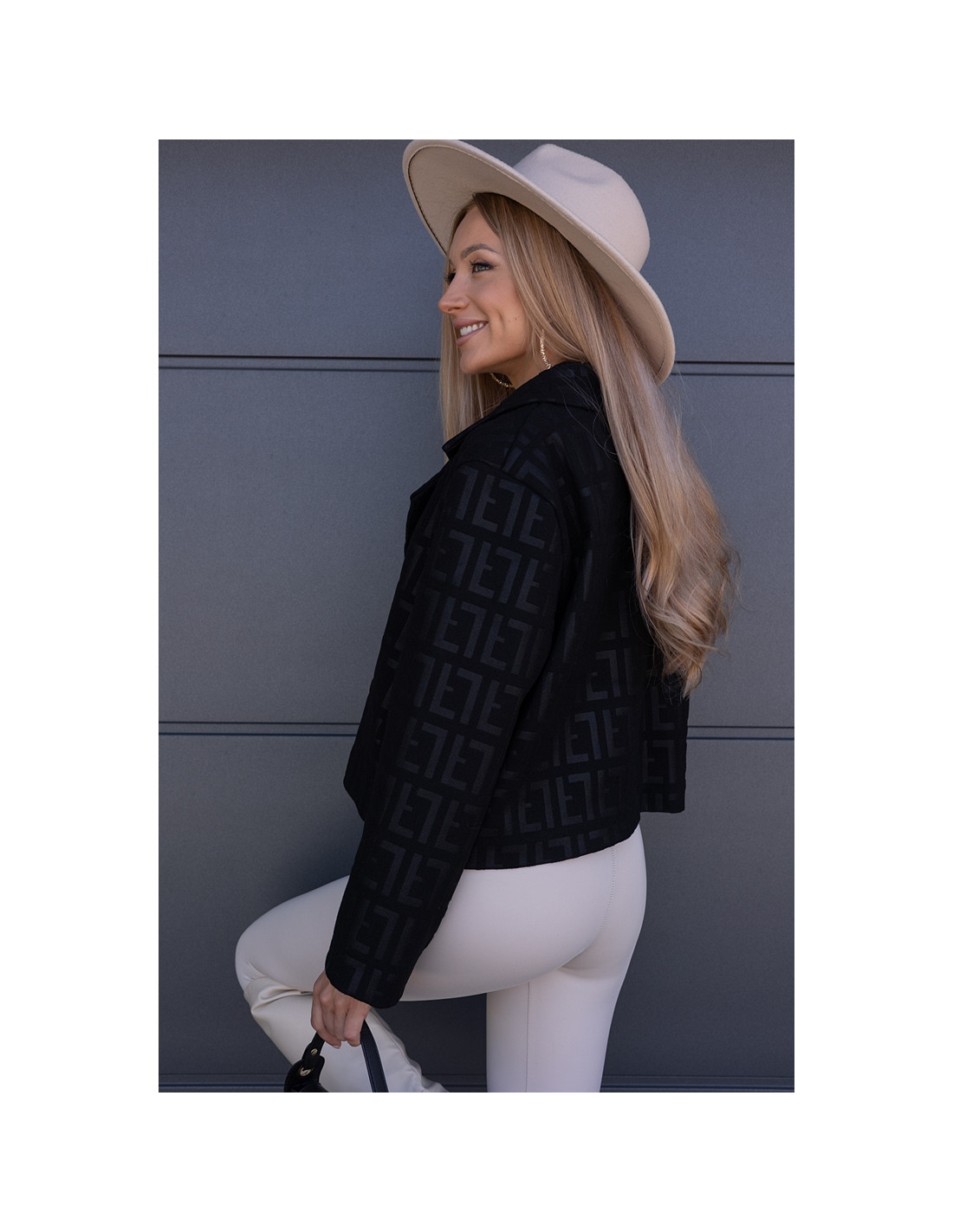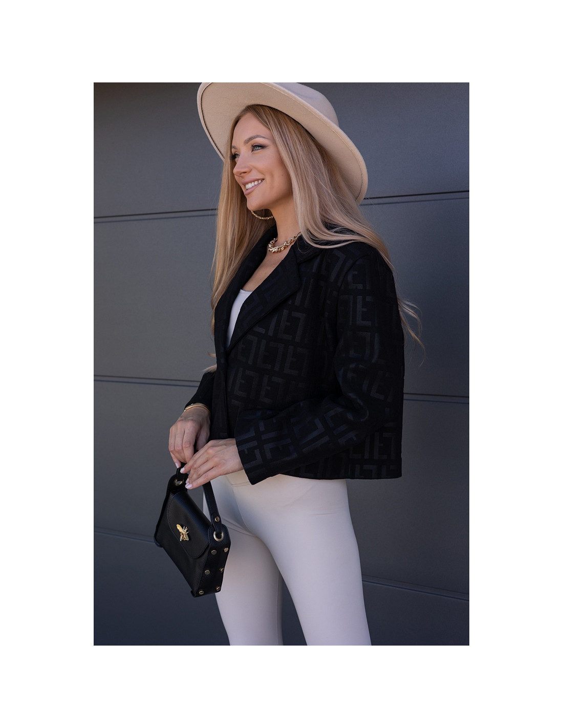 Kurtka żakietowa we wzory, zapinana na jeden guzik. Wszyte gąbki na ramionach. Model owersizowy.