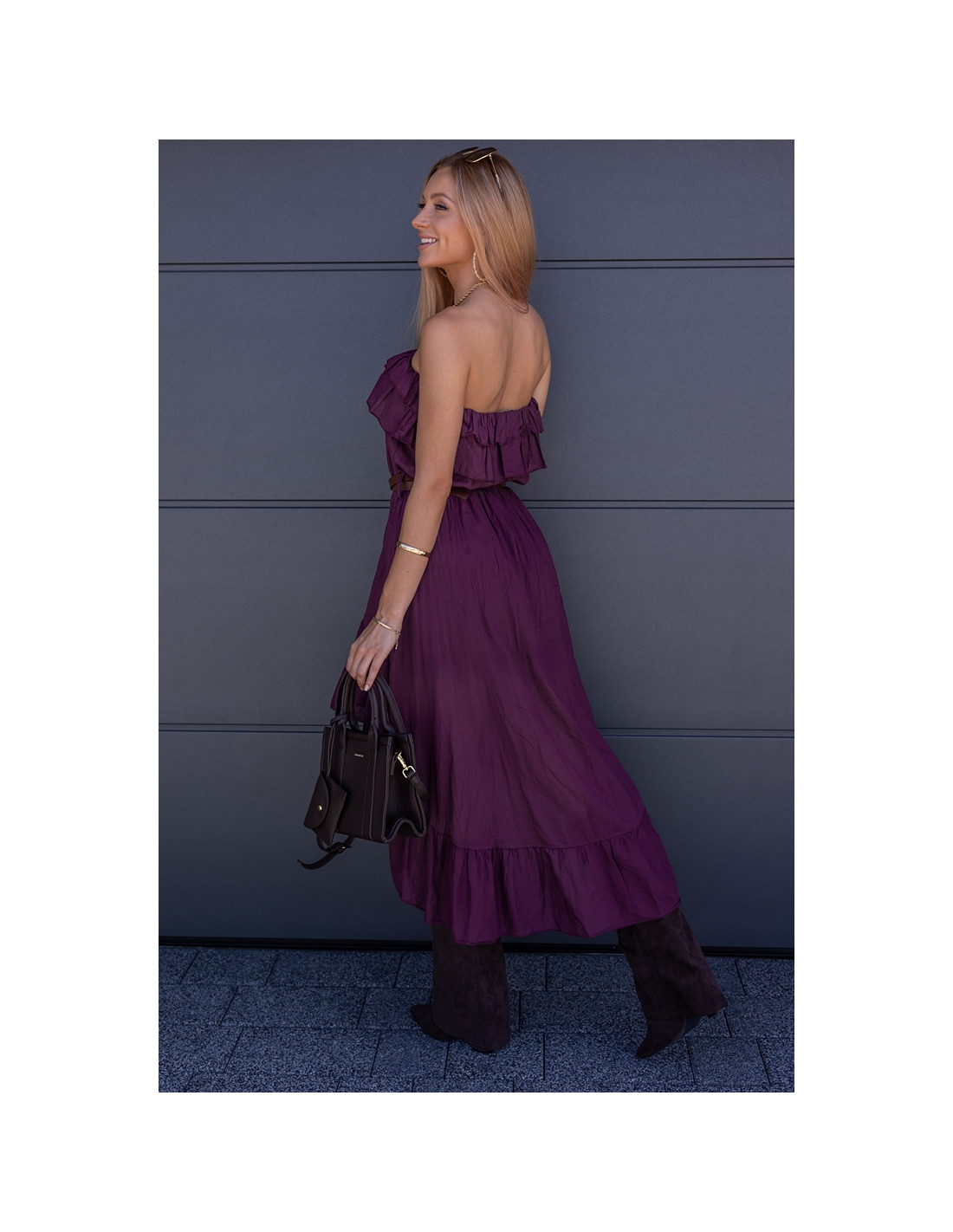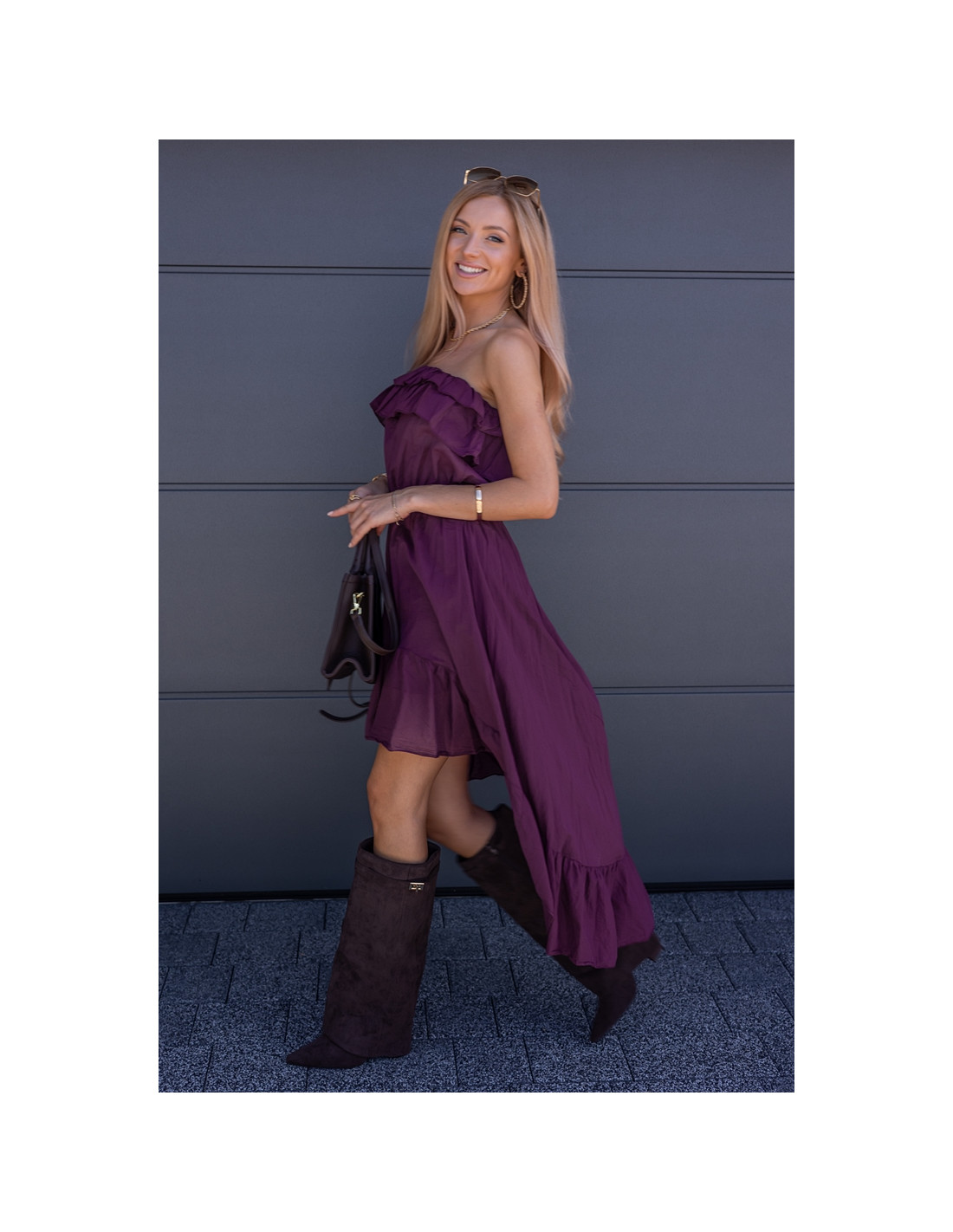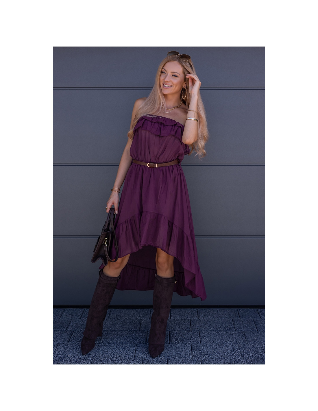 Sukienka hiszpanka z krótszym przodem i przedłużonym tyłem. Piękny, zwiewny materiał, posiada podszewkę. W zestawie pasesk.
