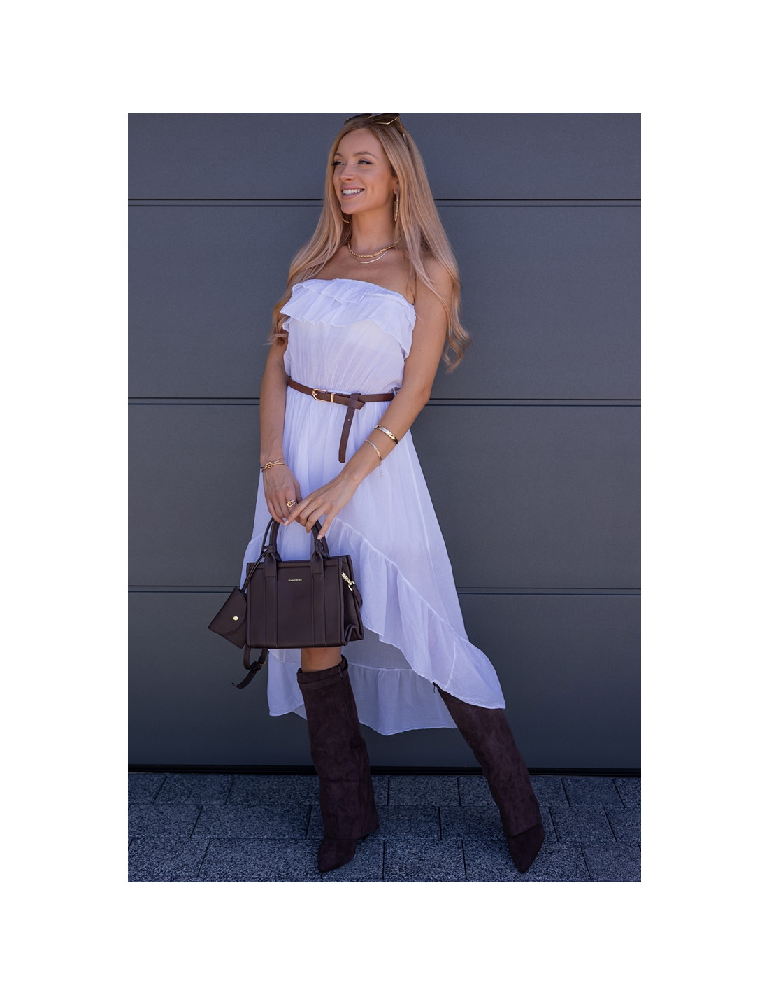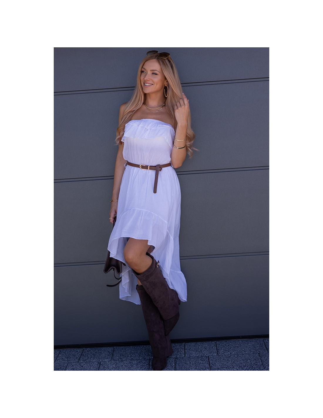 Sukienka hiszpanka z krótszym przodem i przedłużonym tyłem. Piękny, zwiewny materiał, posiada podszewkę. W zestawie pasesk.