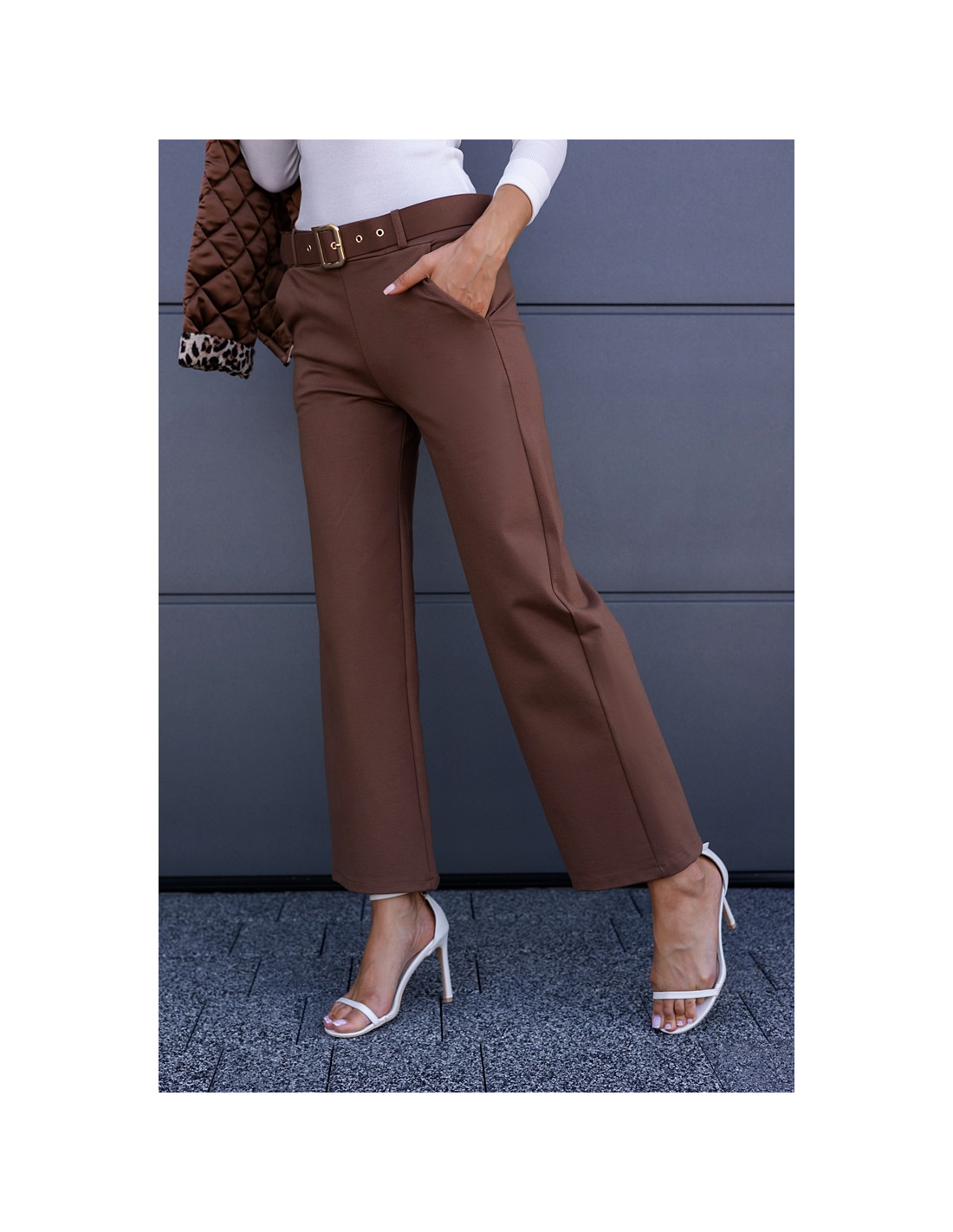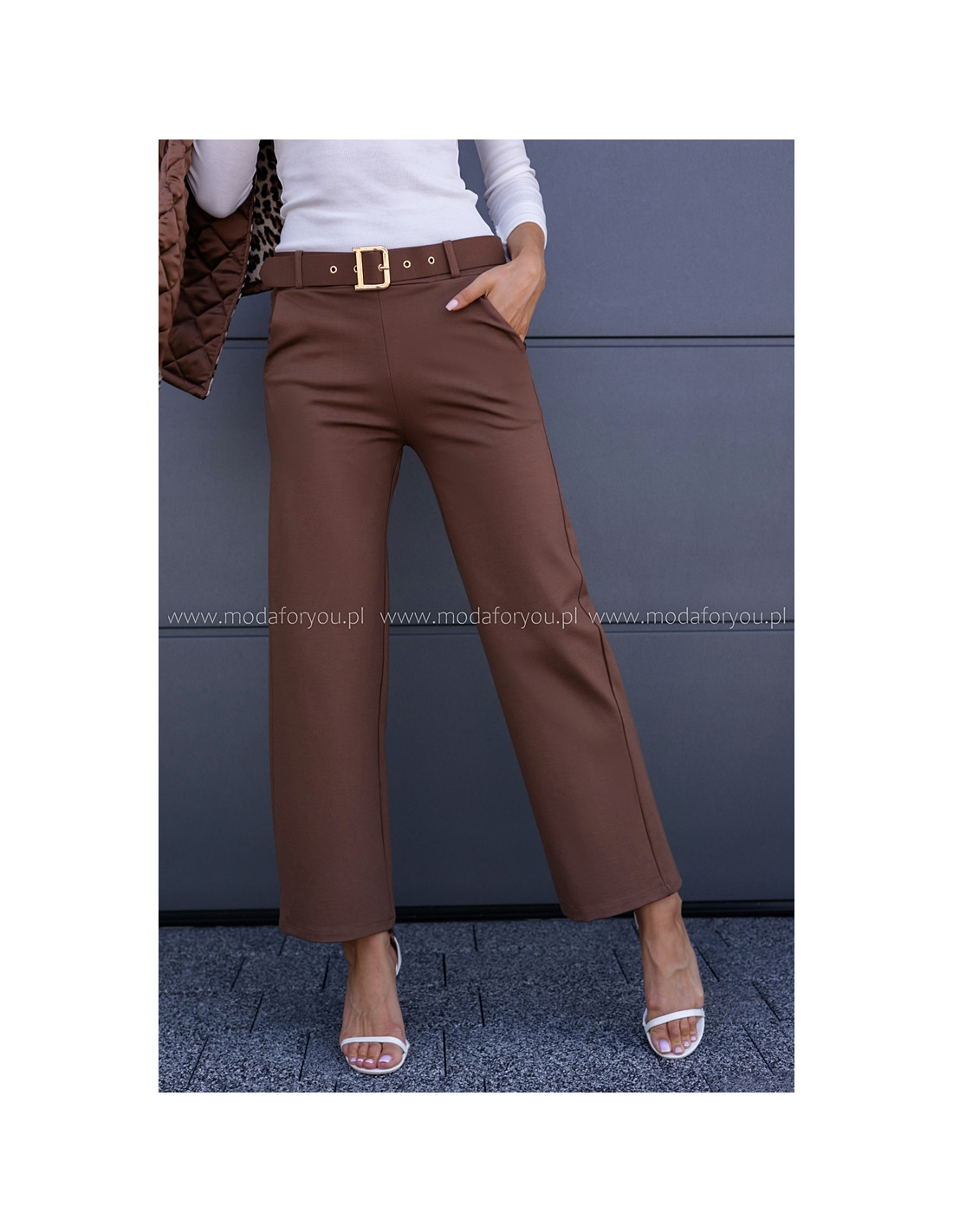 Eleganckie spodnie z wysokim stanem. Posiadają w zestawie pasek ze złotą sprzączką.