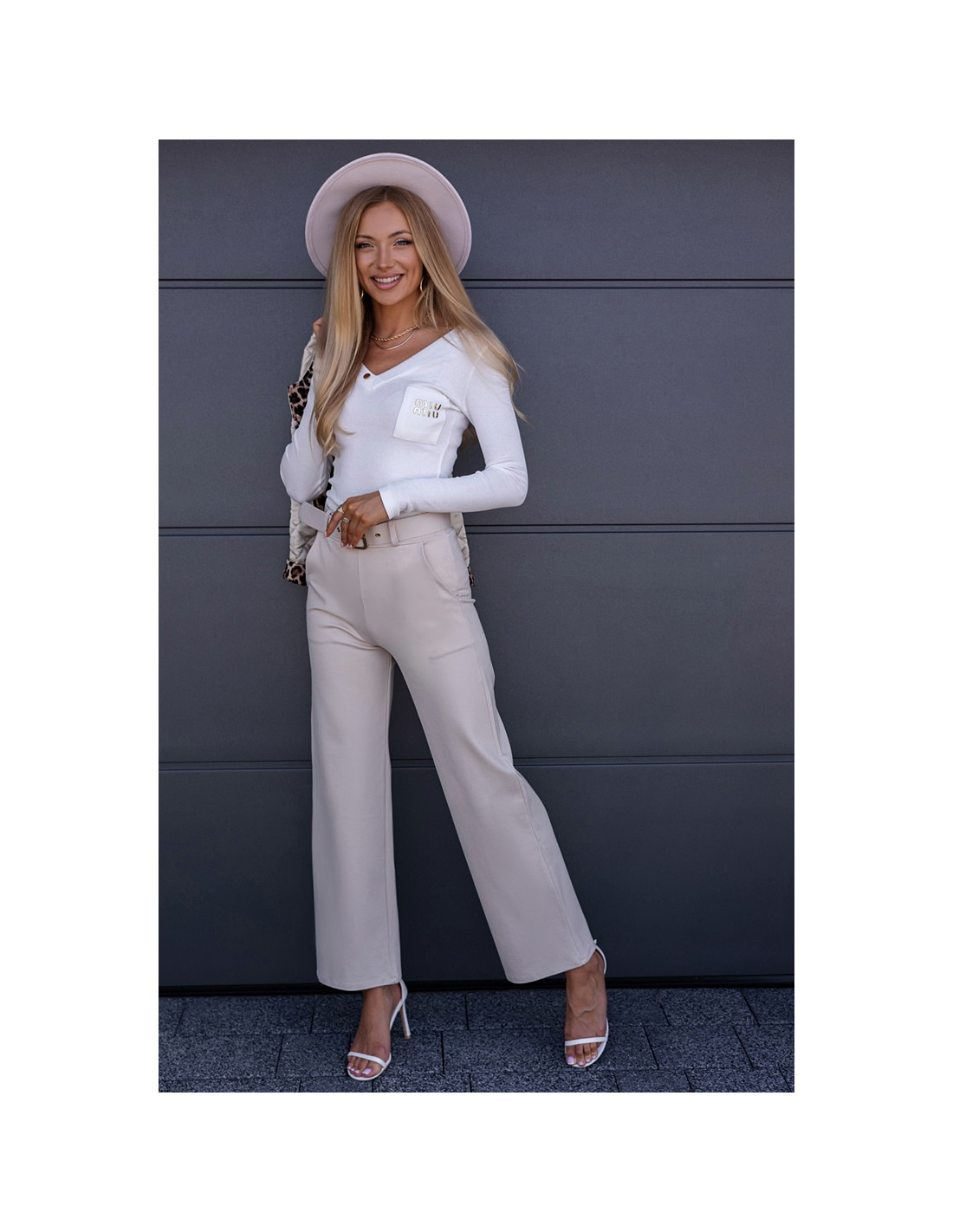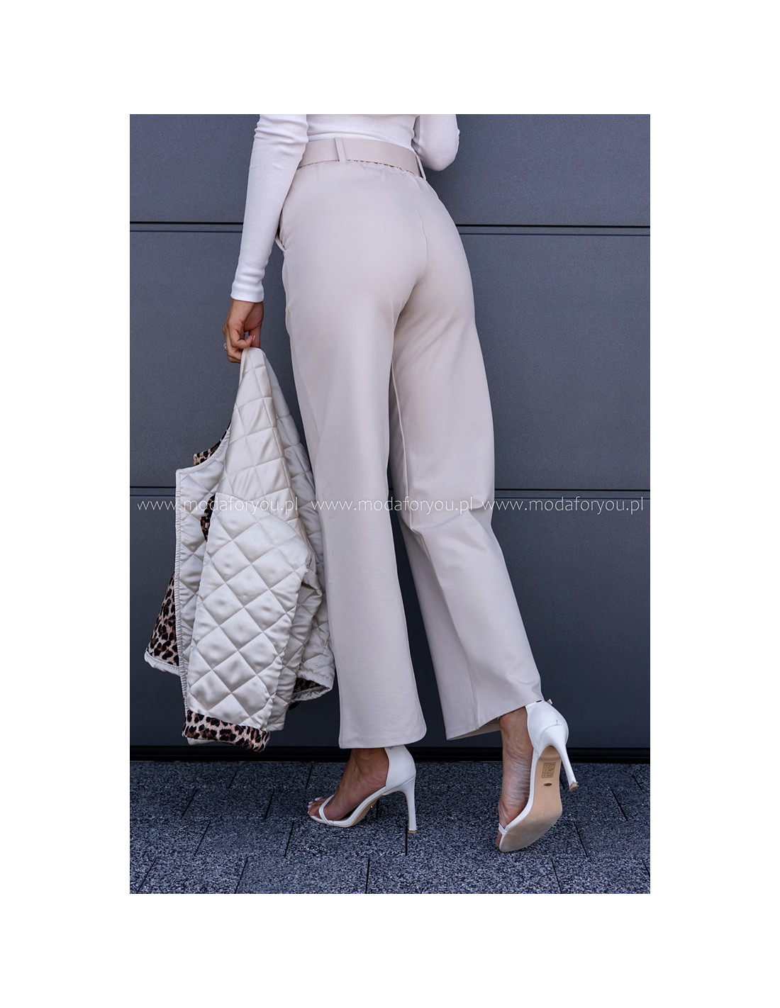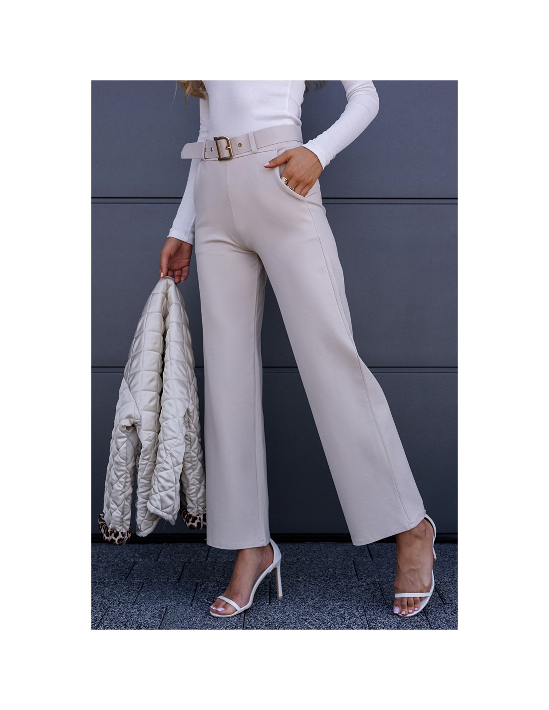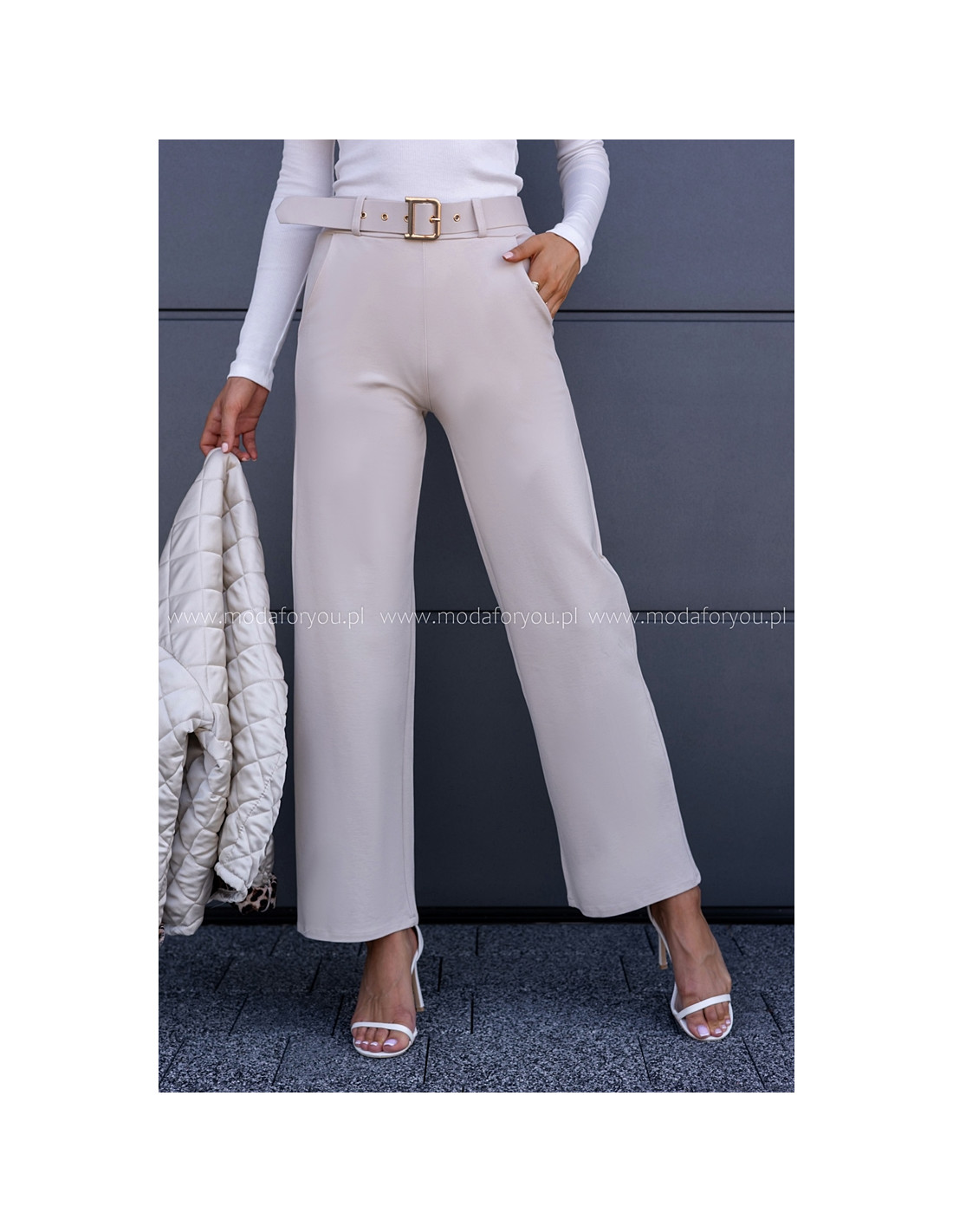 Eleganckie spodnie z wysokim stanem. Posiadają w zestawie pasek ze złotą sprzączką.