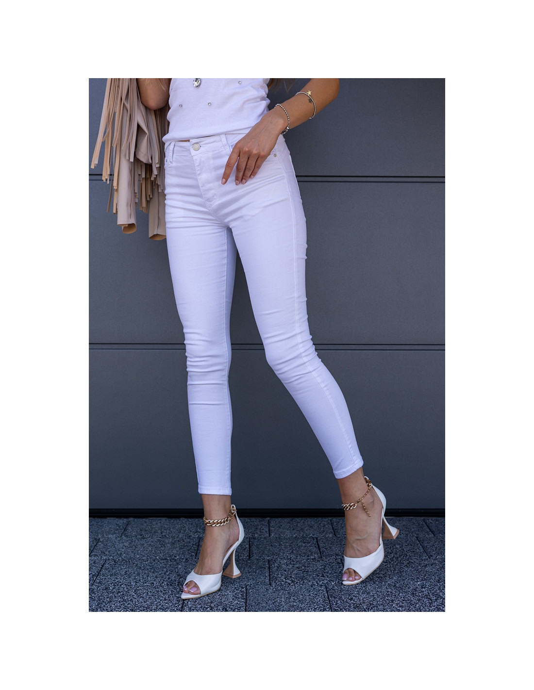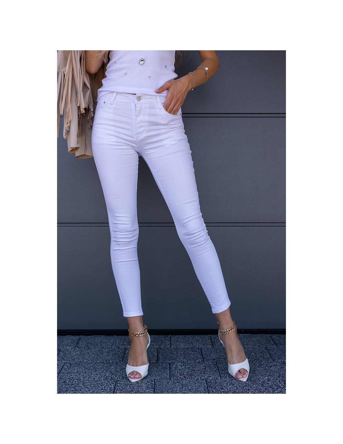 Białe, dopasowane spodnie z jeansu. Krój push-up, długość 7/8. Materiał dobrze się naciąga. Pasek nie jest w zestawie.
