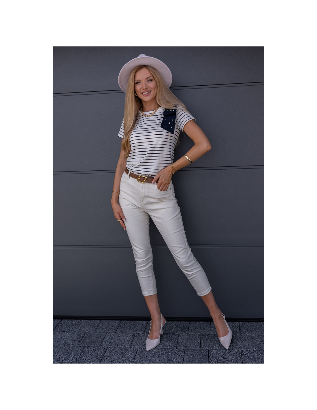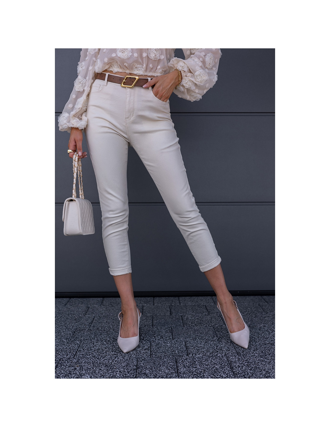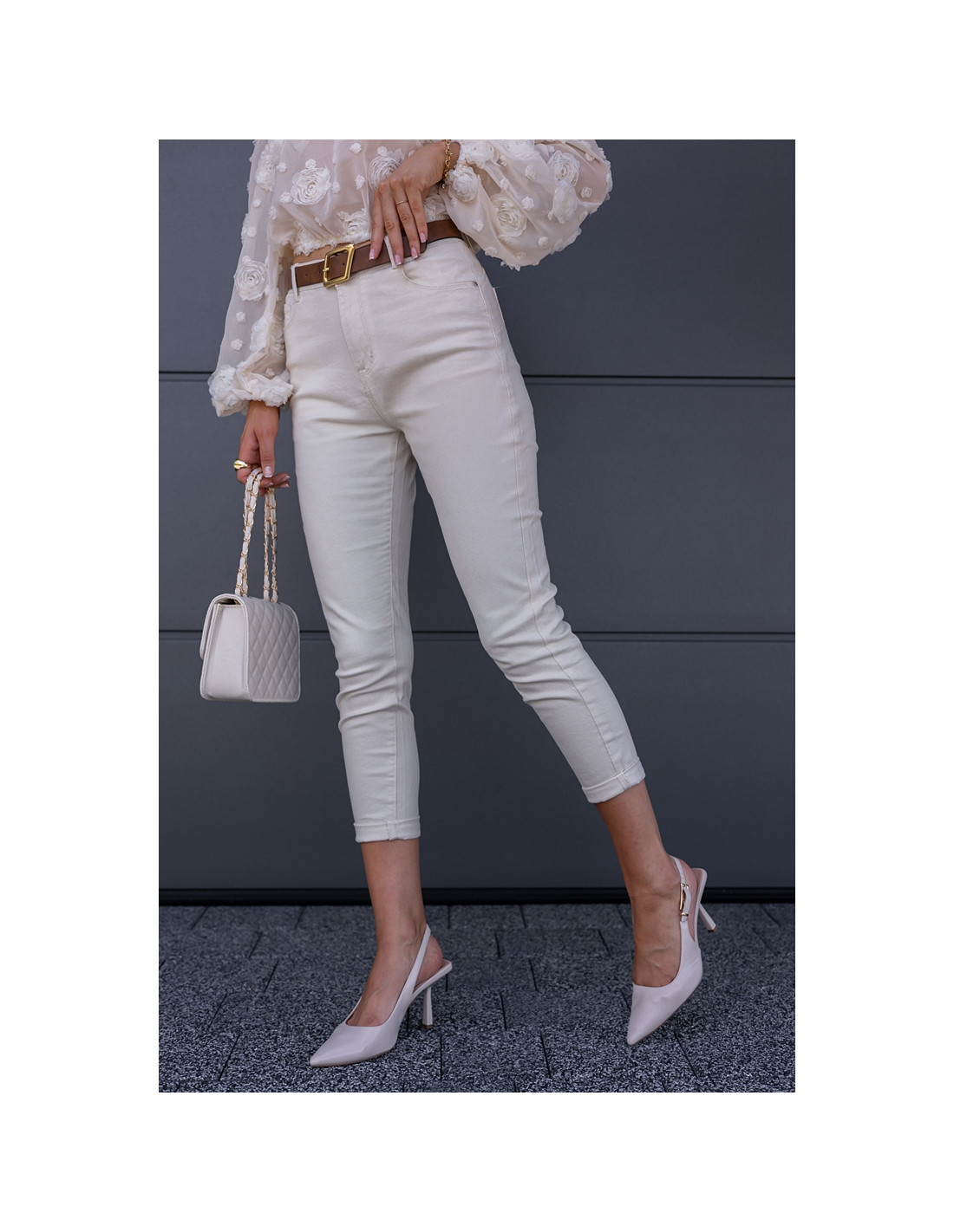 Spodnie z jasnego jeansu o kroju mom fit. Bardzo wygodny model, bardzo dobrze się ciągną. Nogawki podwinięte, zapinane klasycznie na suwak i guzik. Pasek w zestawie
