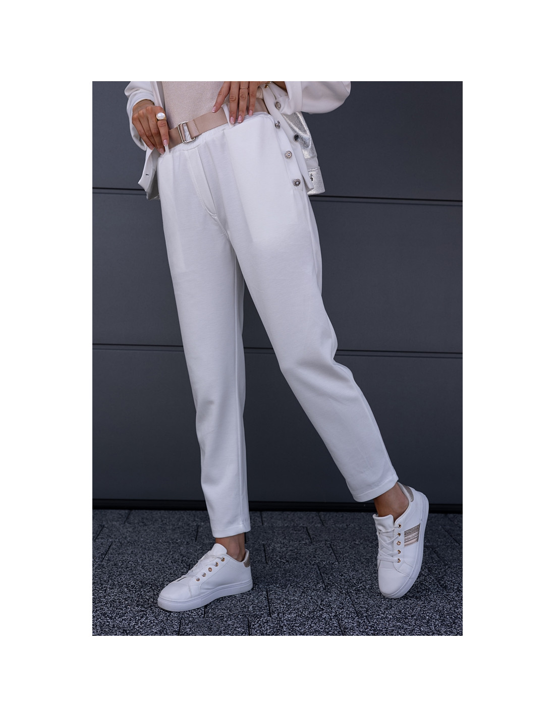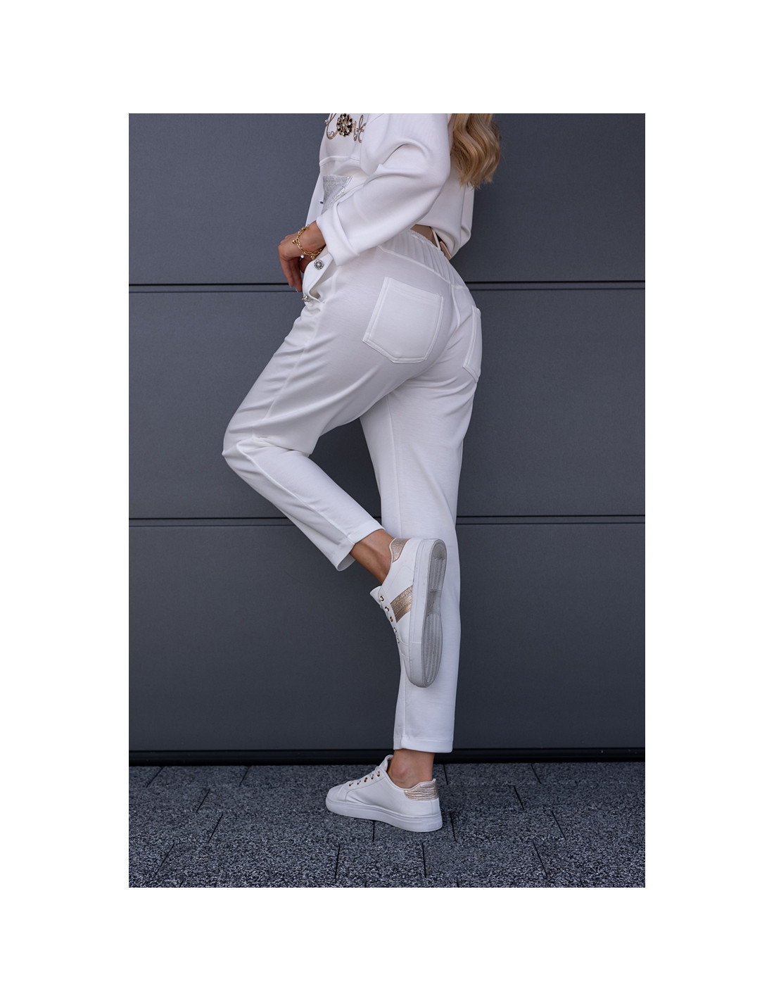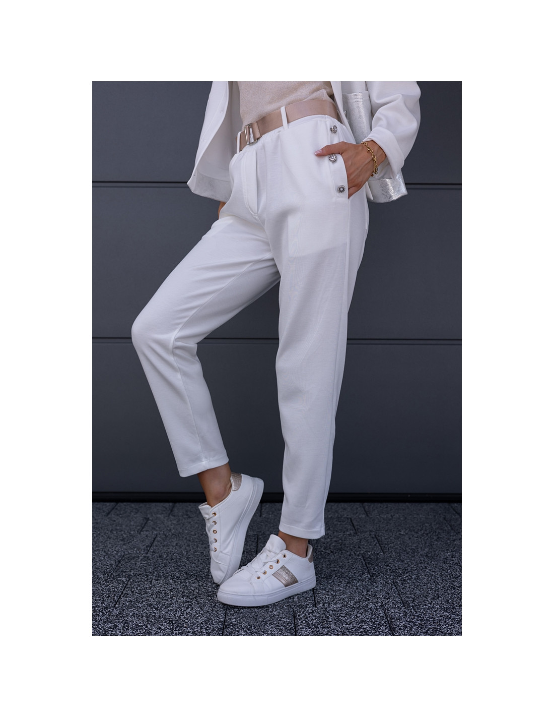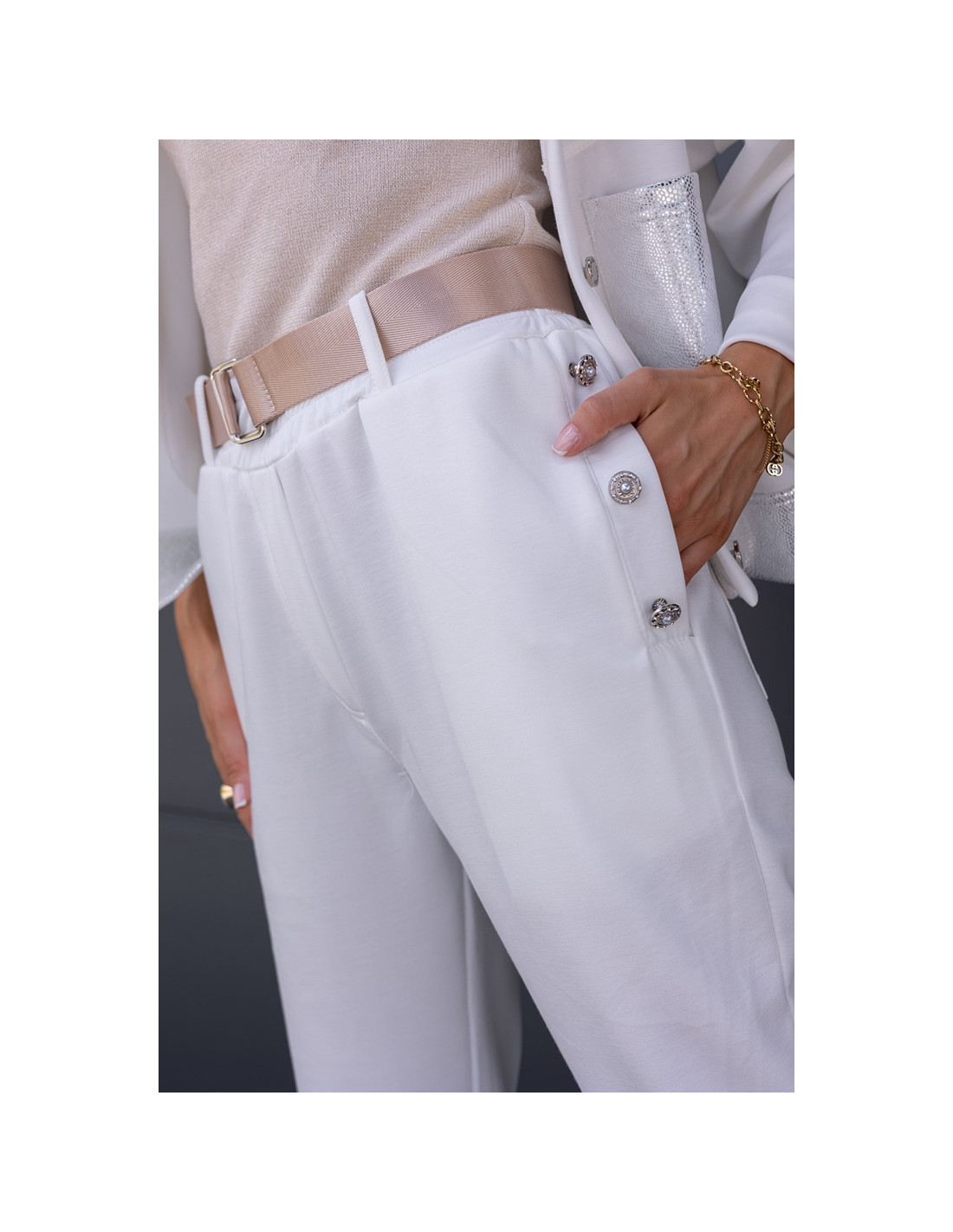 Posiadają gumkę w pasie oraz ozdobny, regulowany pasek. Posiadają również ozdobne kieszenie z guziczkami.
