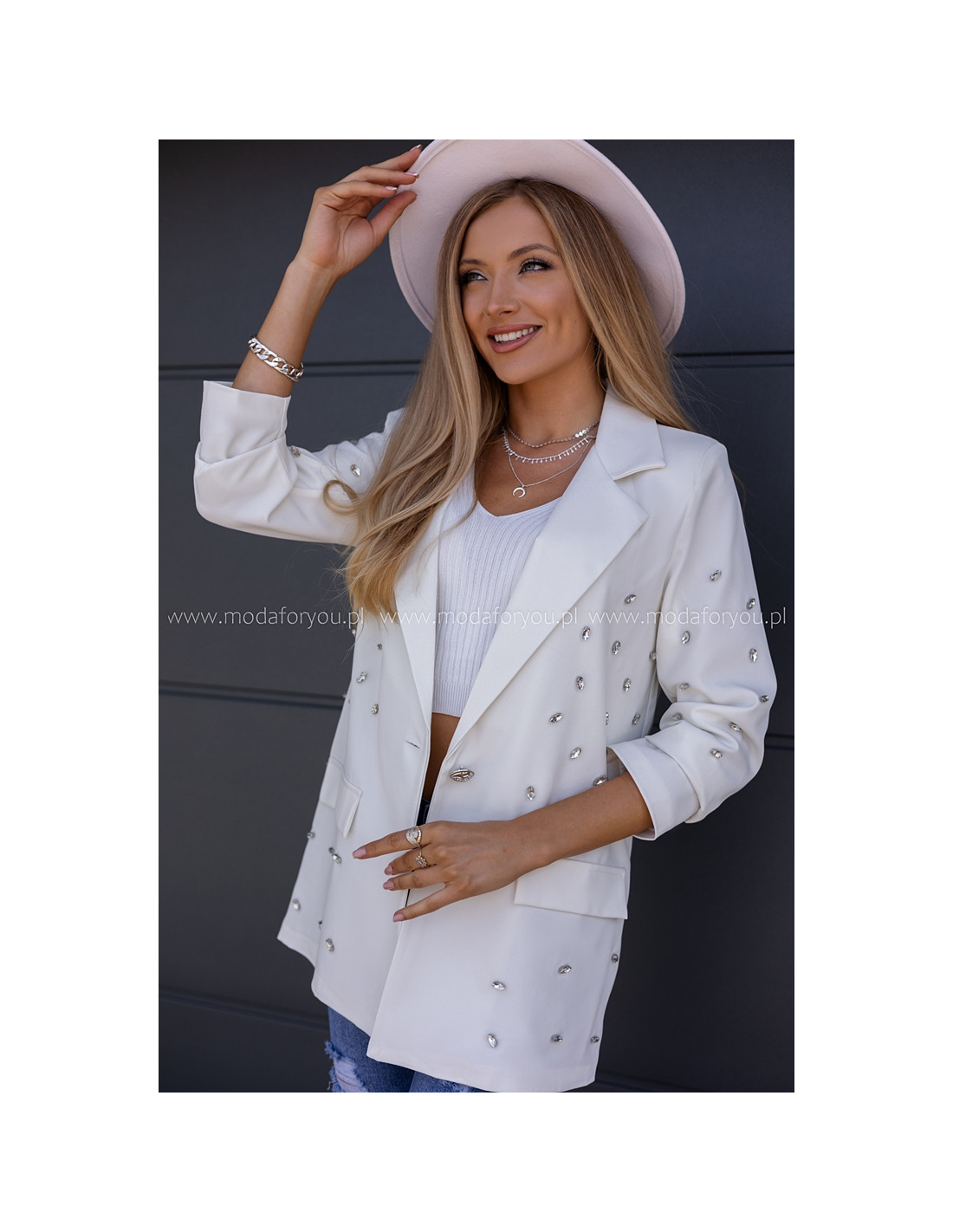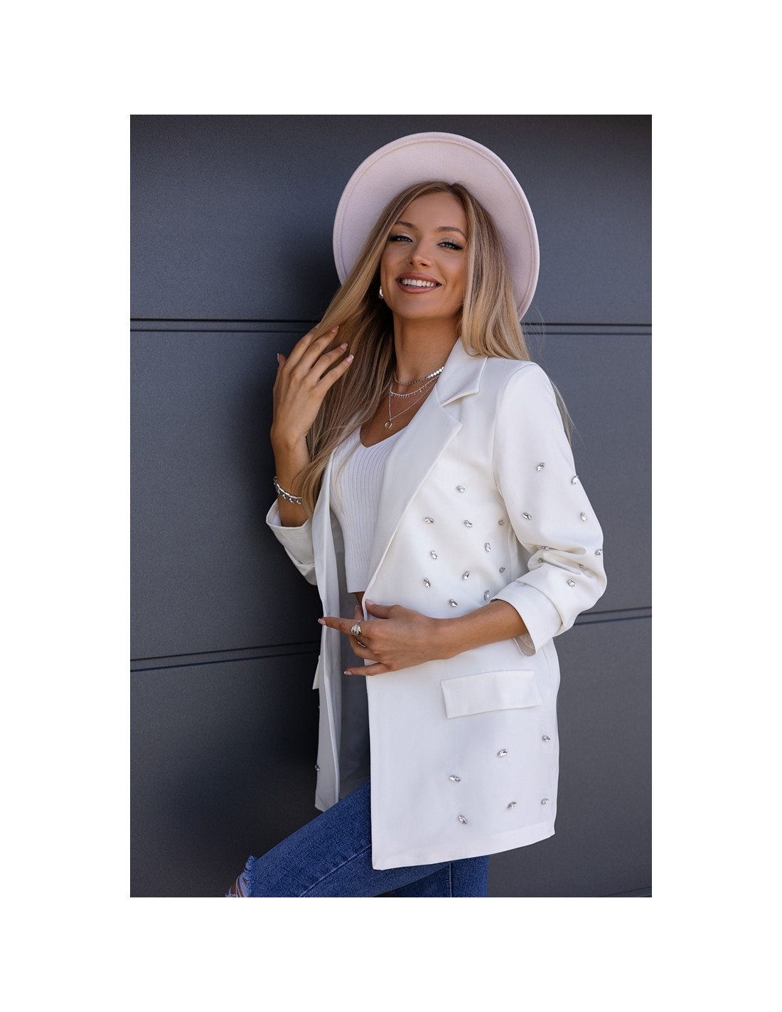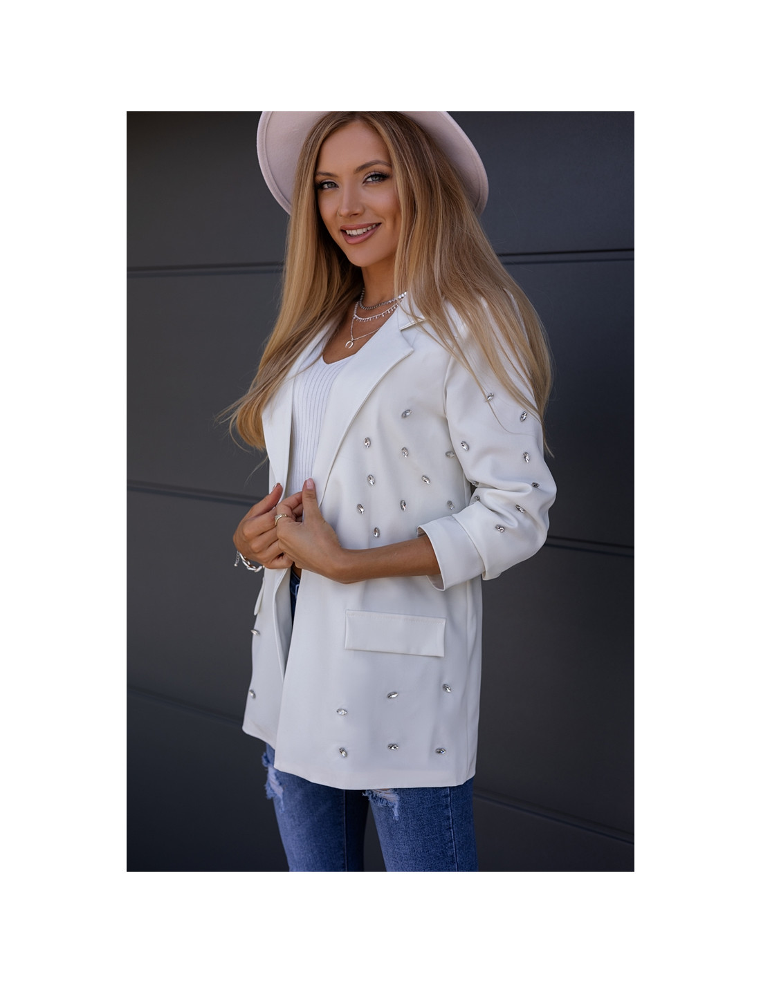 Piękny żakiet w oversizowym kroju, na przodzie naszyte srebrne kamienie. Rękawki długie, zapinany na jeden guzik.