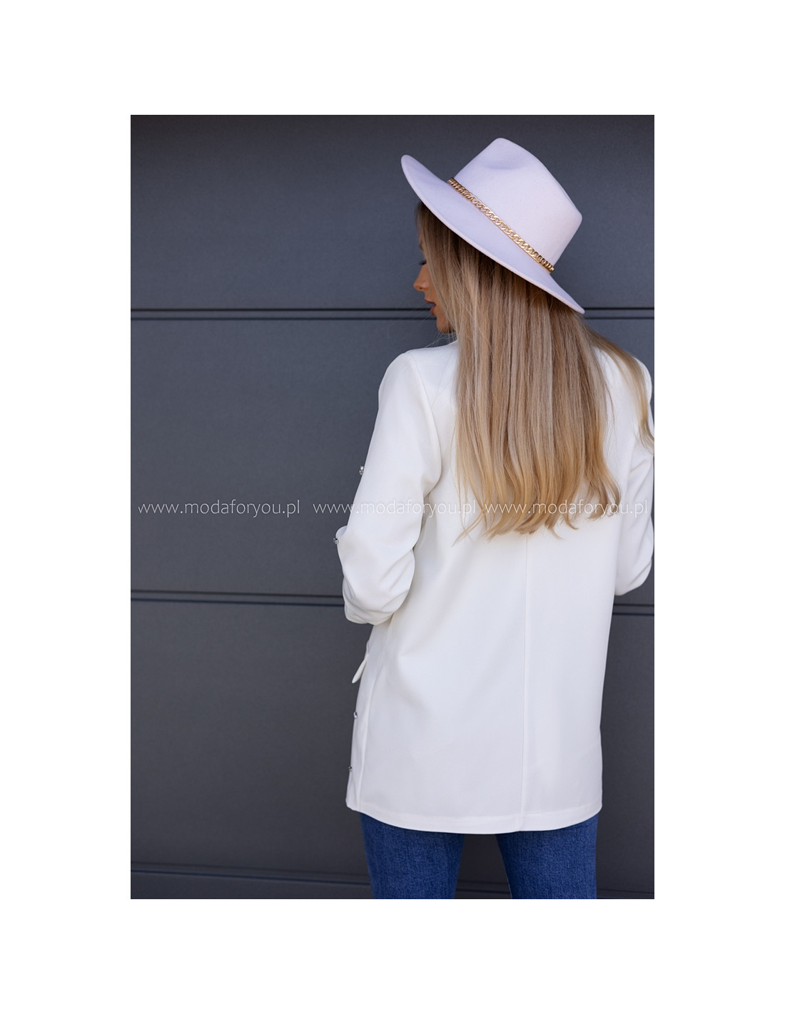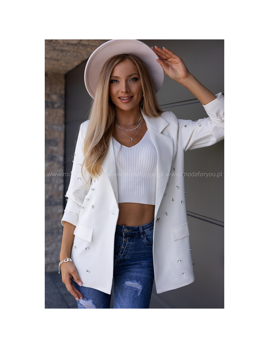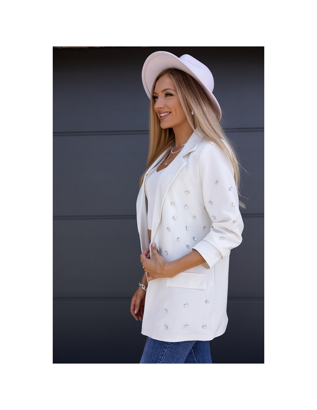 Piękny żakiet w oversizowym kroju, na przodzie naszyte srebrne kamienie. Rękawki długie, zapinany na jeden guzik.