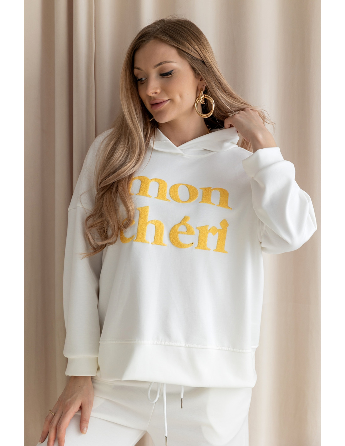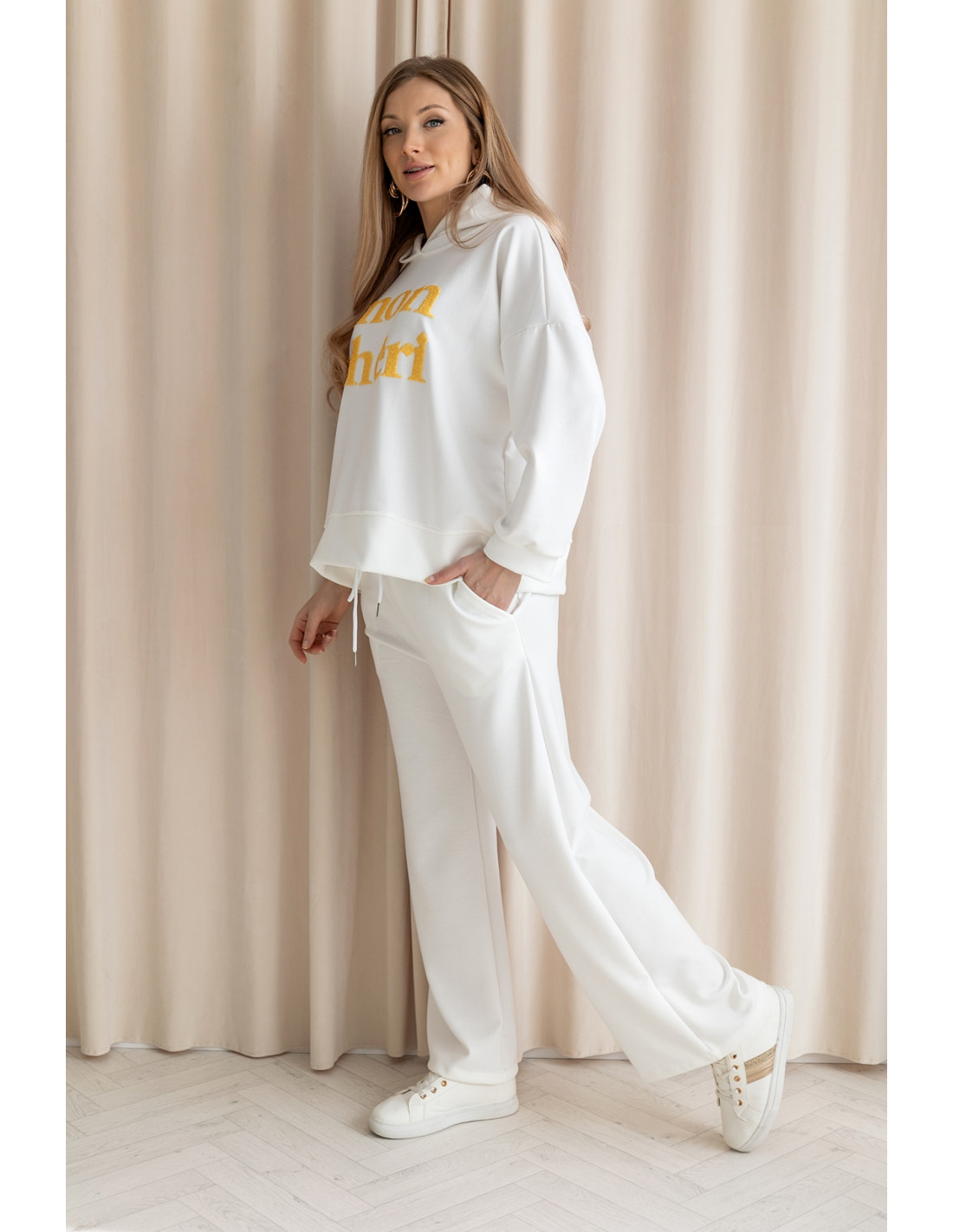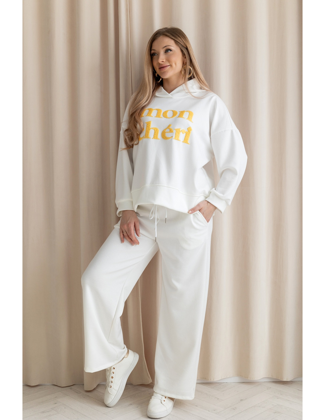 Sportowy komplet z niezwykle miękkiego, przyjemnego w dotyku materiału typu „masełko”, który zapewnia wyjątkowy komfort noszenia. Bluza ma swobodny krój i posiada kaptur oraz napis MON CHERI. Spodnie z szeroką nogawką i elastycznym pasem gwarantują wygodę oraz piękne układanie się materiału przy ruchu. To wygodny zestaw  — idealny na co dzień, na wyjścia i na wycieczki.
