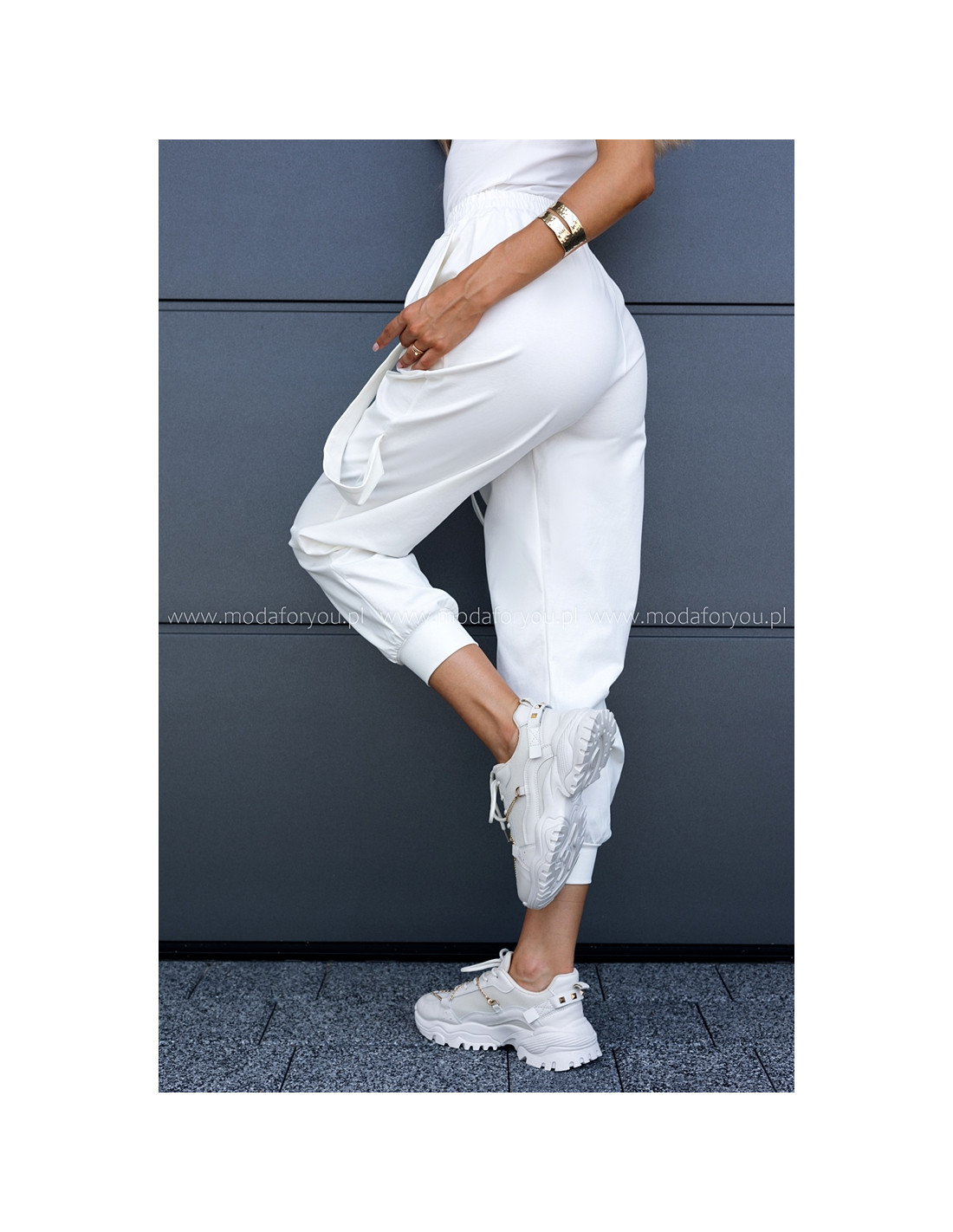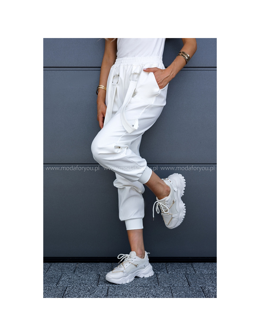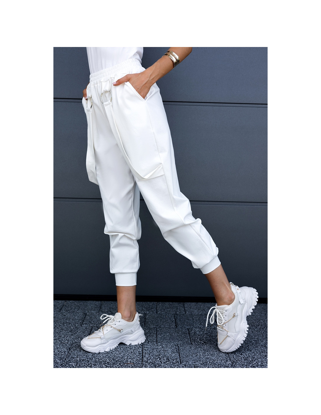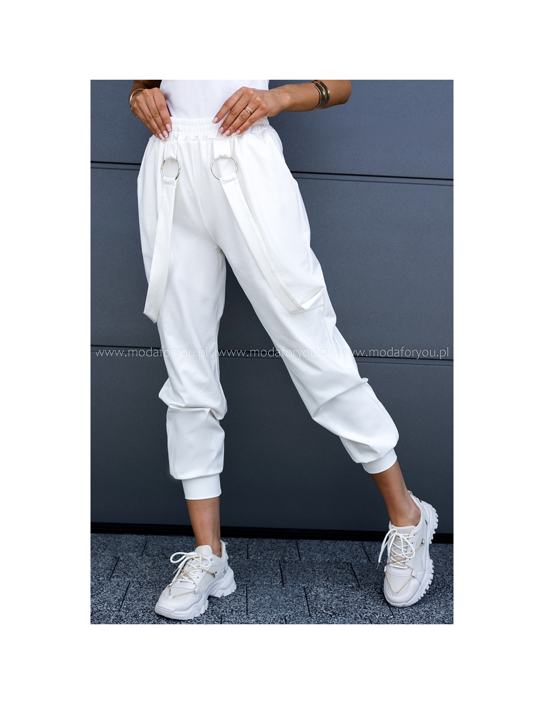 Luźne spodnie z wysokim stanem, w pasie guma. Posiadają kieszenie i ozdobne wiszące paski.