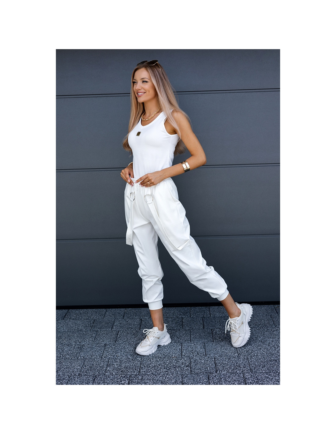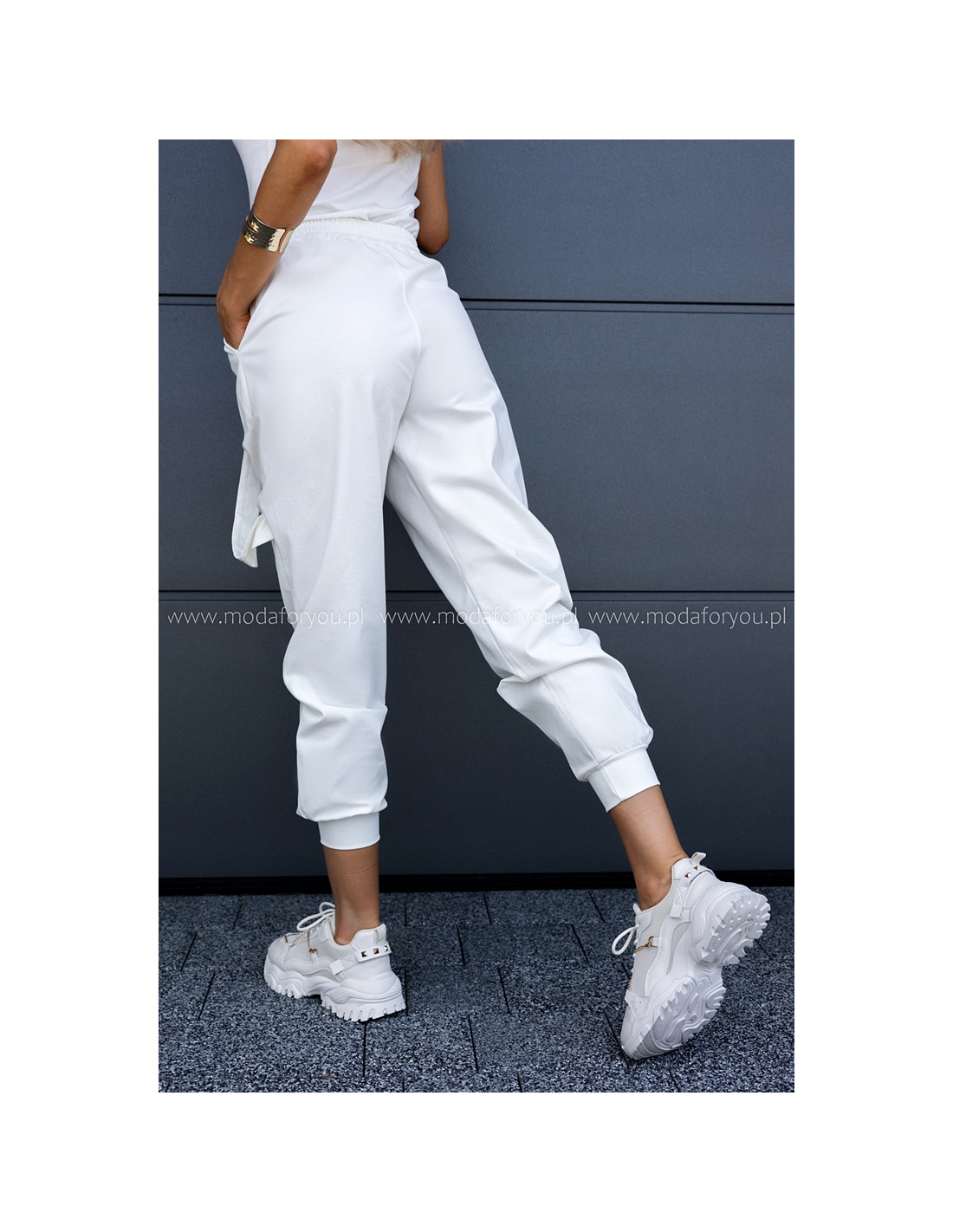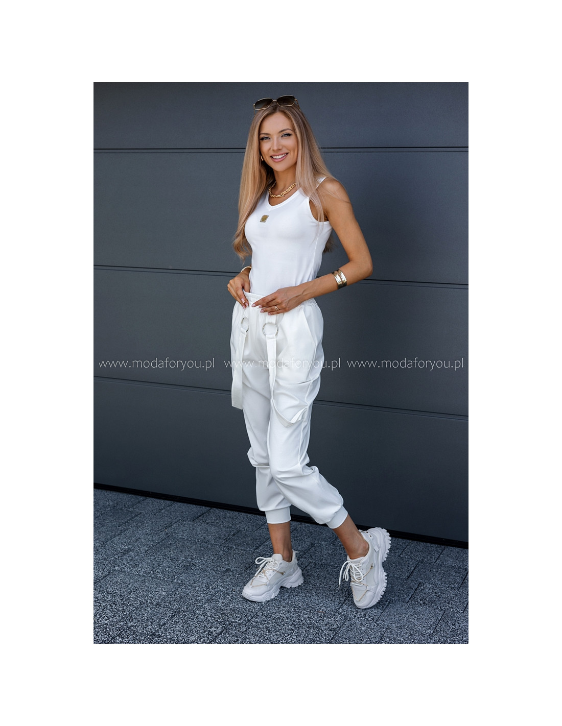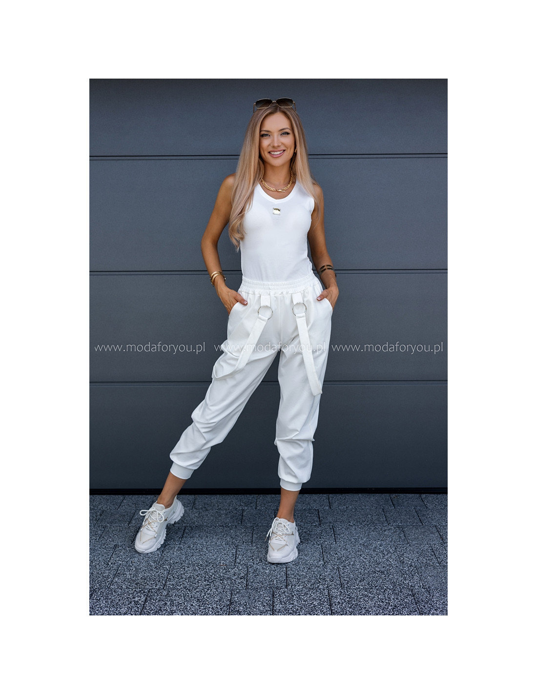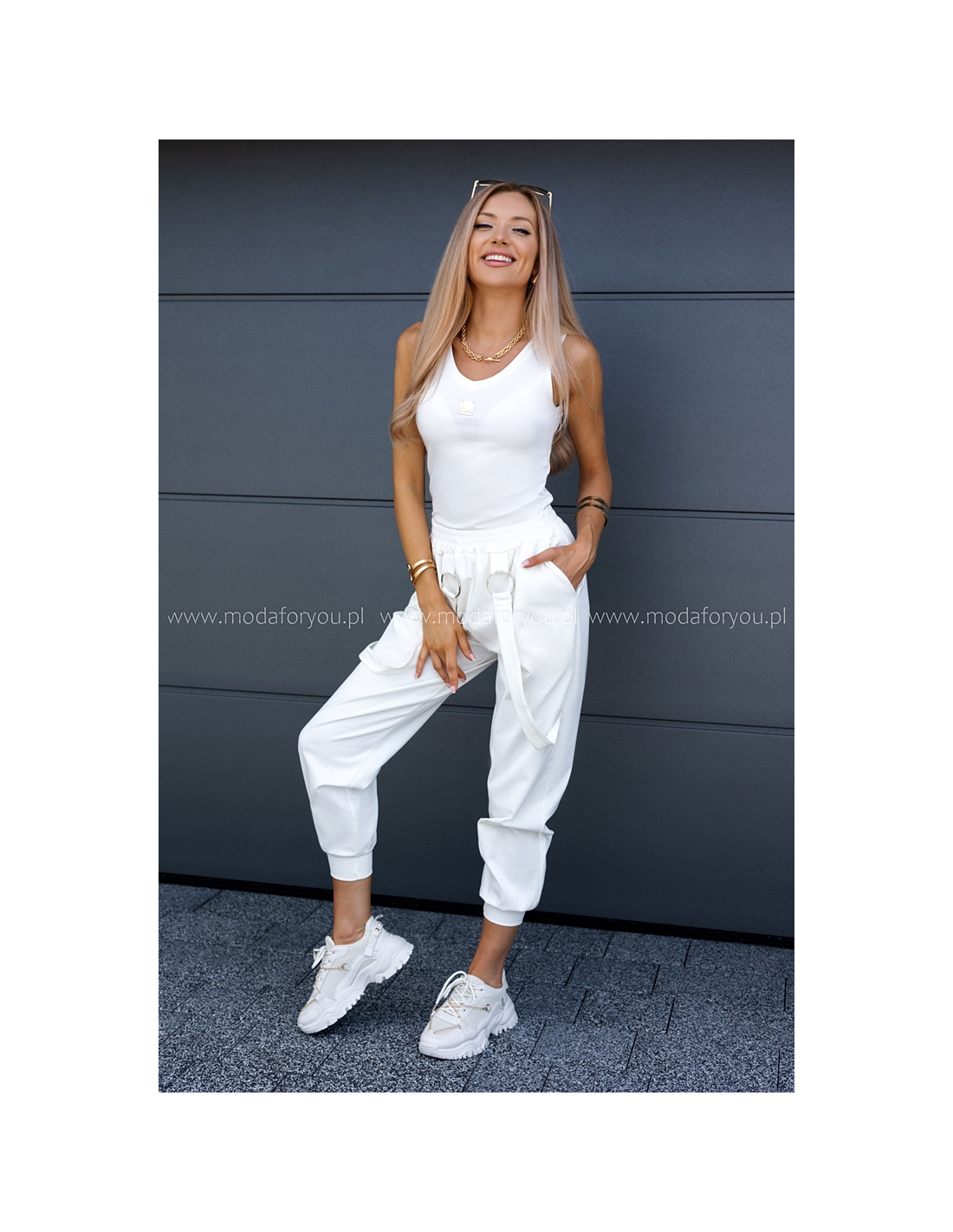 Luźne spodnie z wysokim stanem, w pasie guma. Posiadają kieszenie i ozdobne wiszące paski.