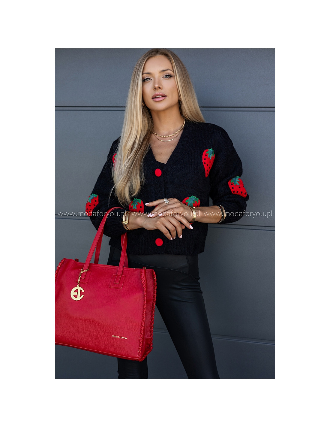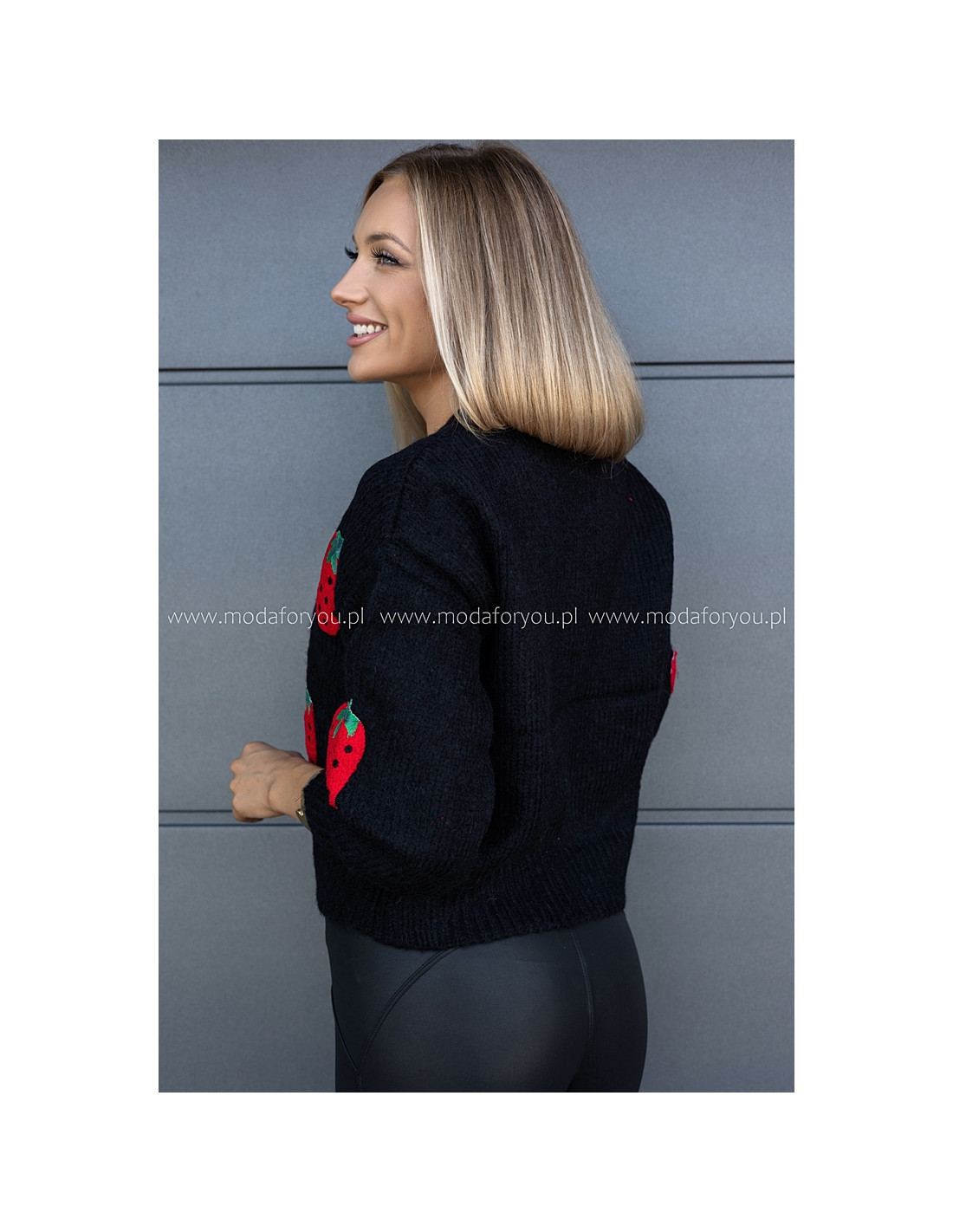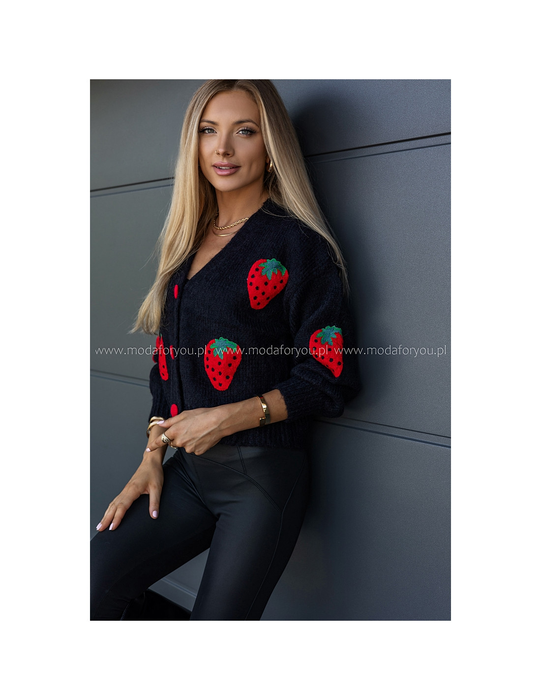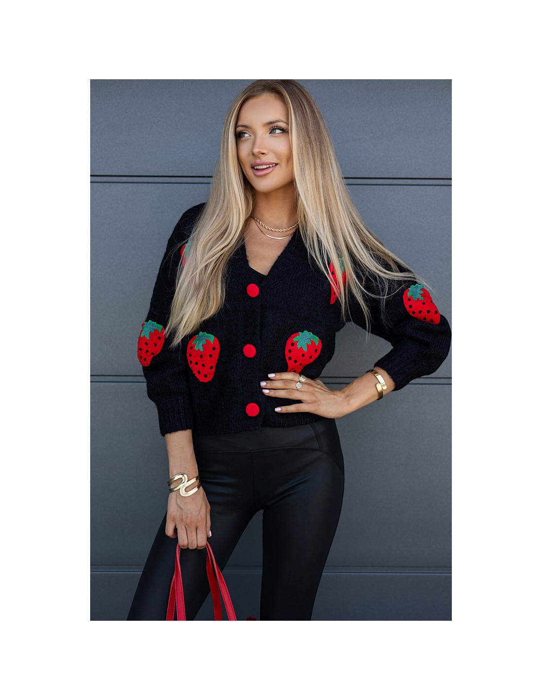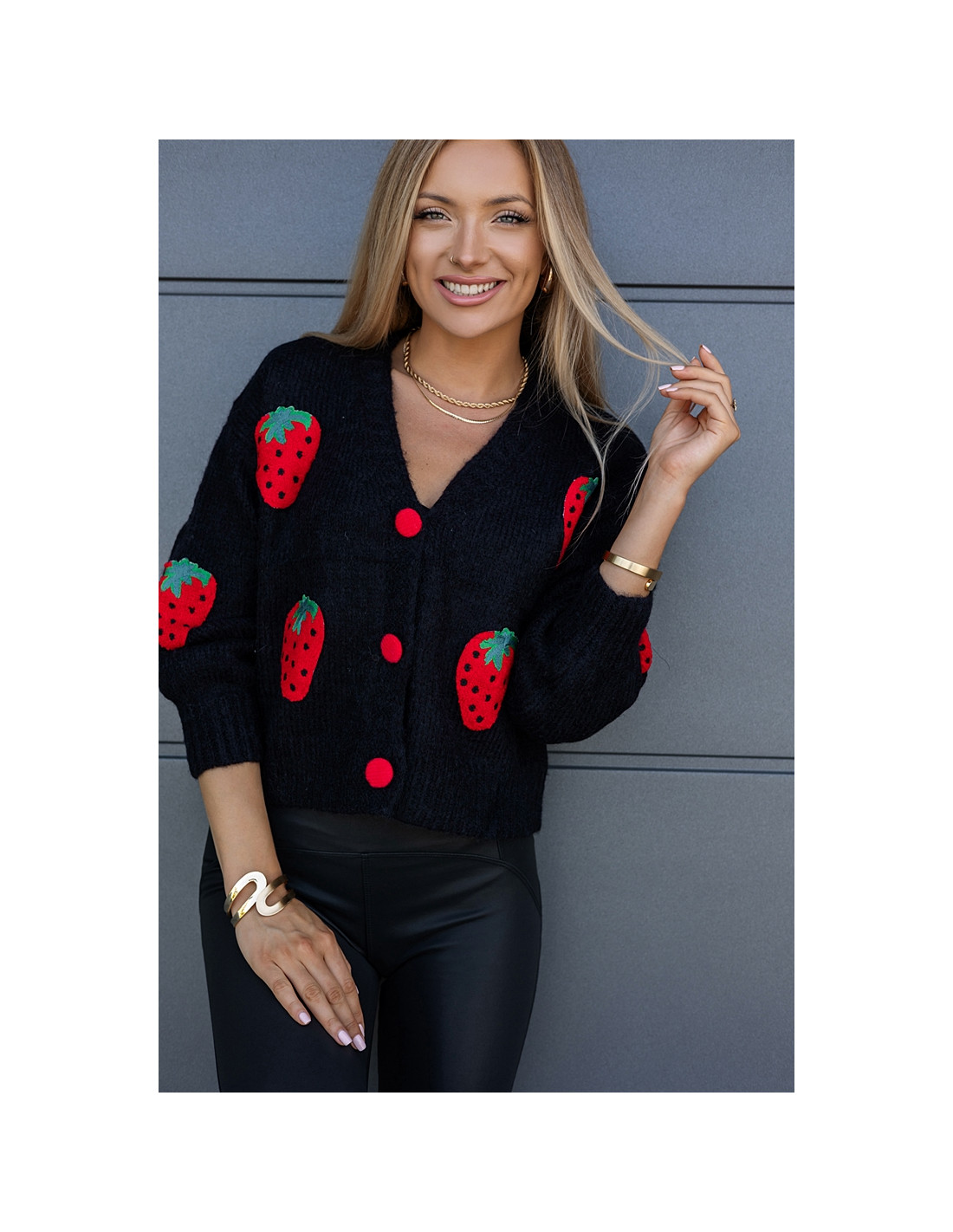 Śliczny sweterek na guziczki z naszytymi truskawkami. Piękny, gruby splot. Idealny na chłodne dni.