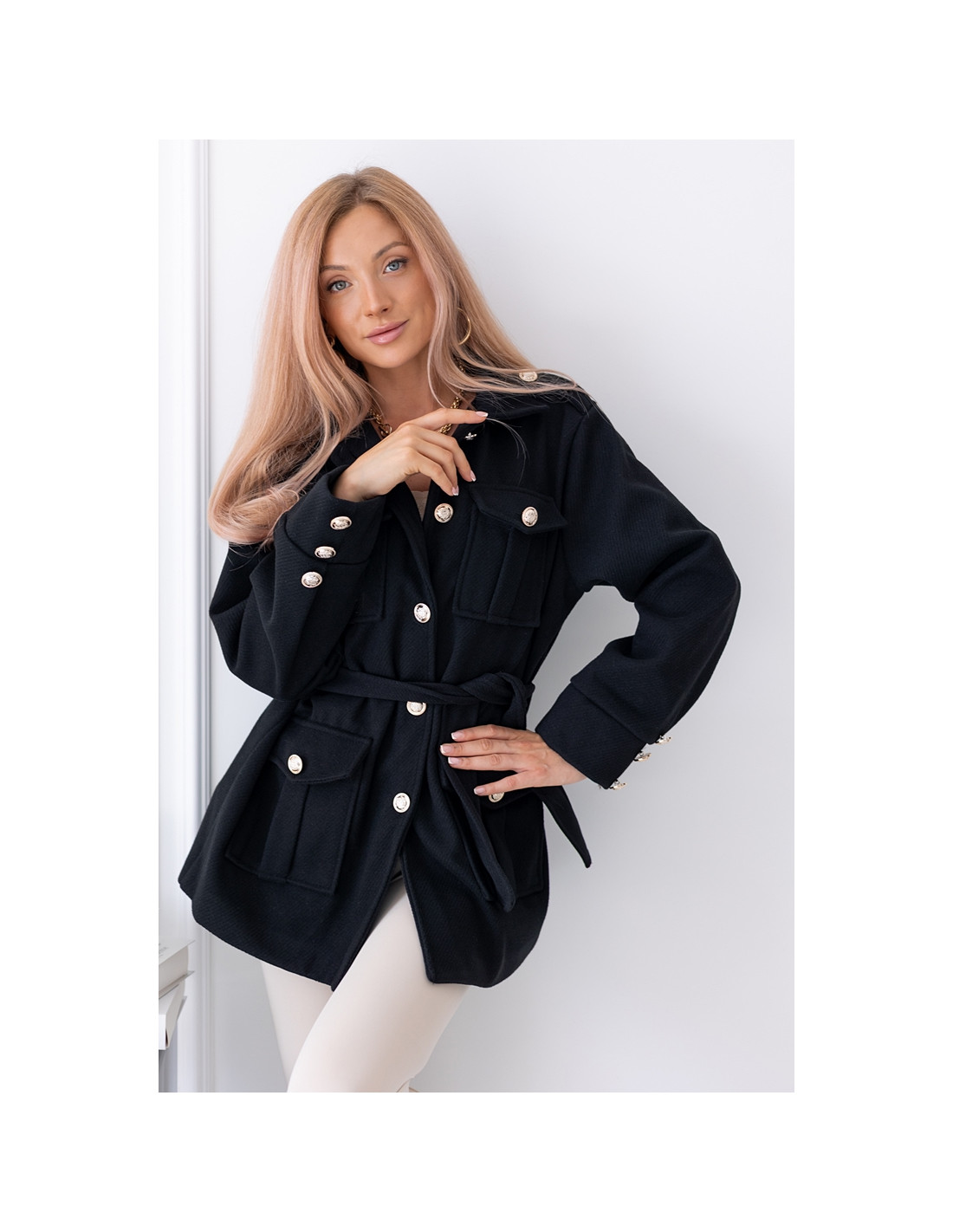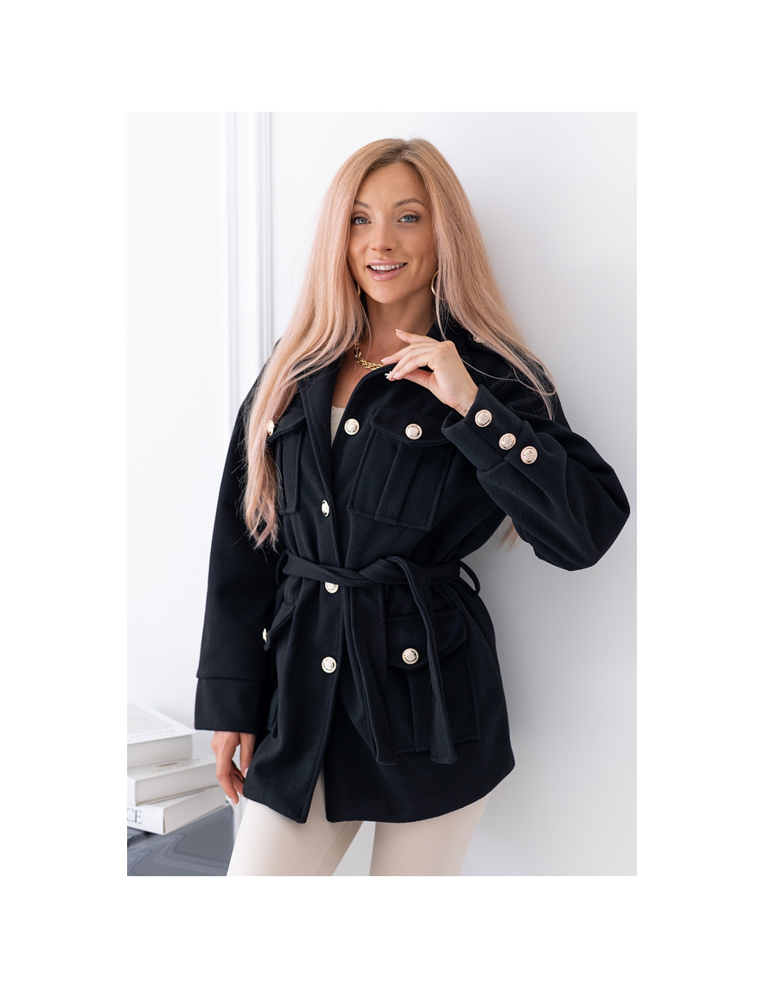 Kurtka z kołnierzem i ozdobnymi kieszeniami , zapinana na złote guziki. W tali wiązanie, materiał lekki prążek. Idealny model na jesień i lekką  zimę.