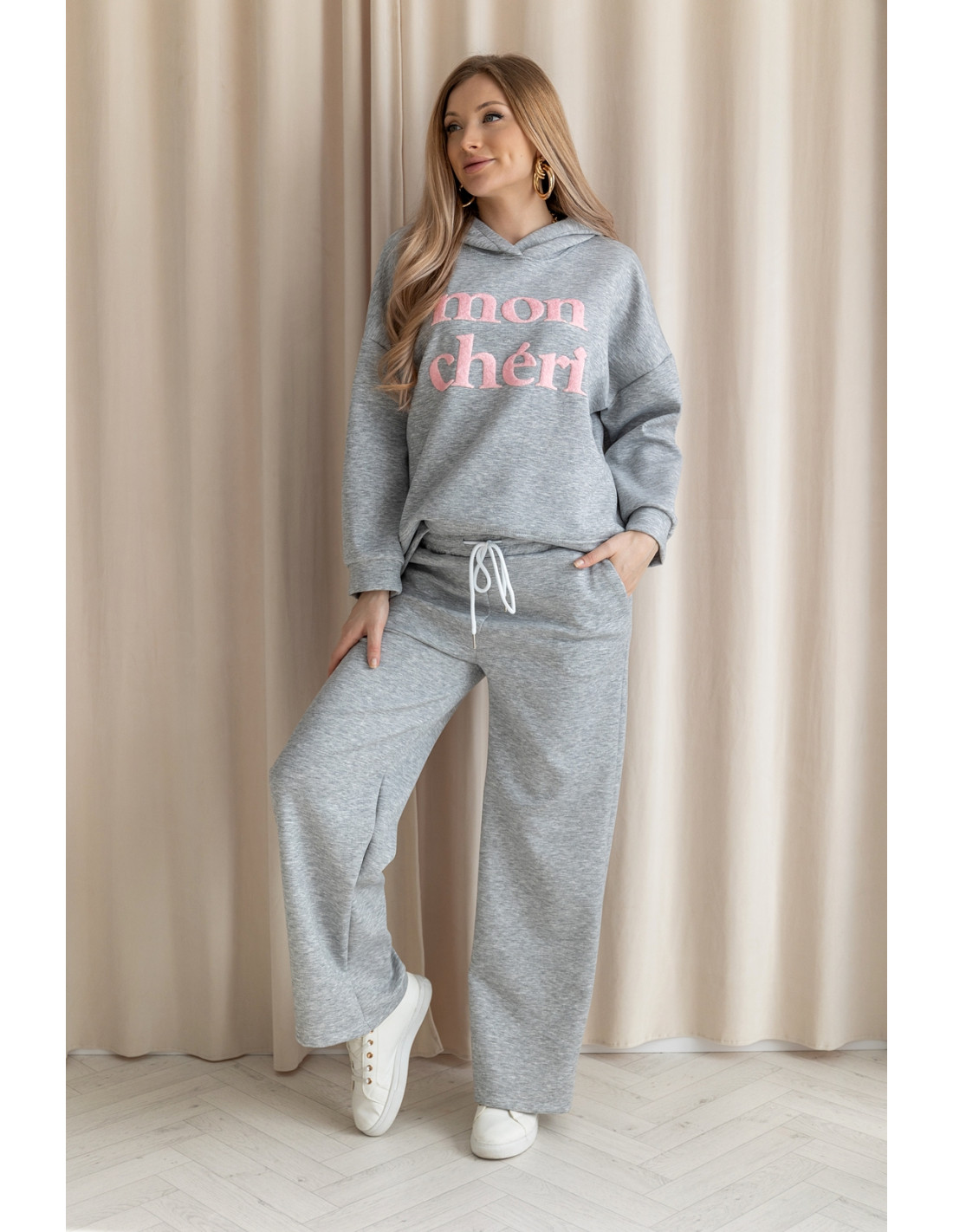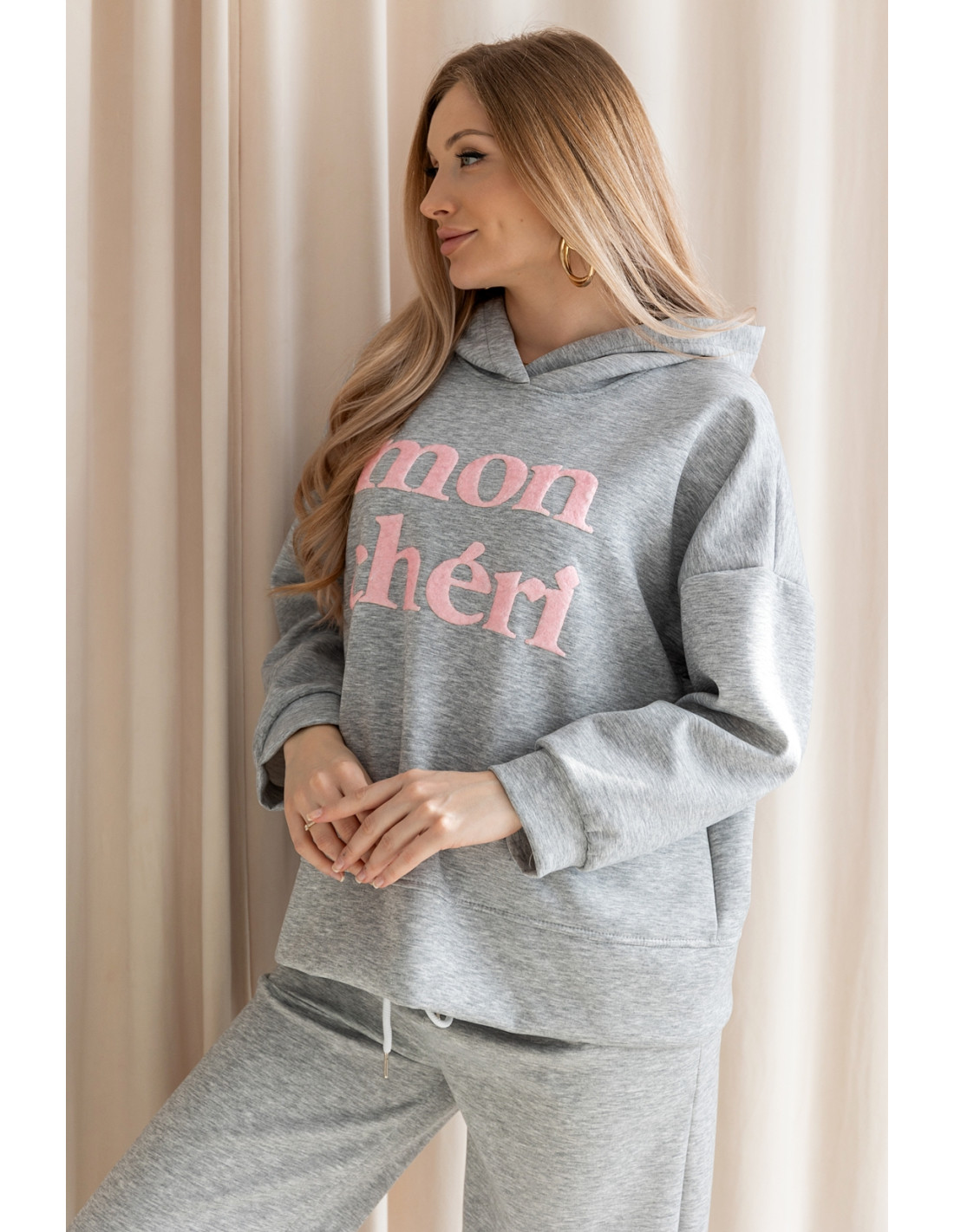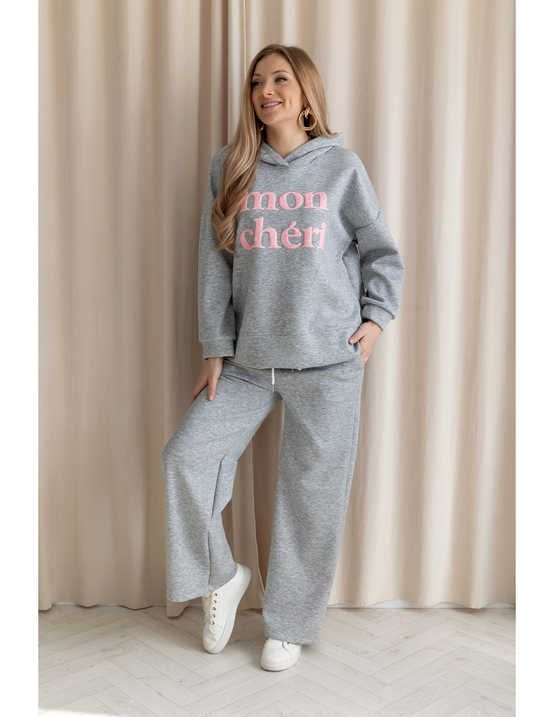 Sportowy komplet z niezwykle miękkiego, przyjemnego w dotyku materiału typu „masełko”, który zapewnia wyjątkowy komfort noszenia. Bluza ma swobodny krój i posiada kaptur oraz napis MON CHERI. Spodnie z szeroką nogawką i elastycznym pasem gwarantują wygodę oraz piękne układanie się materiału przy ruchu. To wygodny zestaw — idealny na co dzień, na wyjścia i na wycieczki.