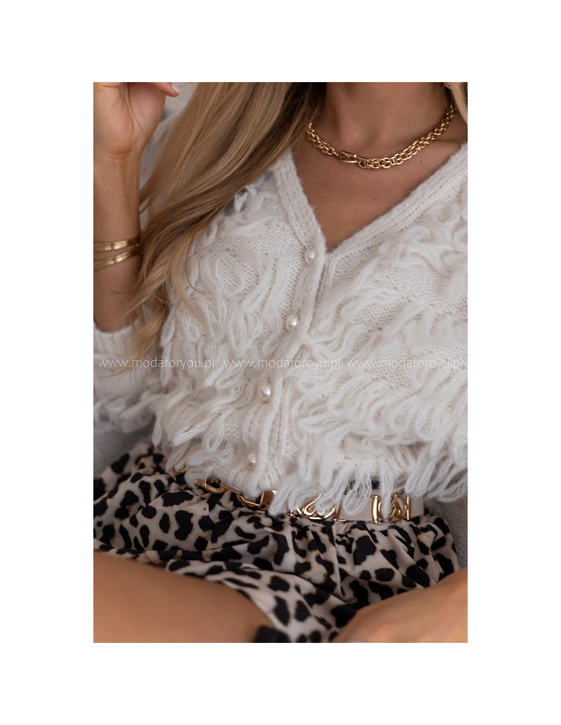Efektowy, ciepły sweter zappinany na perłowe guziki. Rękawki zakończone frędzelkami, na przodzie również frędzelki. Tył gładki.