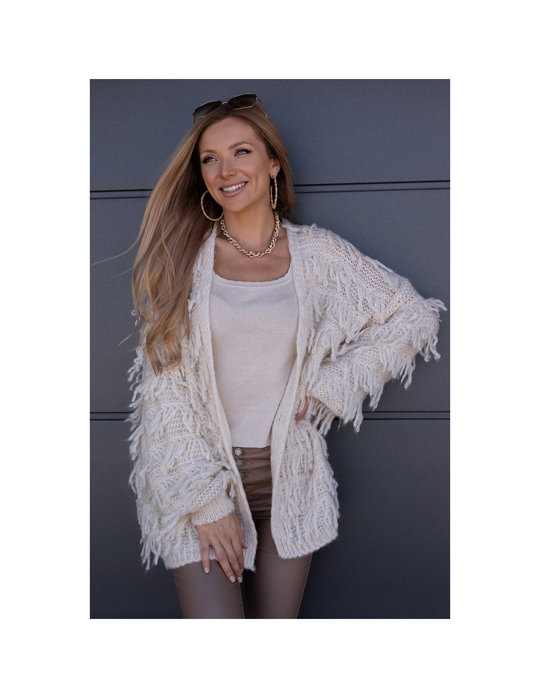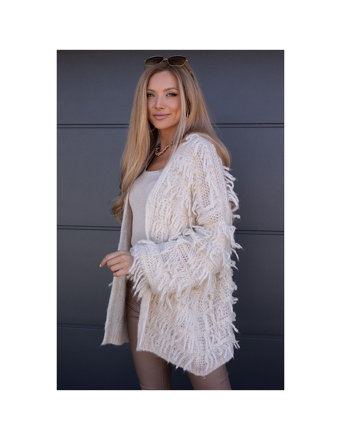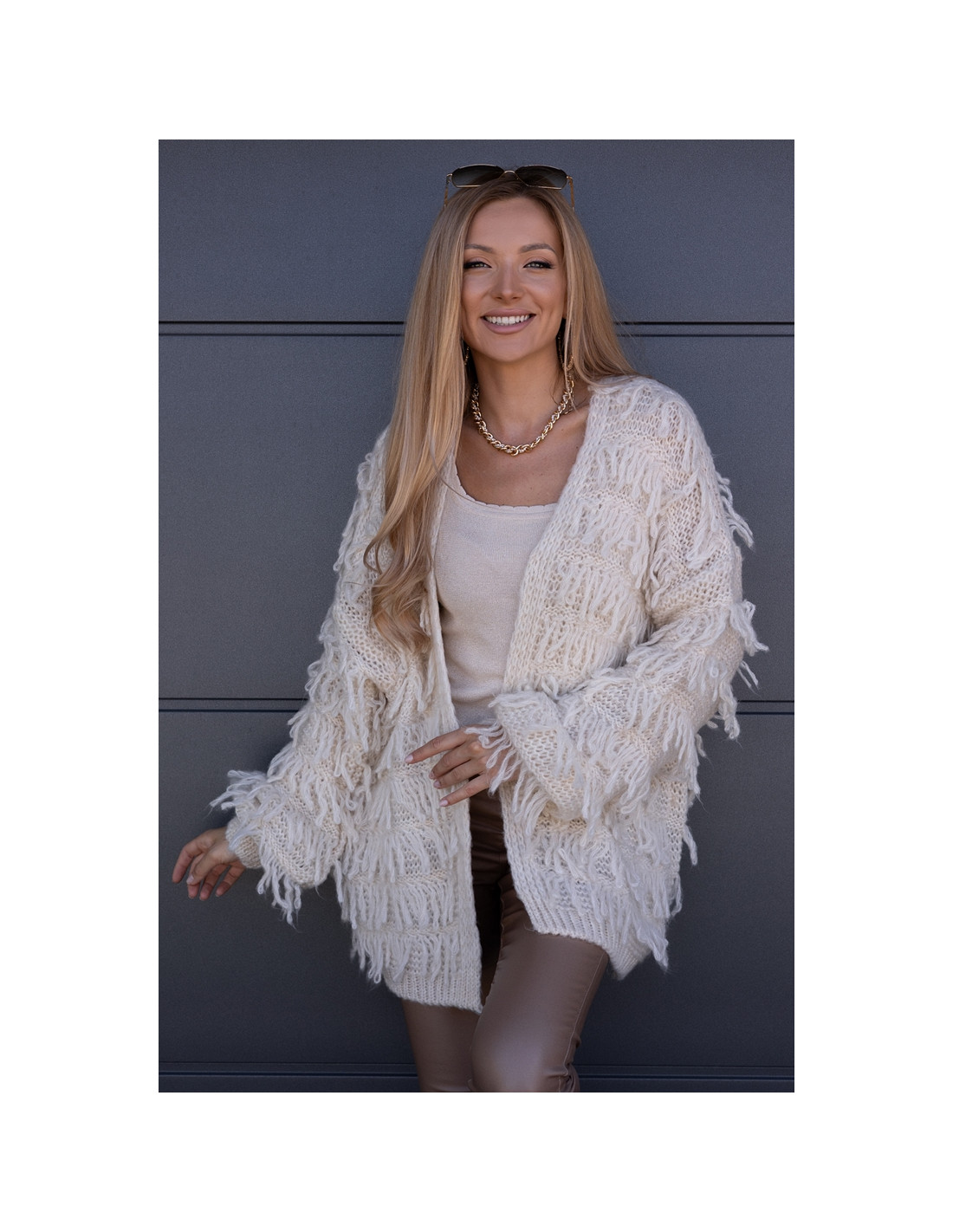 Piękny, owersizowy kardigan , nie posiada zapięcia, rękawki obniżone ze ściągaczami. Odstające frędzelki, ciepły i milutki w dotyku.