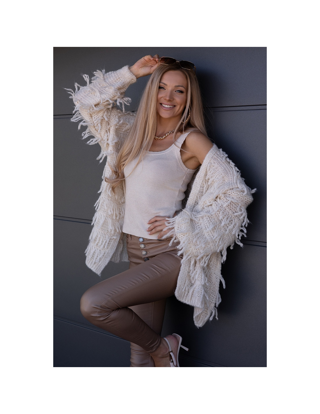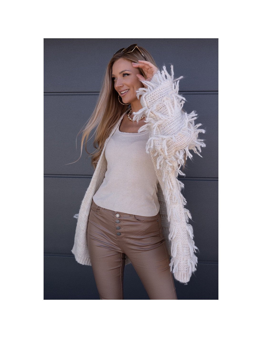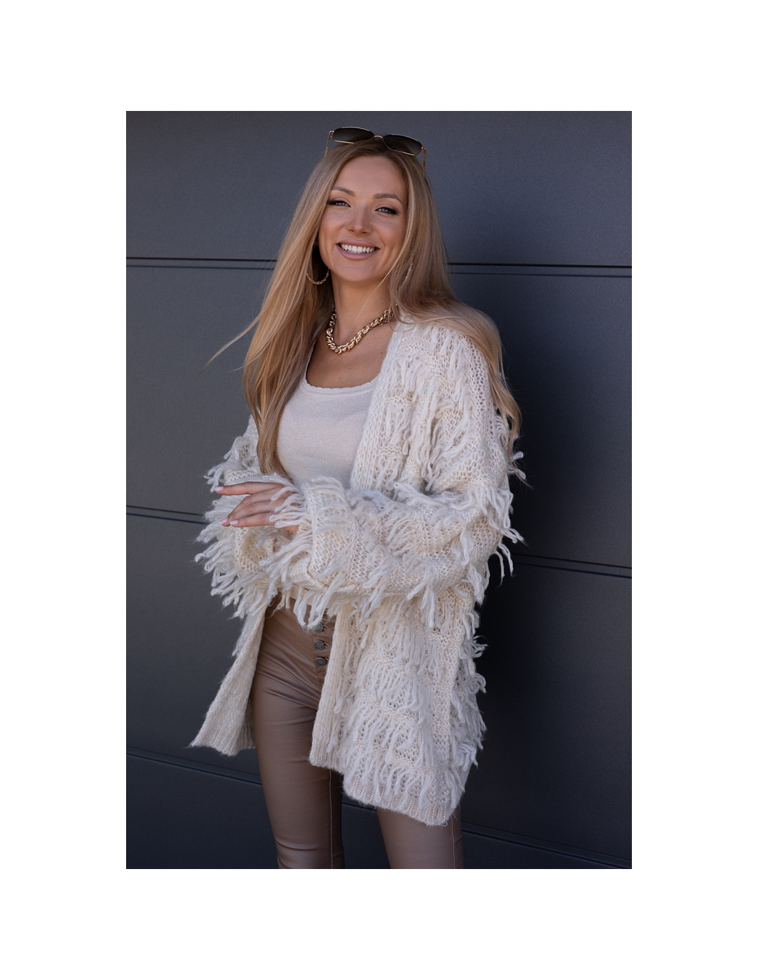 Piękny, owersizowy kardigan , nie posiada zapięcia, rękawki obniżone ze ściągaczami. Odstające frędzelki, ciepły i milutki w dotyku.