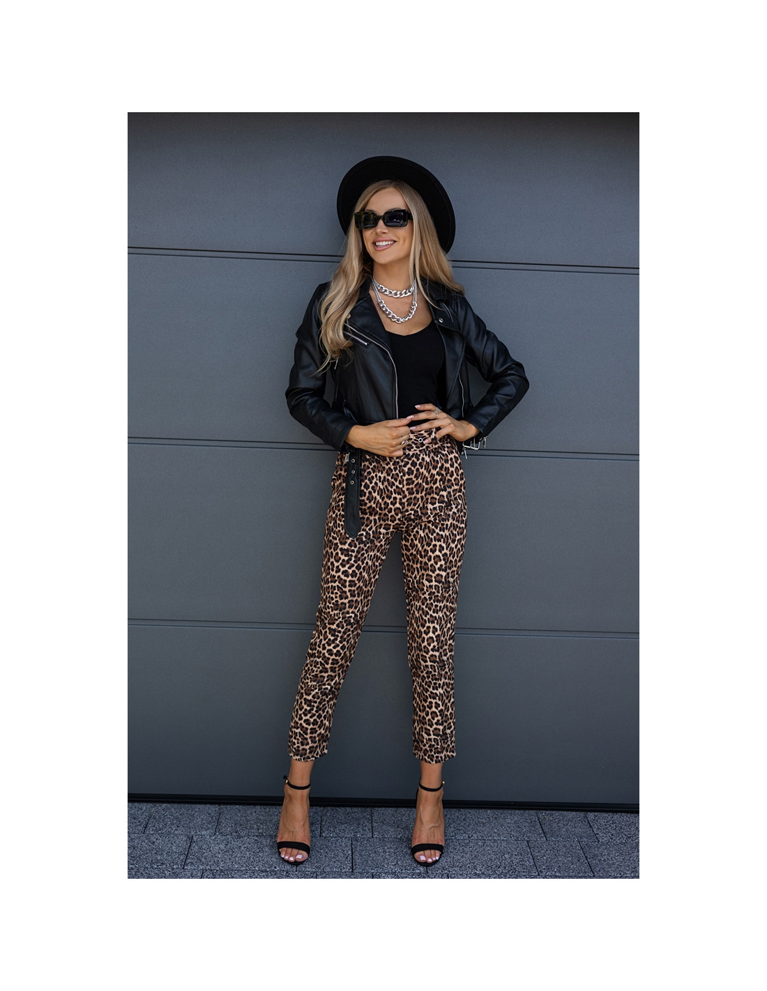 Eleganckie spodnie z panterkowego materiału. W pasie guma i regulowany pasek.