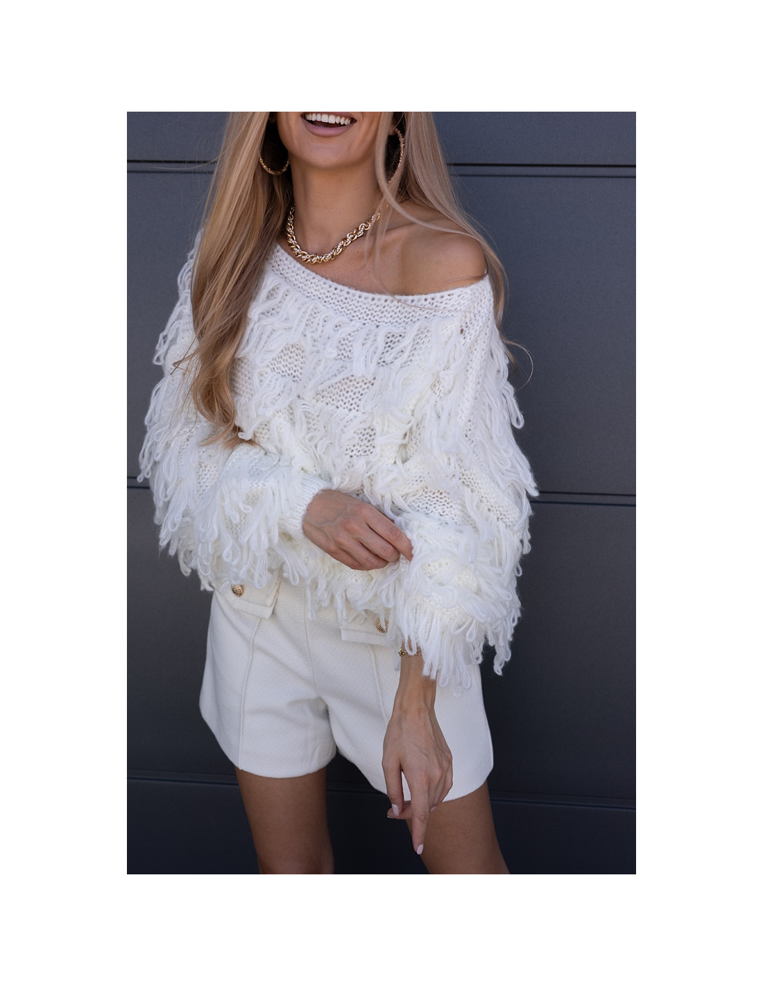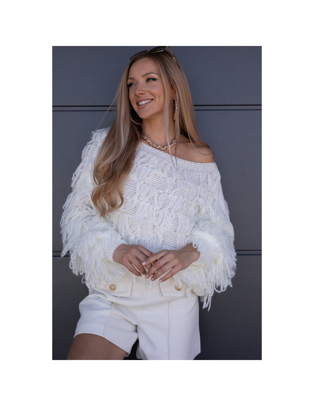 Piękny, owersizowy sweter, rękawki obniżone ze ściągaczami. Odstające frędzelki, ciepły i milutki w dotyku.