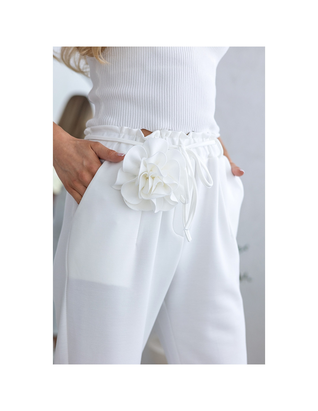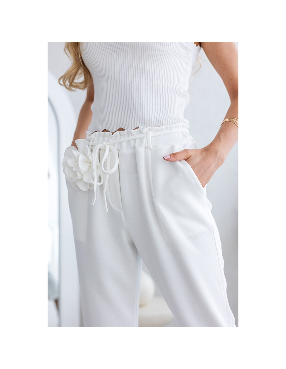 Posiadają gumkę i wiązanie w pasie. Posiadają również kieszenie oraz pasek z Kwiatem.