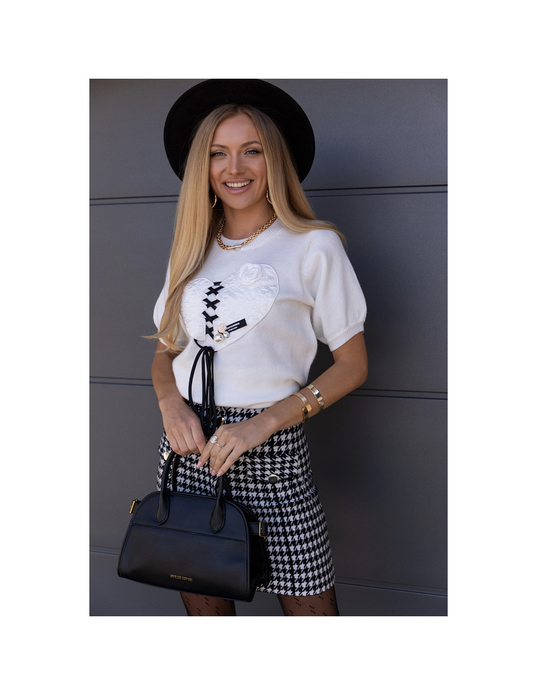 Śliczny Sweterek z krótkim, bufiastym rękawkiem. Na przodzie naszyte serce ze sznurowaniem.