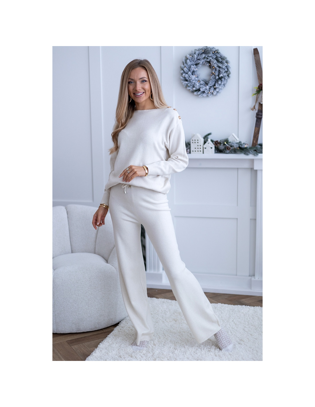 Piękny komplet składający się ze sweterka i luźnych spodni. Sweterkowy materiał, bardzo wygodny i elastyczny. Bluzka o kroju nietoperza, rękawki obniżone. Na znamionach złote guziki. Spodnie Spodnie posiadają wysoki stan i gumę w pasie, wiązane w pasie.
