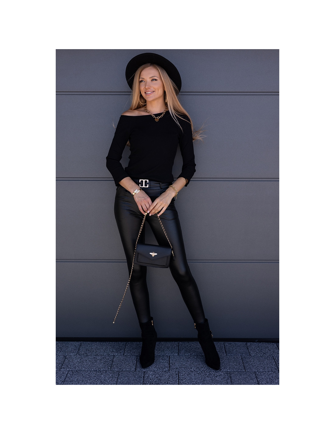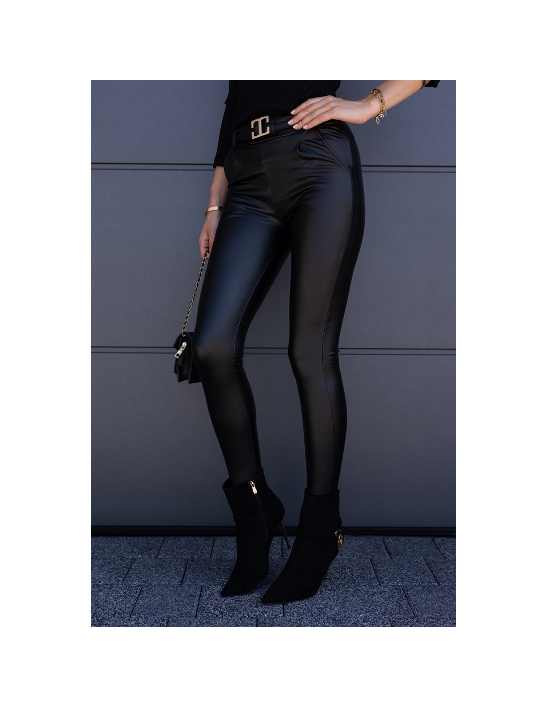 Matowe spodnie z eko skaju, posiadają kieszenie. W pasie guma i złota klamra.