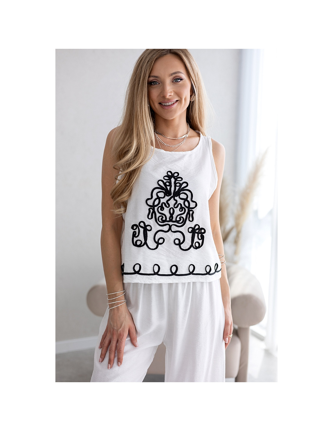 Elegancki komplet z obszyciami i zdobieniami w kolorze białym. Luźna bluzka oraz poszerzane spodnie na gumie. Spodnie posiadają kieszonki.