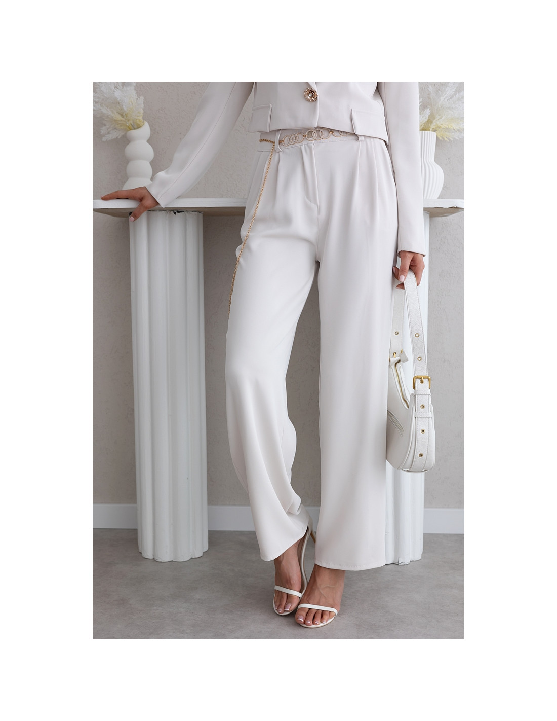 Piękny garnitur na co dzień jak i na specjalne okazje. Marynarka do pasa, zapinana broszką w formie kwiatka. Spodnie szerokie, z zaszewkami. Posiadają kieszonki.