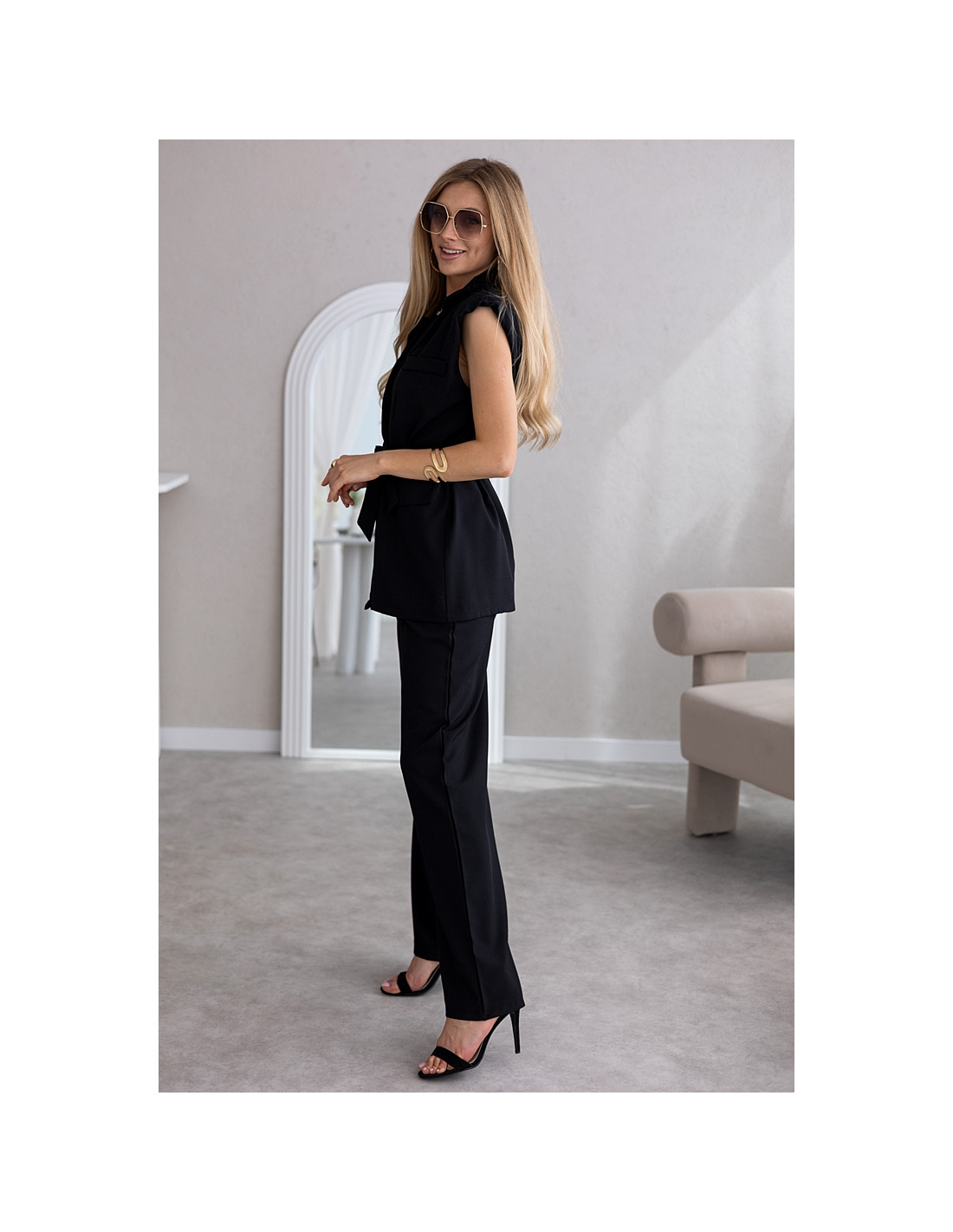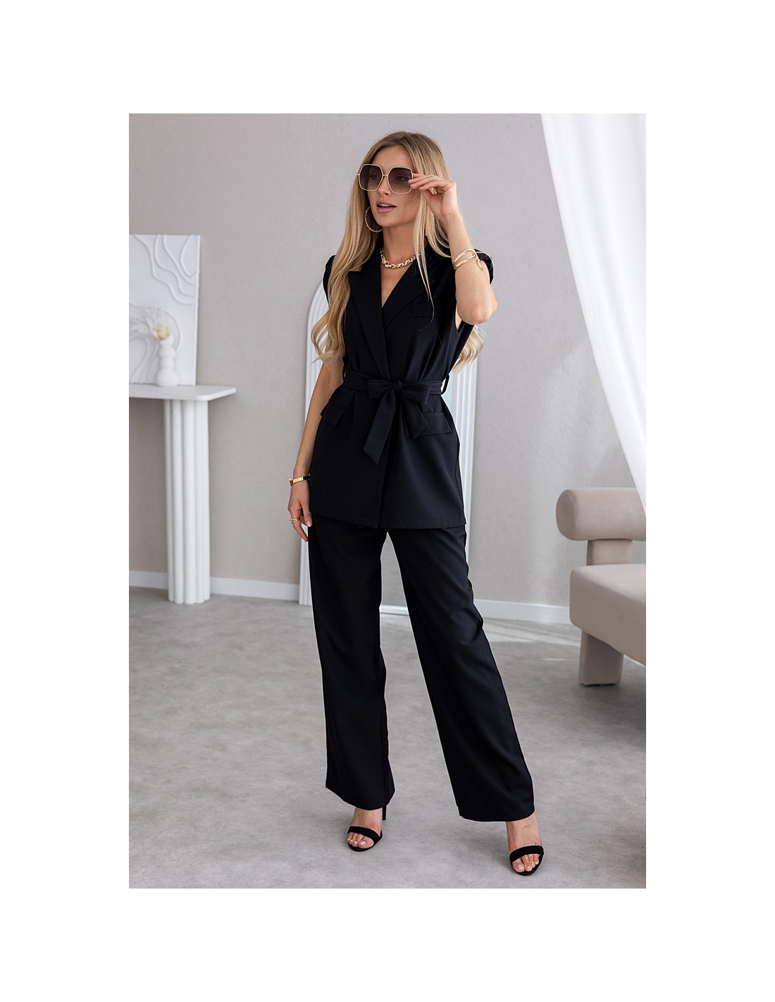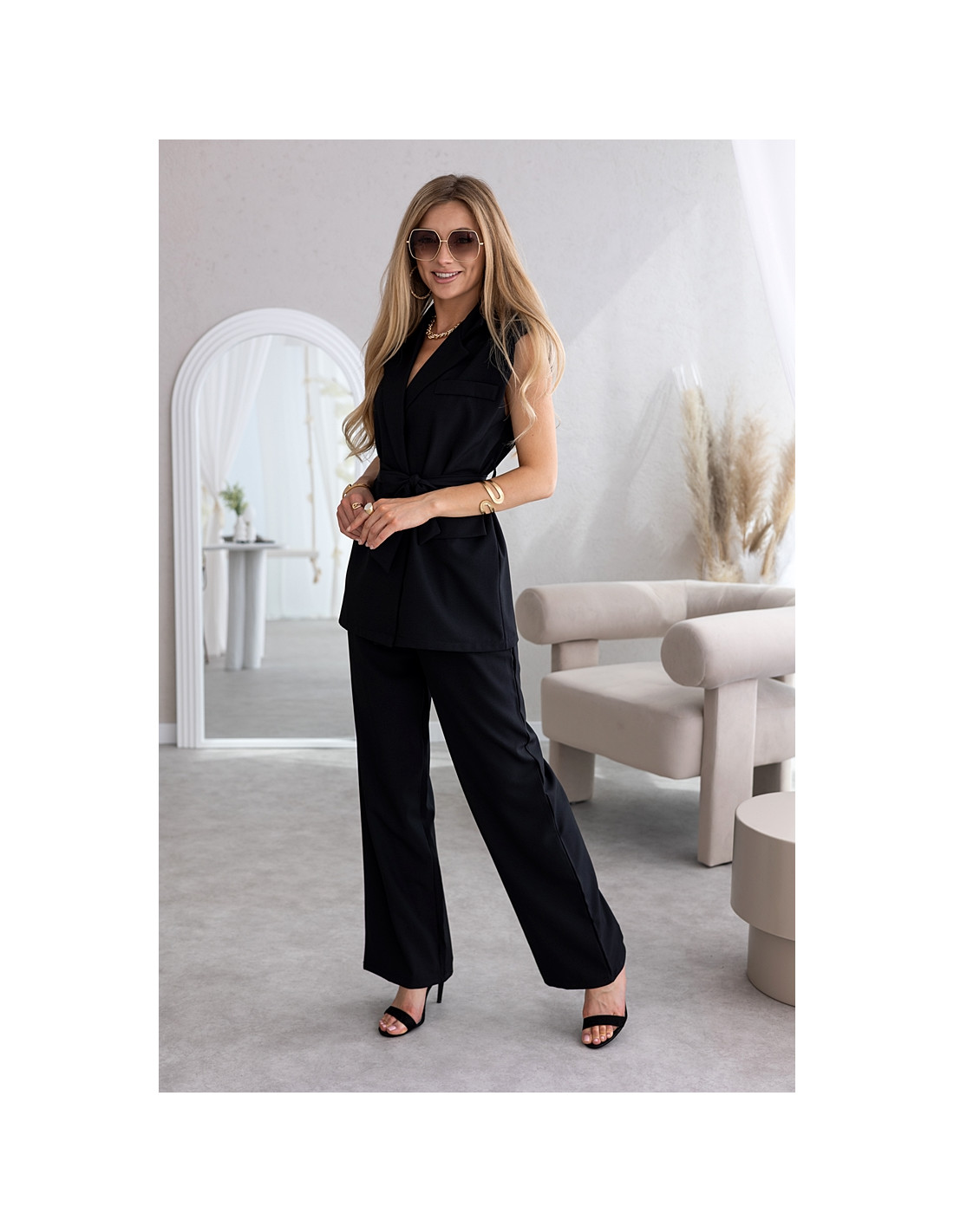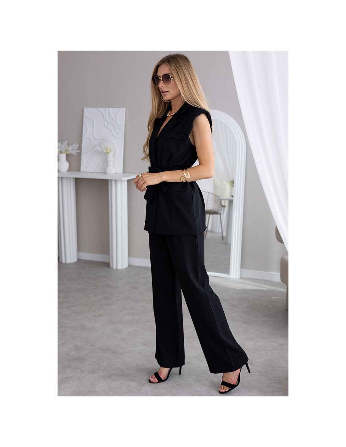 Elegancki komplet składający się z wiązanej kamizelki z poduszkami na ramionach oraz luźnych spodni.