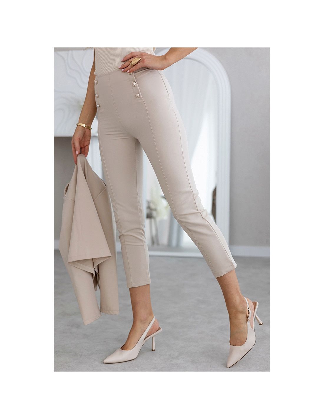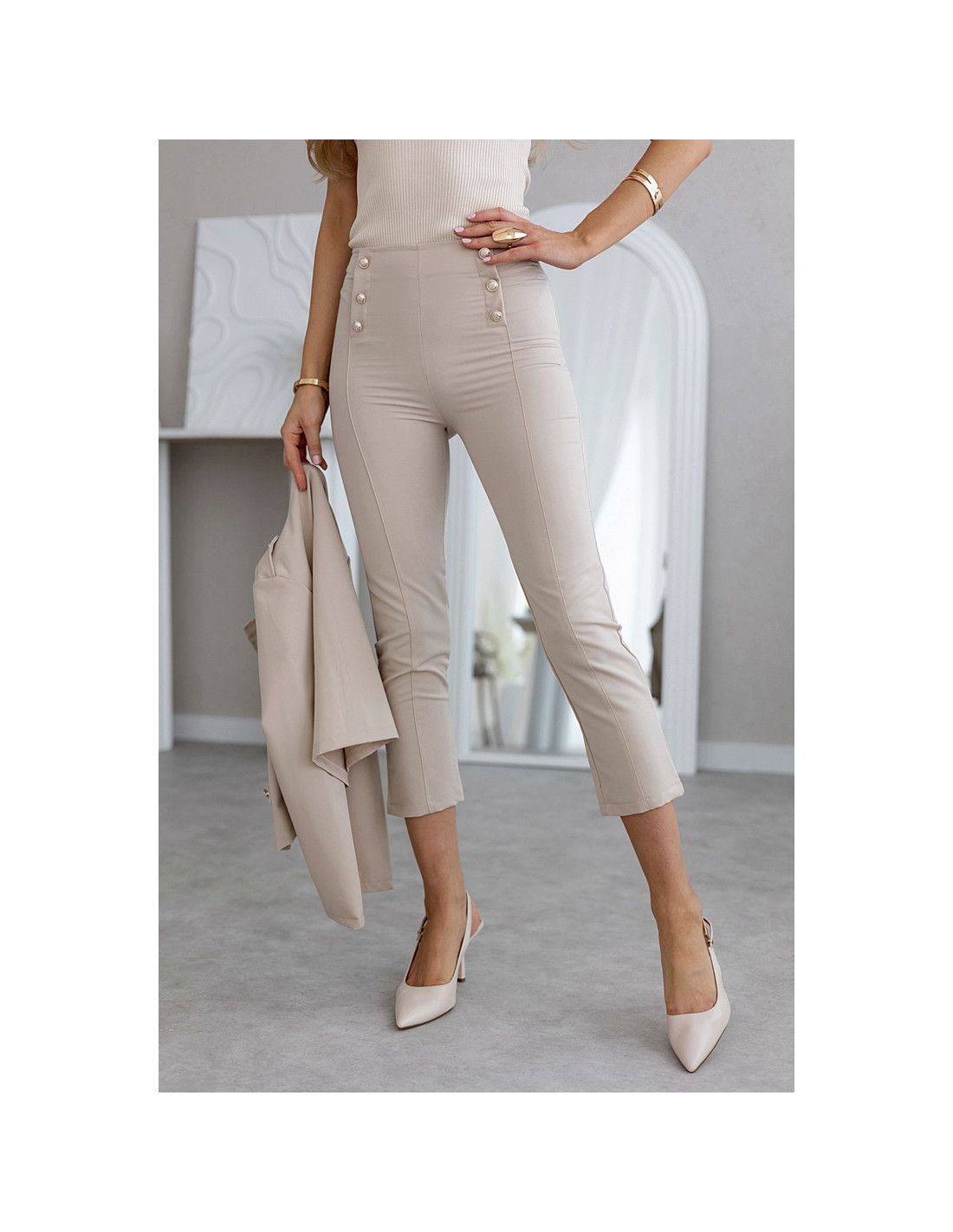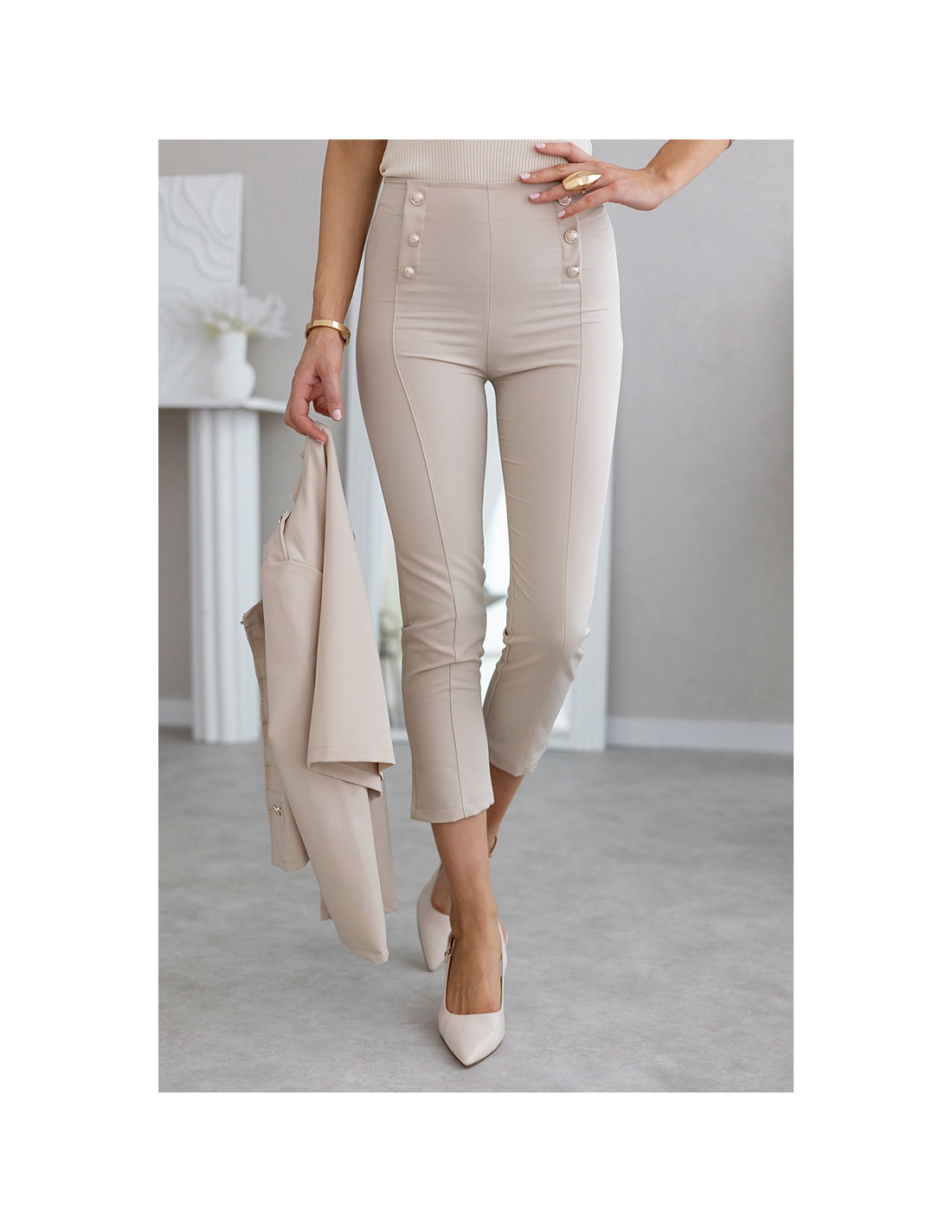 Eleganckie cygaretki 7/8 z wysokim stanem i ozdobnymi złotymi guzikami. Posiadają przeszycie przez środek. Zapinanie na kryty zamek z boku.