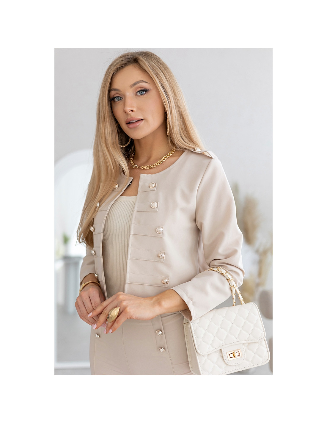 Piękny żakiet ze złotymi guzikami, które zdobią przód. Zapinany na haftkę. Długie rękawki. Polecamy w zestawie ze spodniami Reem.