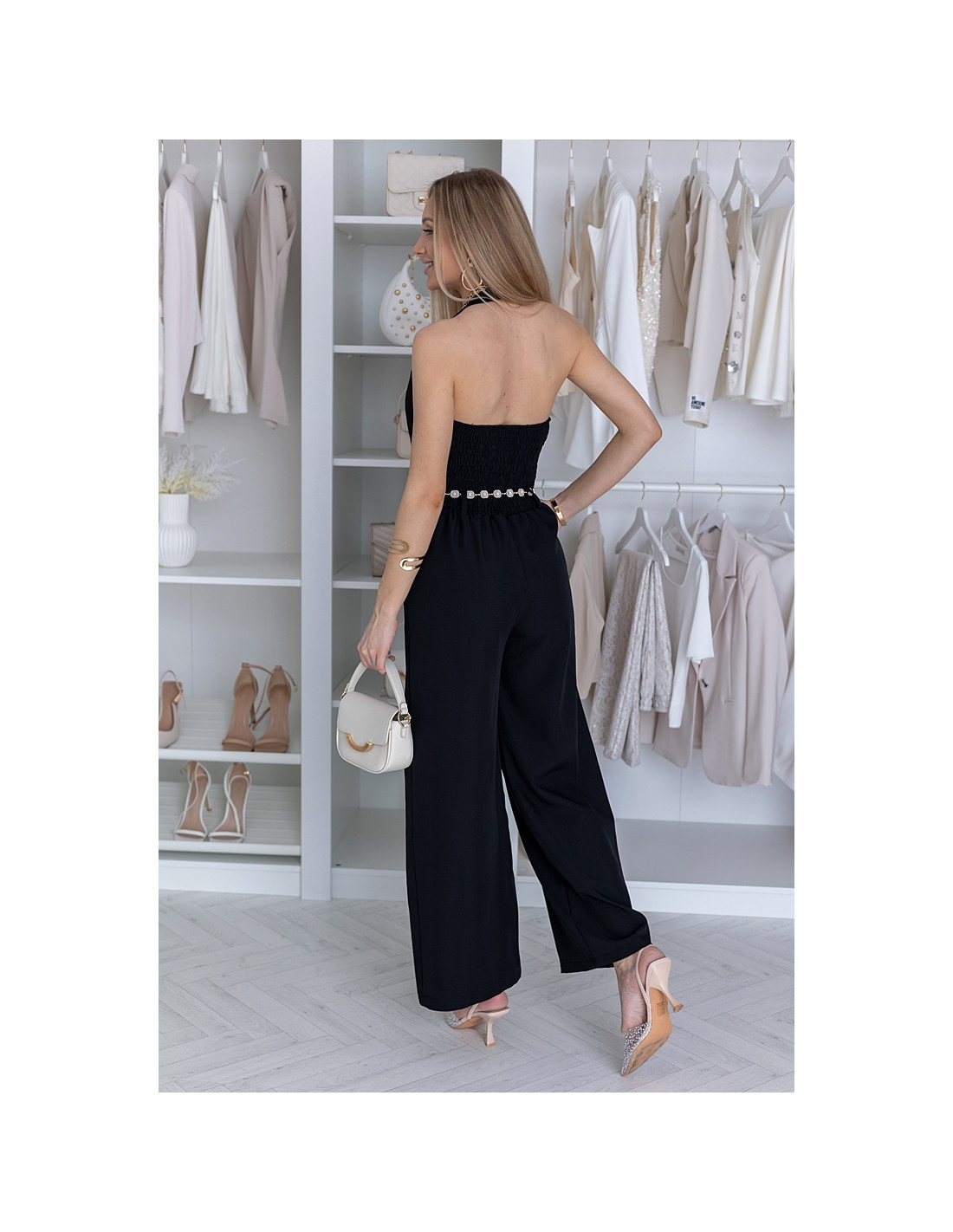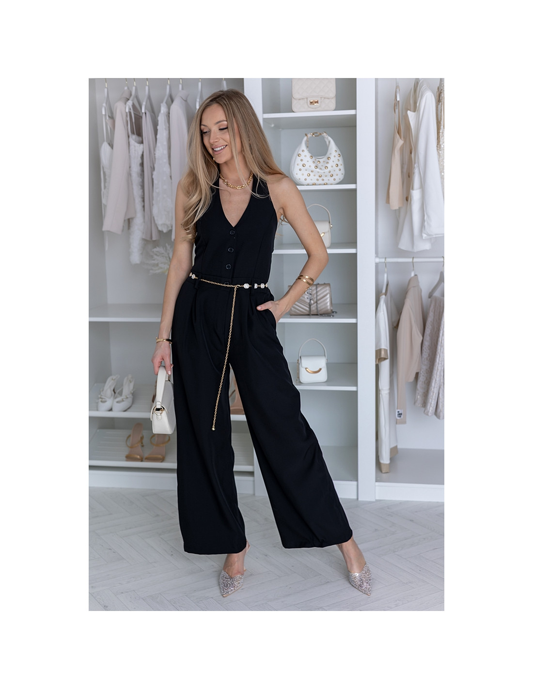 Wyjątkowy kombinezon z górą zakładaną na szyję. Dekolt zapinany na guziczki. Z tyłu guma.