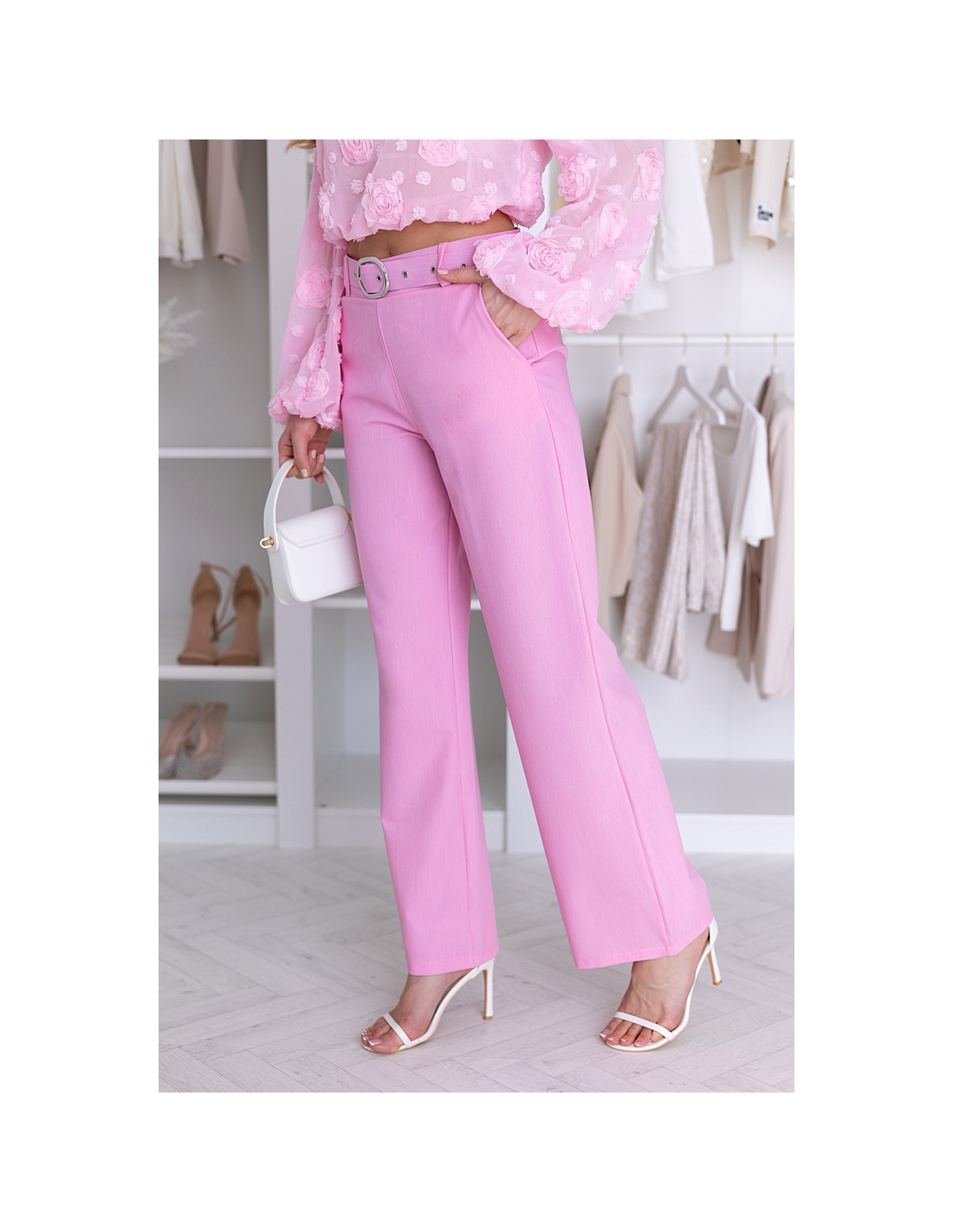 Eleganckie, długie spodnie z poszerzanymi nogawkami. Spodnie posiadają kieszenie, wszytą gumę z tyłu oraz pasek.