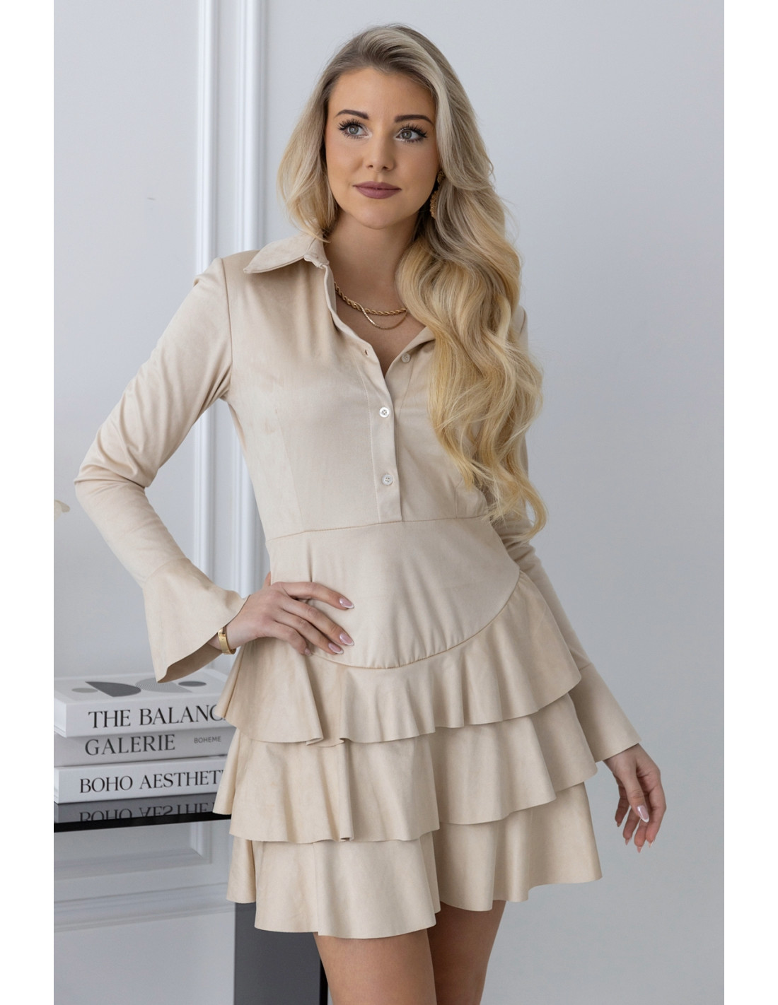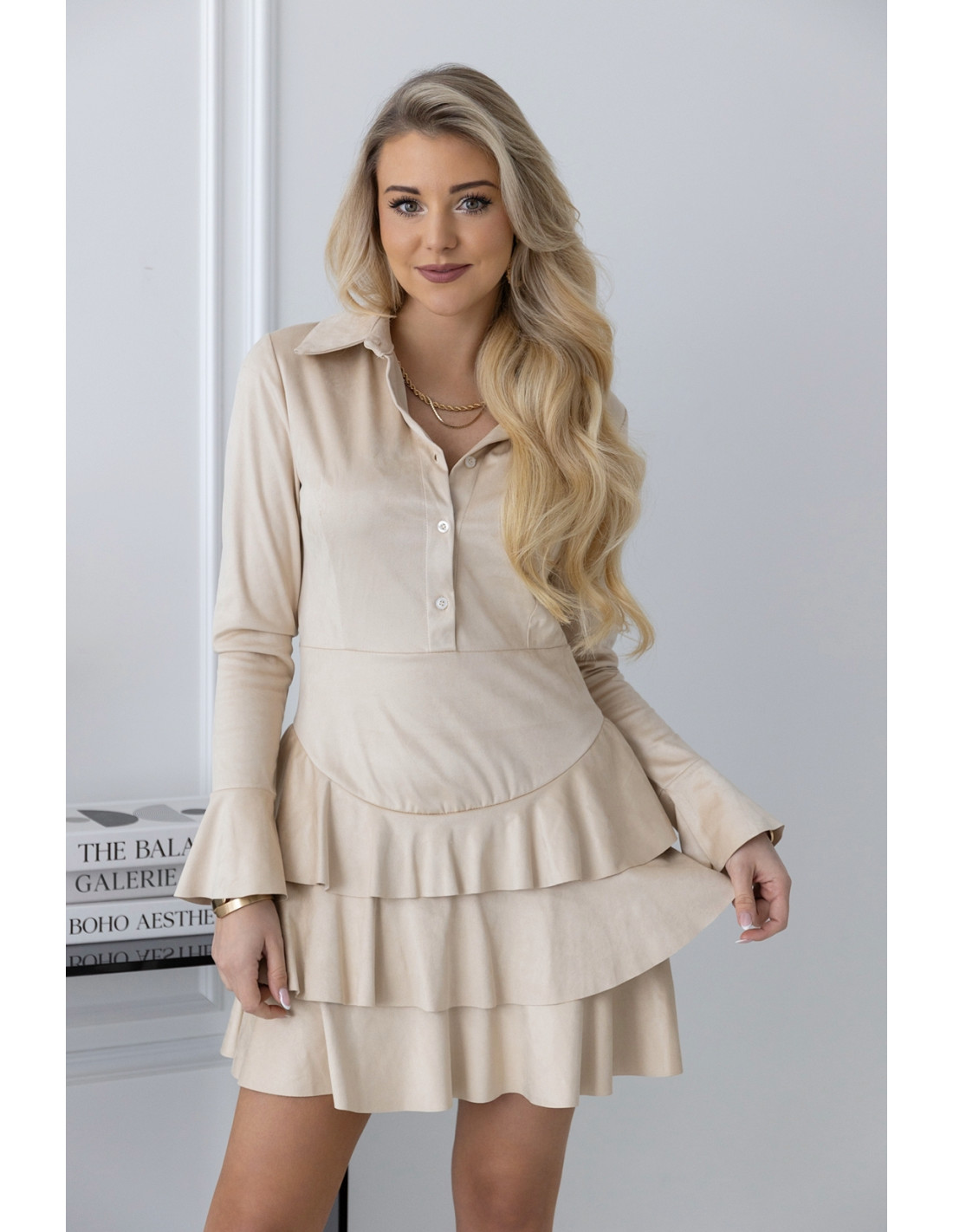 Sukienka zamszowa a'la szmizjerka beż. Sukienka zamszowa szmizjerka z kołnierzykiem o kroju, który fantastycznie układa się na ciele. Sukienka zapinana jest w górnej części na guziki,w dolnej części 3 falbany.Dzięki długości mini nogi są wyeksponowane a dopasowana góra z długimi rękawami  subtelnie zakrywa ciało. Możesz ją z powodzeniem założyć na randkę oraz przyjęcie okolicznościowe
