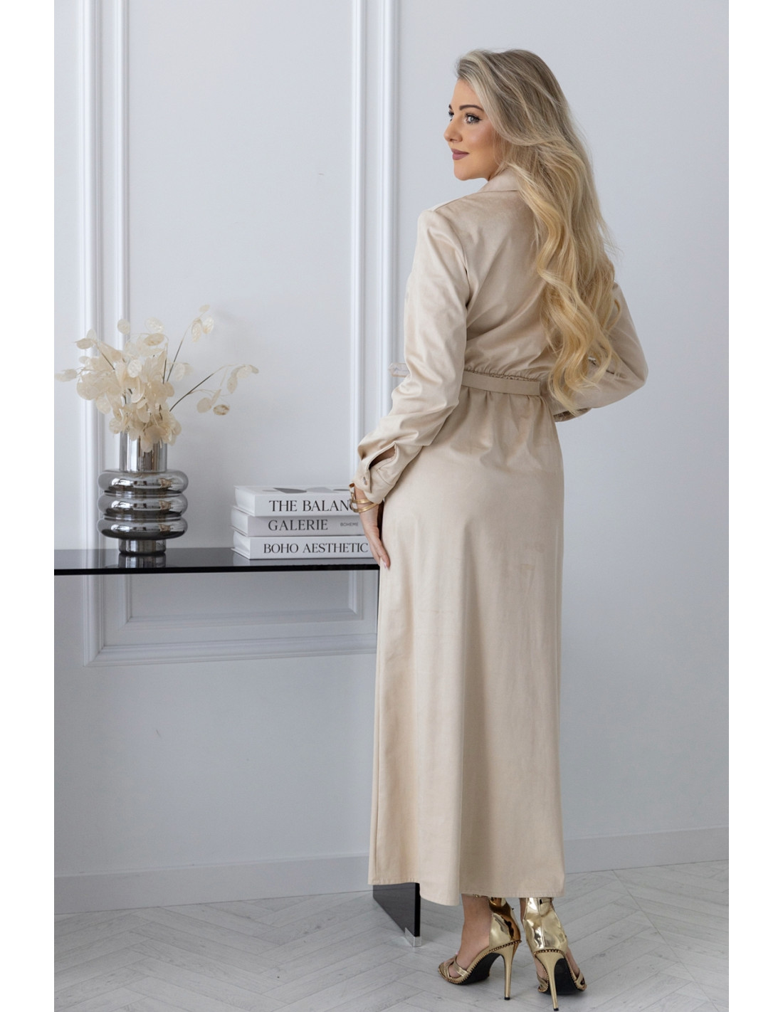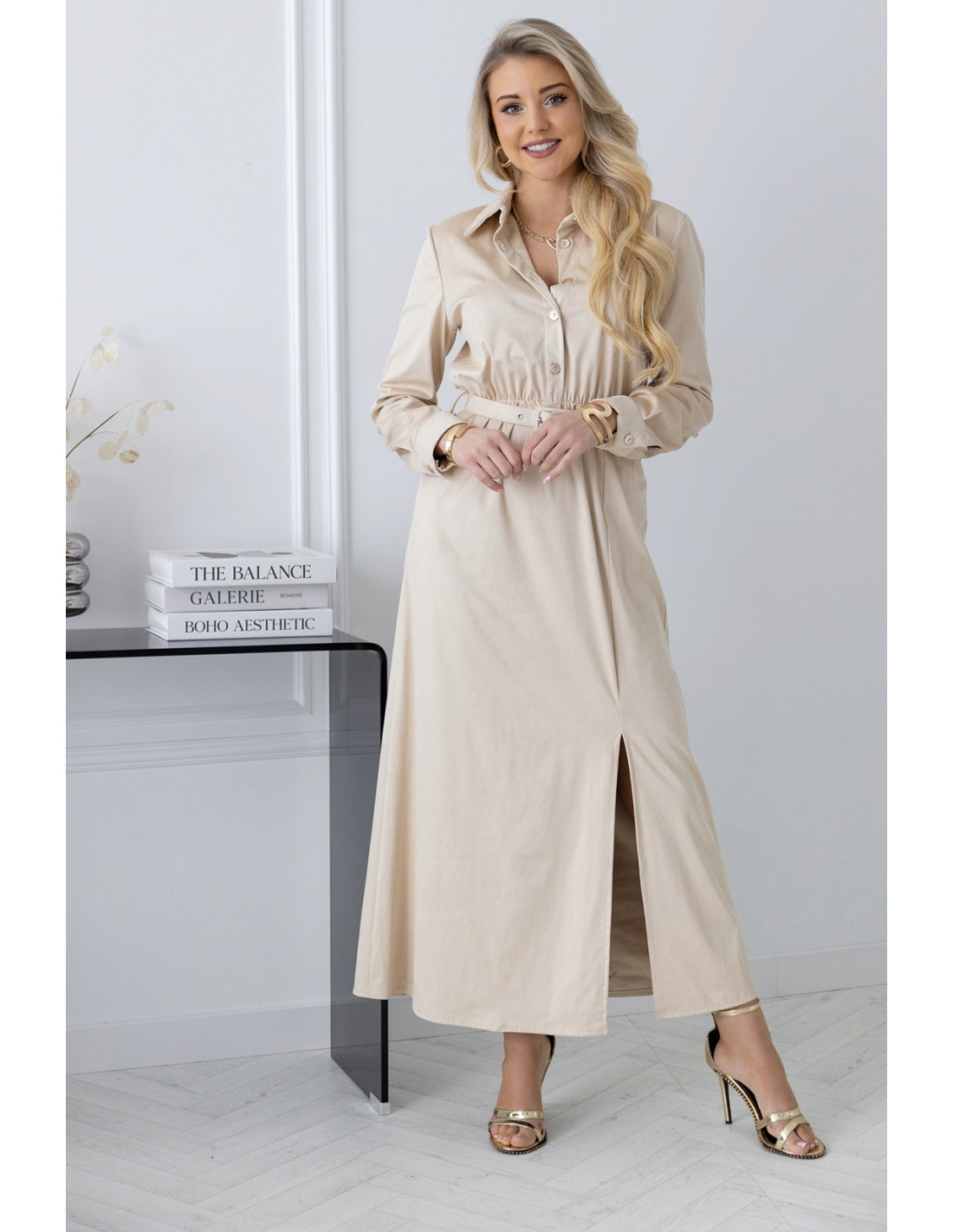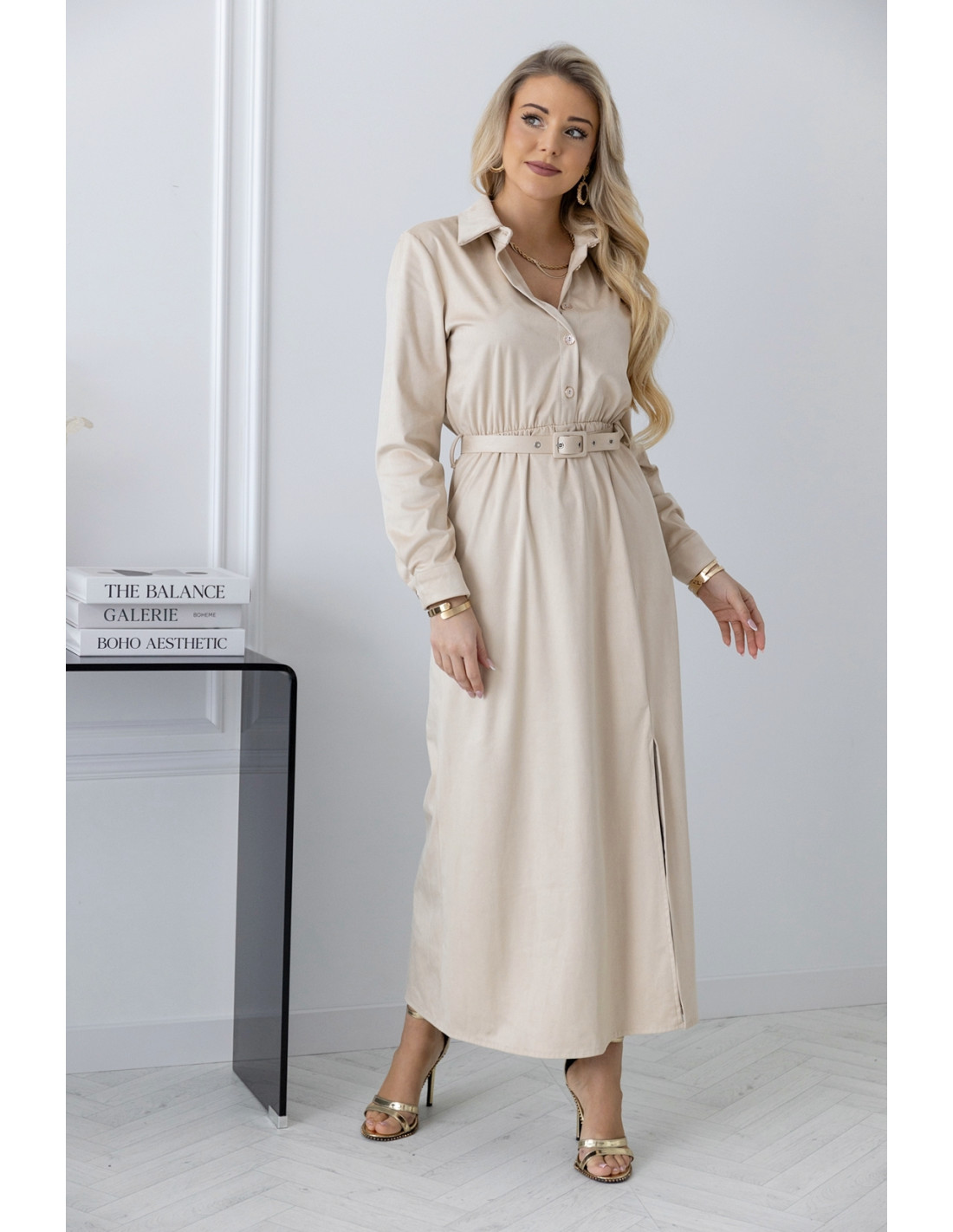 Sukienka zamszowa a'la szmizjerka beż. Sukienka zamszowa szmizjerka z kołnierzykiem o kroju, który fantastycznie układa się na ciele. Sukienka zapinana jest w górnej części na guziki.W pasie ozdobny pasek, który podkreśla talię oraz gumka. Dzięki długości midi wyszczupla sylwetkę,rozcięcie od kolana dodaje pikanterii a dopasowana góra z długimi rękawami subtelnie zakrywa ciało