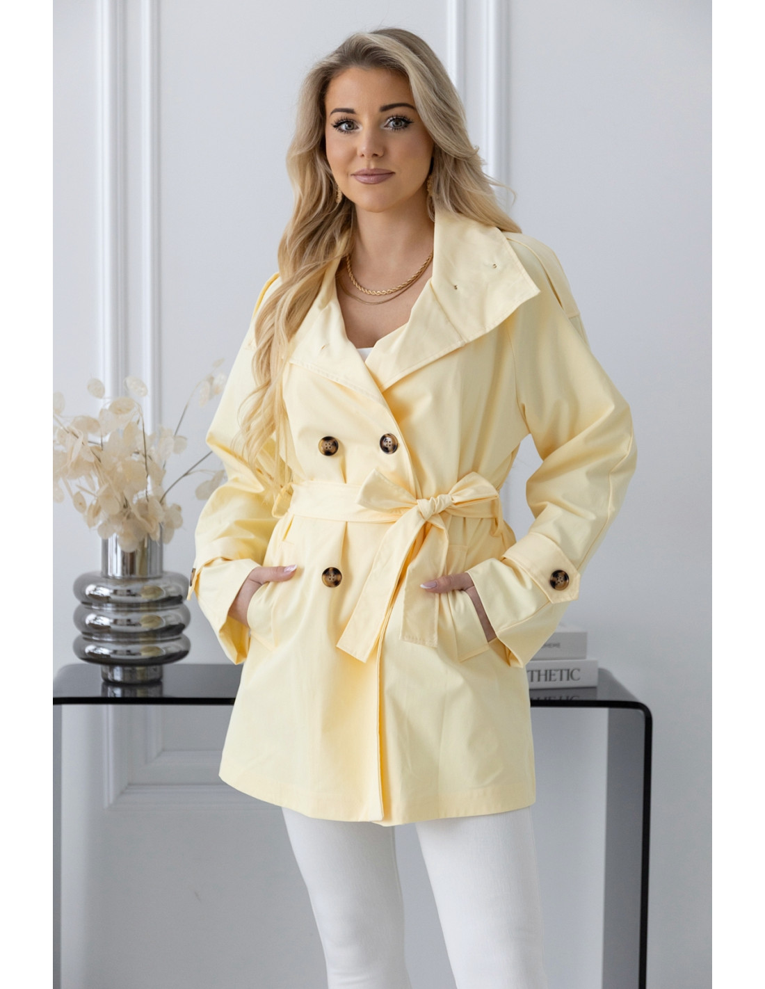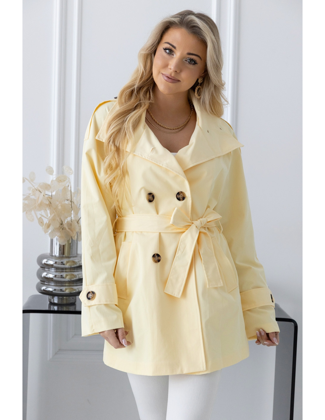 Klasyczny dwurzędowy płaszcz damski typu prochowiec to praktyczny, świetnie sprawdzający się w nadchodzące dni fason.Podszewka gładka, w kolorze materiału. Płaszcz ten jest dopracowany, posiada wiele ozdobnych dodatków jak pagony z guzikami na ramionach, ozdobne paski na rękawach służące do sciągania. Dodatkowo talie podkreślamy paskiem .