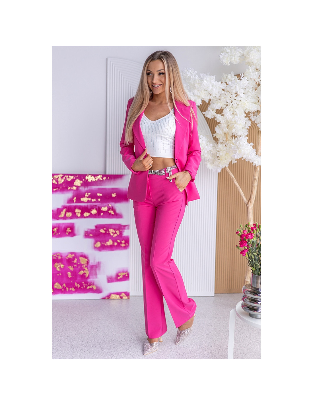 Elegancki Komplet, składający się z przedłużanego żakietu oraz spodni o kroju dzwonów.