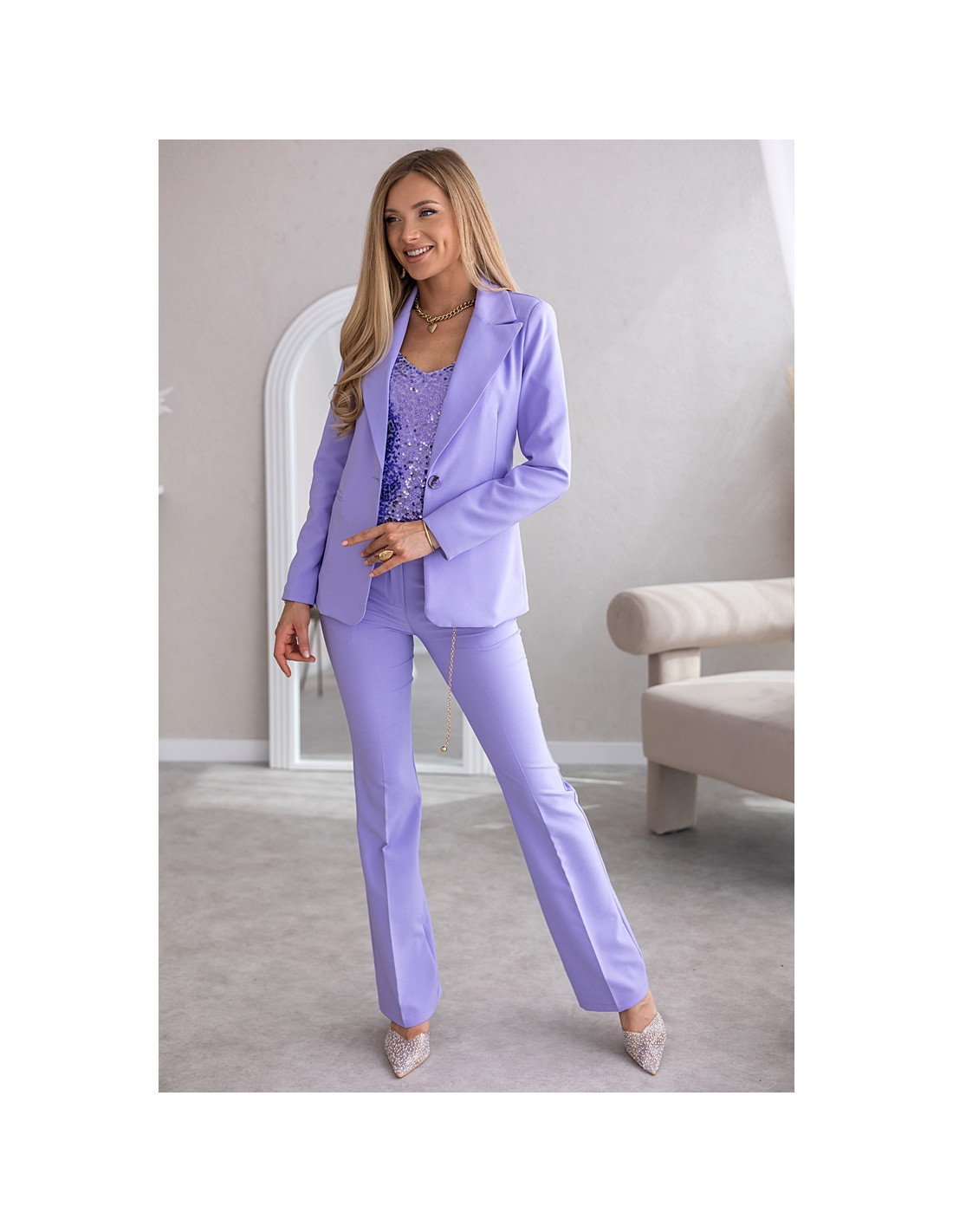 Elegancki Komplet, składający się z przedłużanego żakietu oraz spodni o kroju dzwonów.