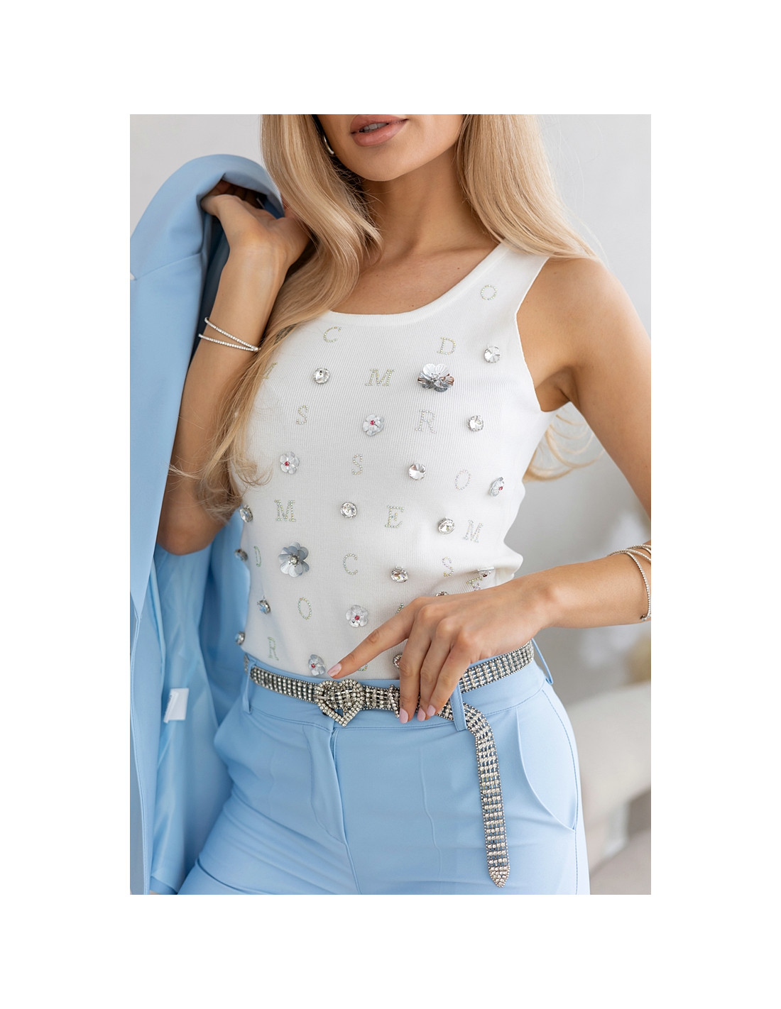 Zdobiony Top na ramiączkach. Z ze srebrnymi literkami i kwiatuszkami na przodzie.