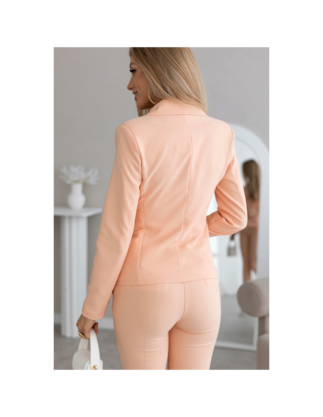 Żakiet zapinany na jeden guzik od zewnątrz i jeden od wewnątrz, taliowany, długi rękaw. Na ramionach wszyte poduszki, dzięki czemu dobrze się układa.